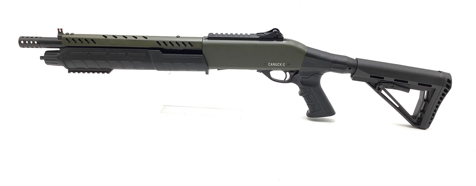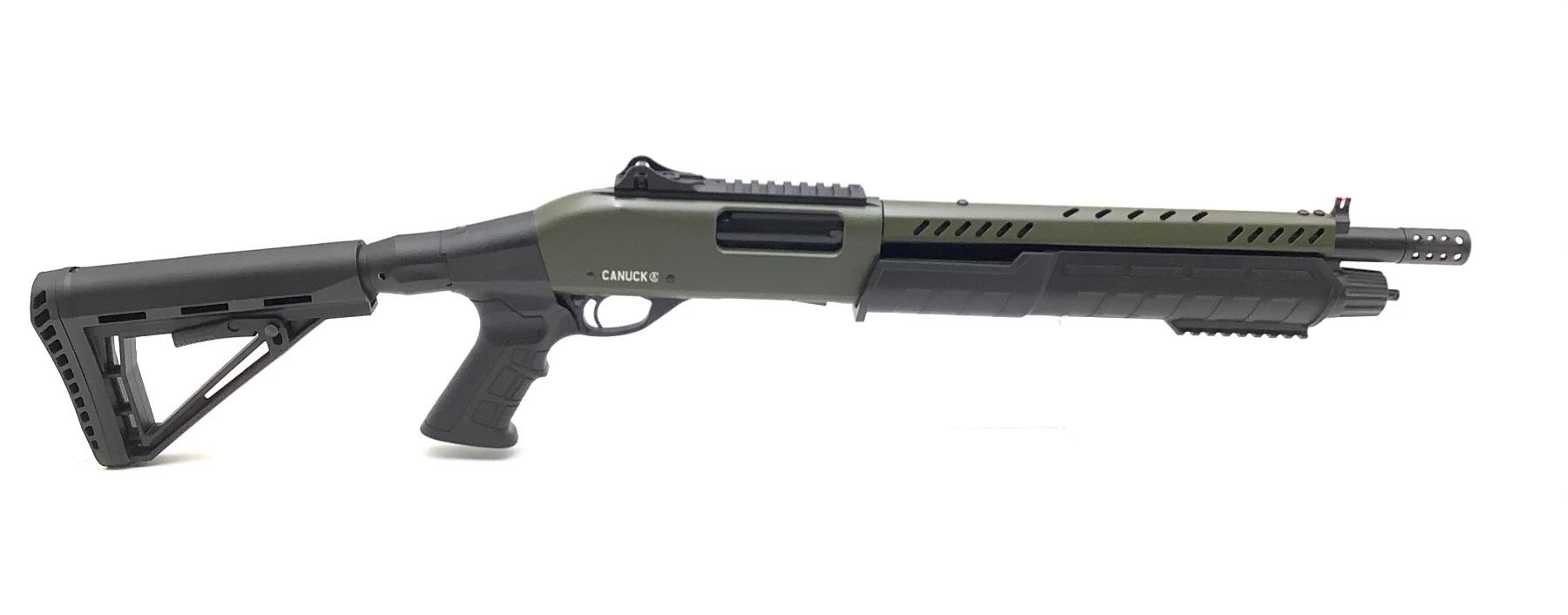Canuck Commander 12Ga Pump Action Shotgun 3" Chamber 14" Barrel Green, New. Fiber optic front sight, adjustable rear sight. Rail mounted on receiver, adjustable rear stock. Comes with interchangeable chokes. This is a non-restricted firearm.