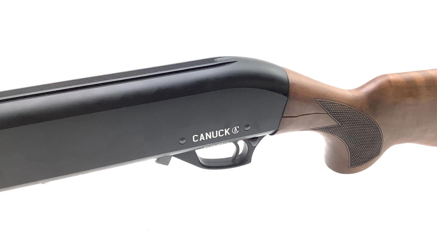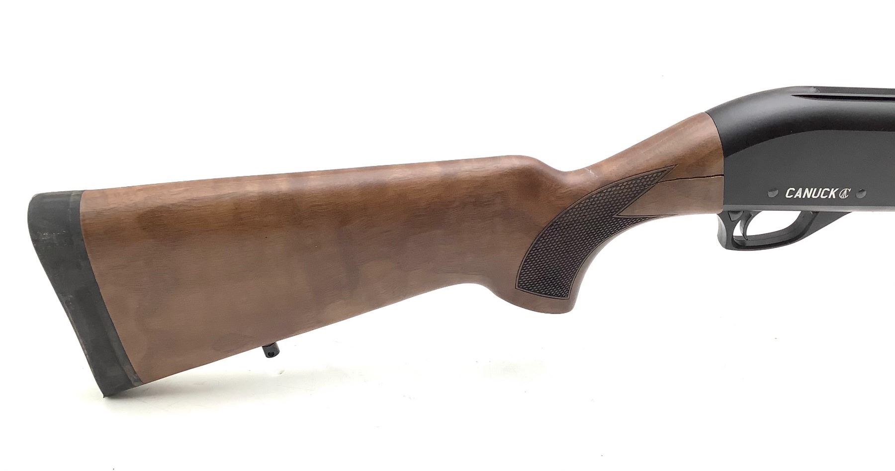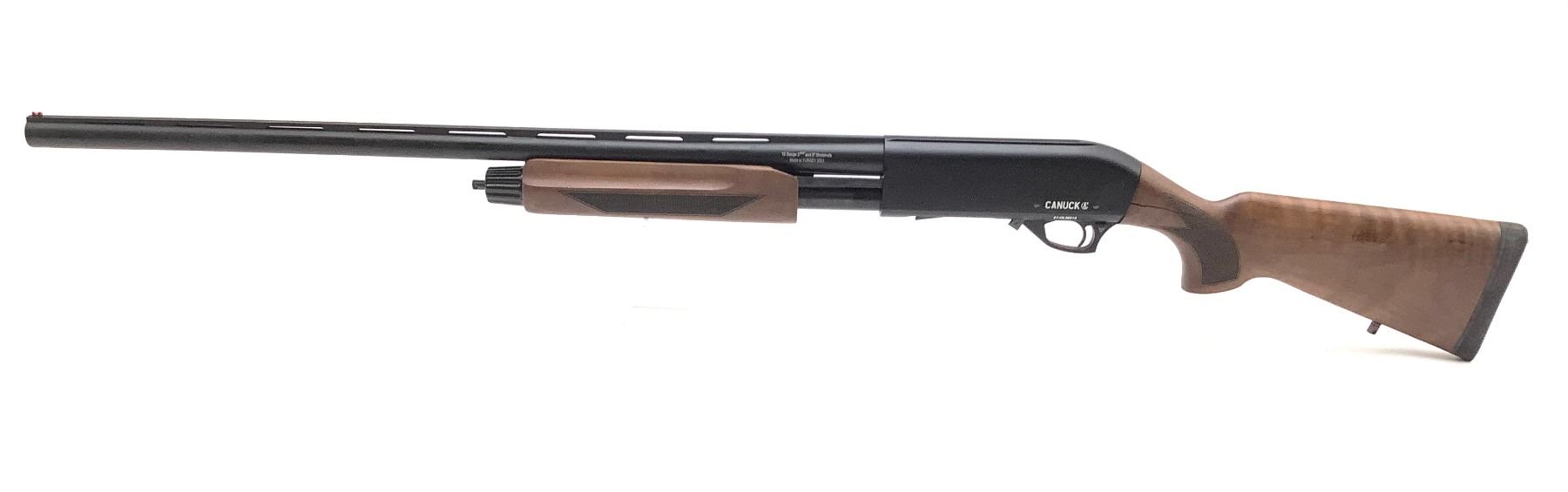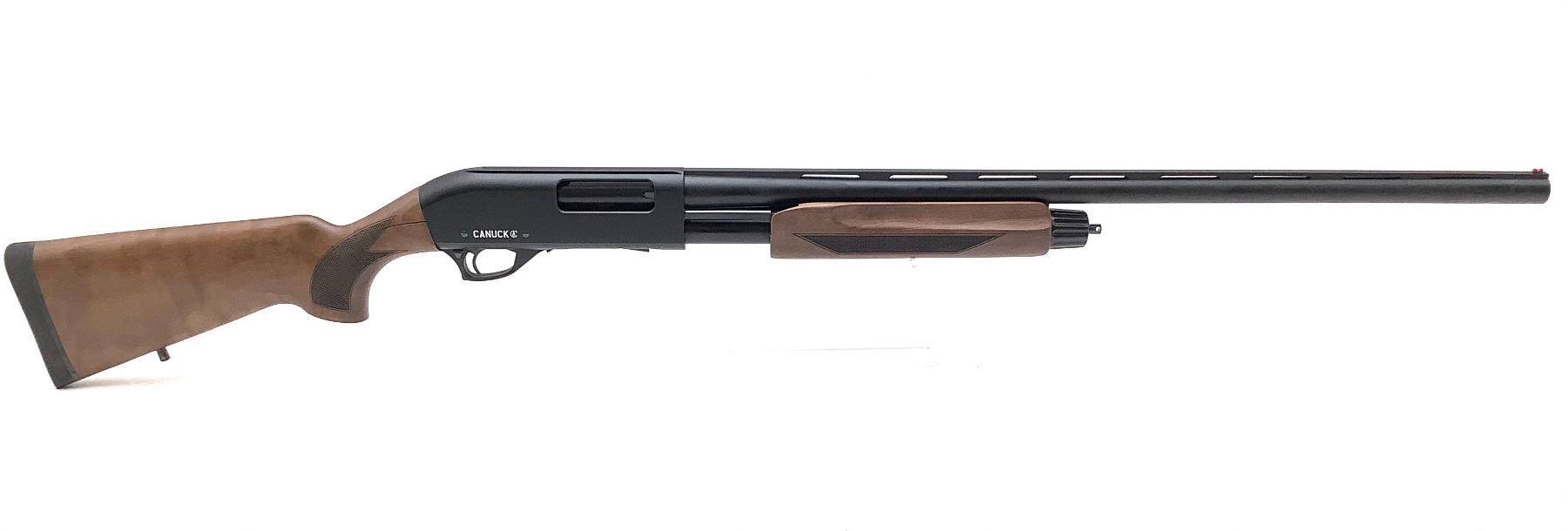 Canuck Pioneer 12Ga Pump Action Shotgun 28" Vent Rib Barrel Walnut Stock, Display Gun. Rear stock is cracked on both sides. Vent rib with fiber optic front sight. Comes with interchangeable chokes. This is a non-restricted firearm.