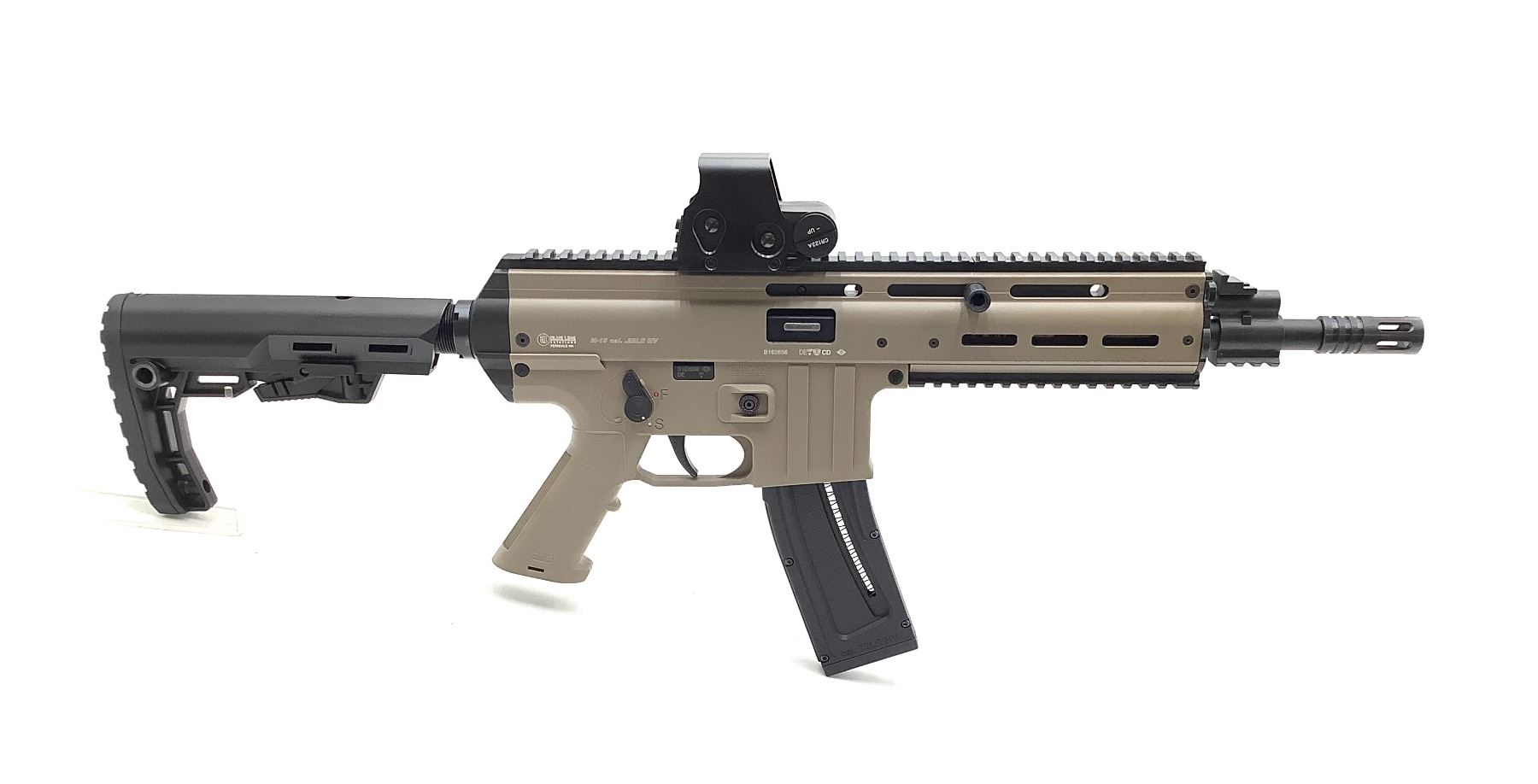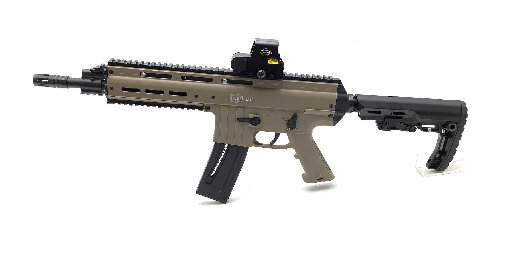 Mauser M-15 Semi-Auto Rifle 22LR 12" Barrel With Red Dot Tan Stock, New. Includes flip up sights, detachable magazine. Comes in hard plastic case. This is a non-restricted firearm.