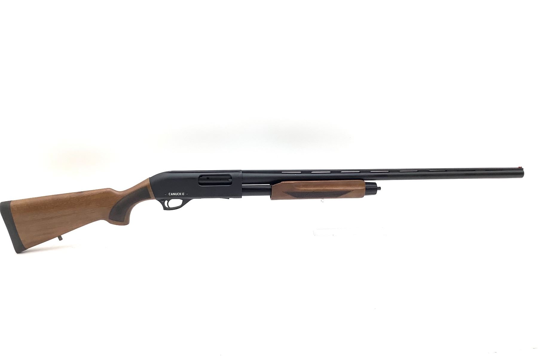 Canuck Pioneer 12Ga Pump Action Shotgun 28" Vent Rib Barrel Walnut Stock, New. Vent rib with fiber optic front sight. Comes with interchangeable chokes. This is a non-restricted firearm.