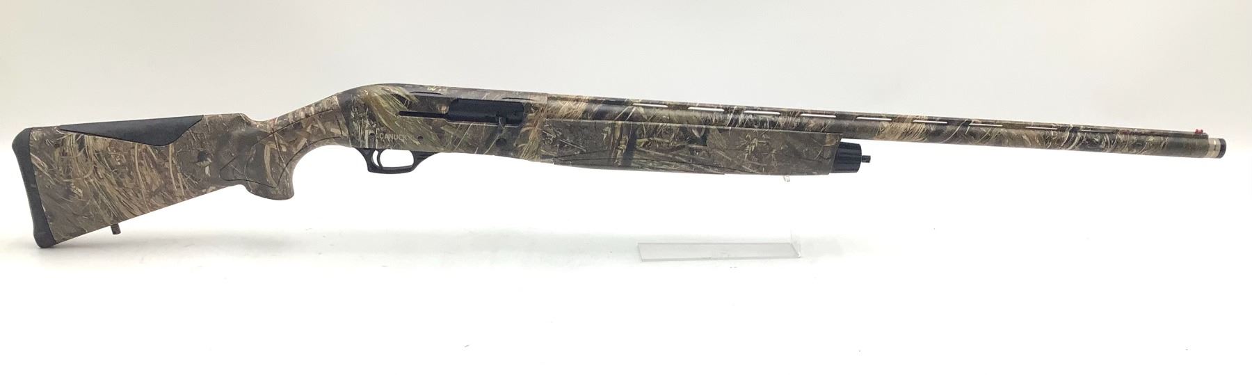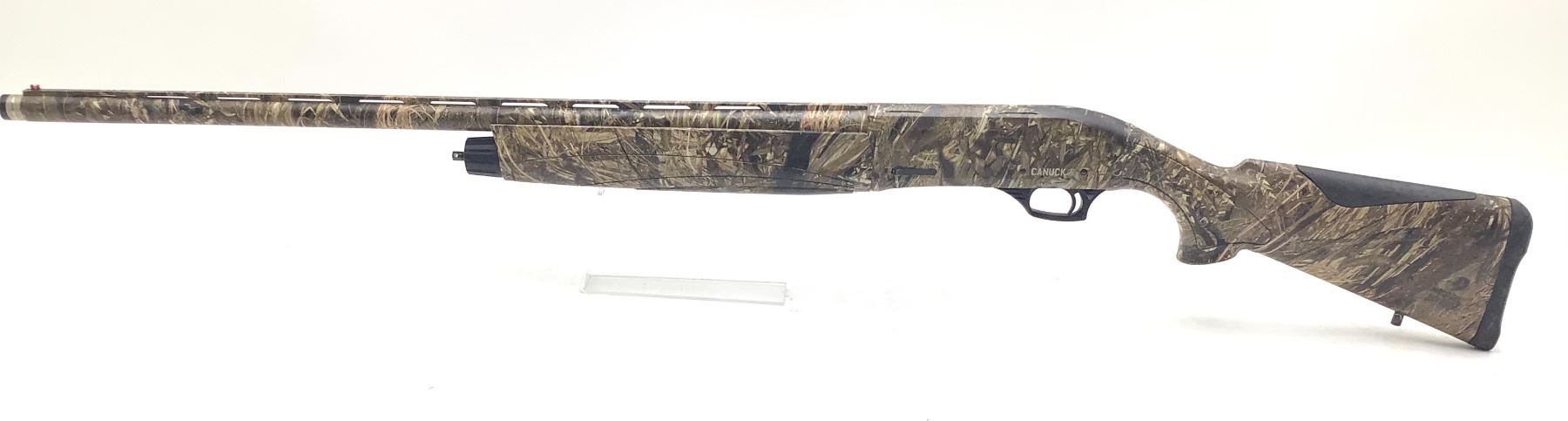 Canuck Hunter Semi Auto Shotgun 12Ga 3" Chamber 28" Vent Rib Barrel Mossy Oak Camo. Fiber optic front sight, rubber butt pad. Removable choke. This is a non-restricted firearm.