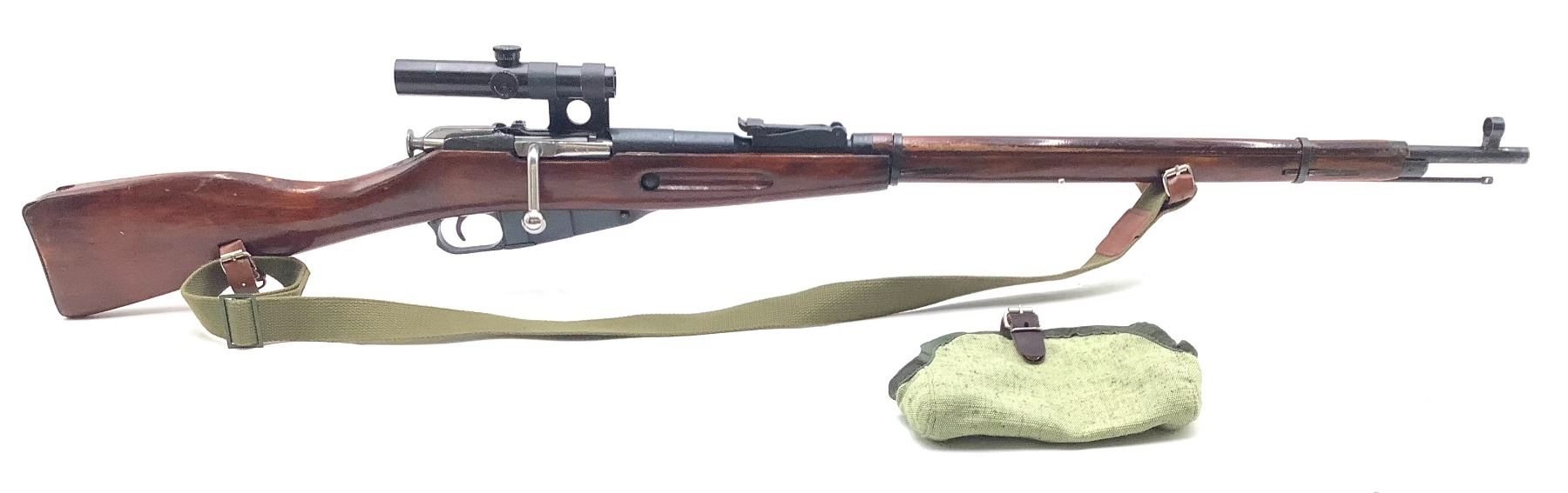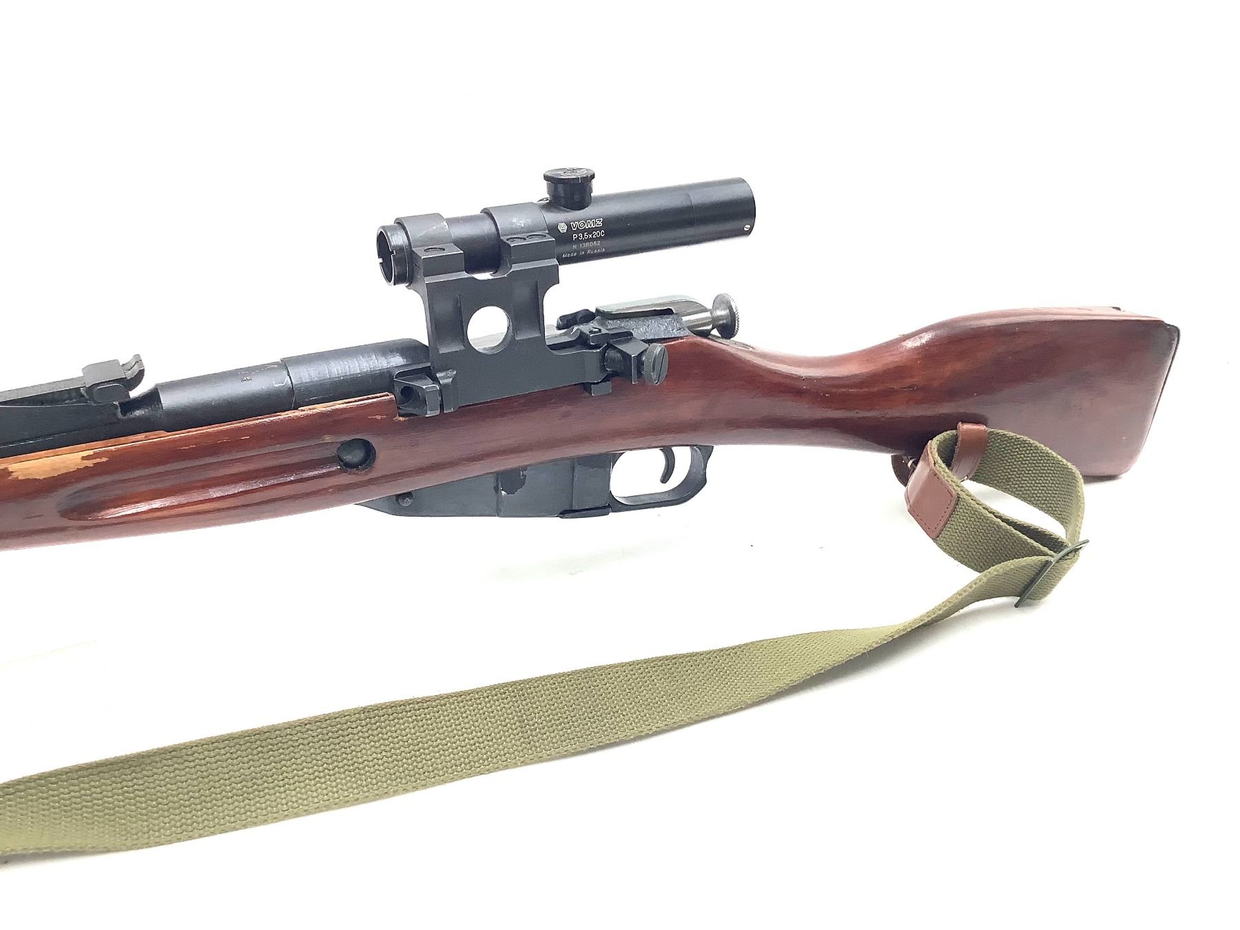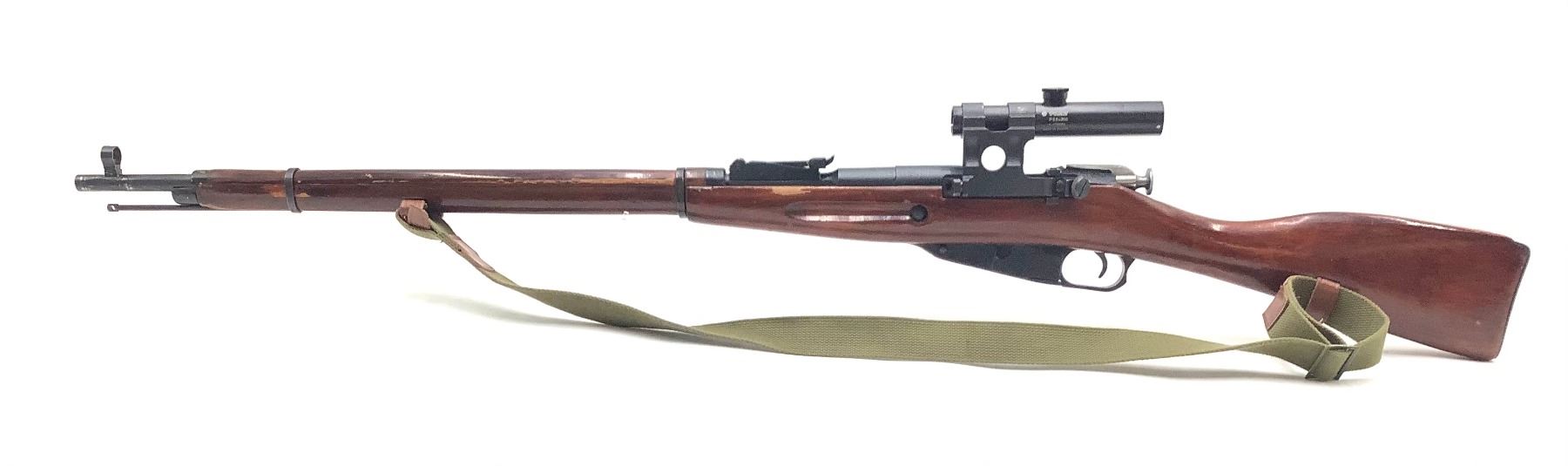 A 1942 Izhevsk-manufactured Mosin-Nagant 1891/30 bolt-action sniper rifle. 29" barrel with frosted bore chambered in 7.62x54R. Post-Second World War 3.5X PU scope manufactured by VOMZ. Internal 5-round magazine, issued sling, canvas scope cover. Matching serial numbers on bolt and receiver.