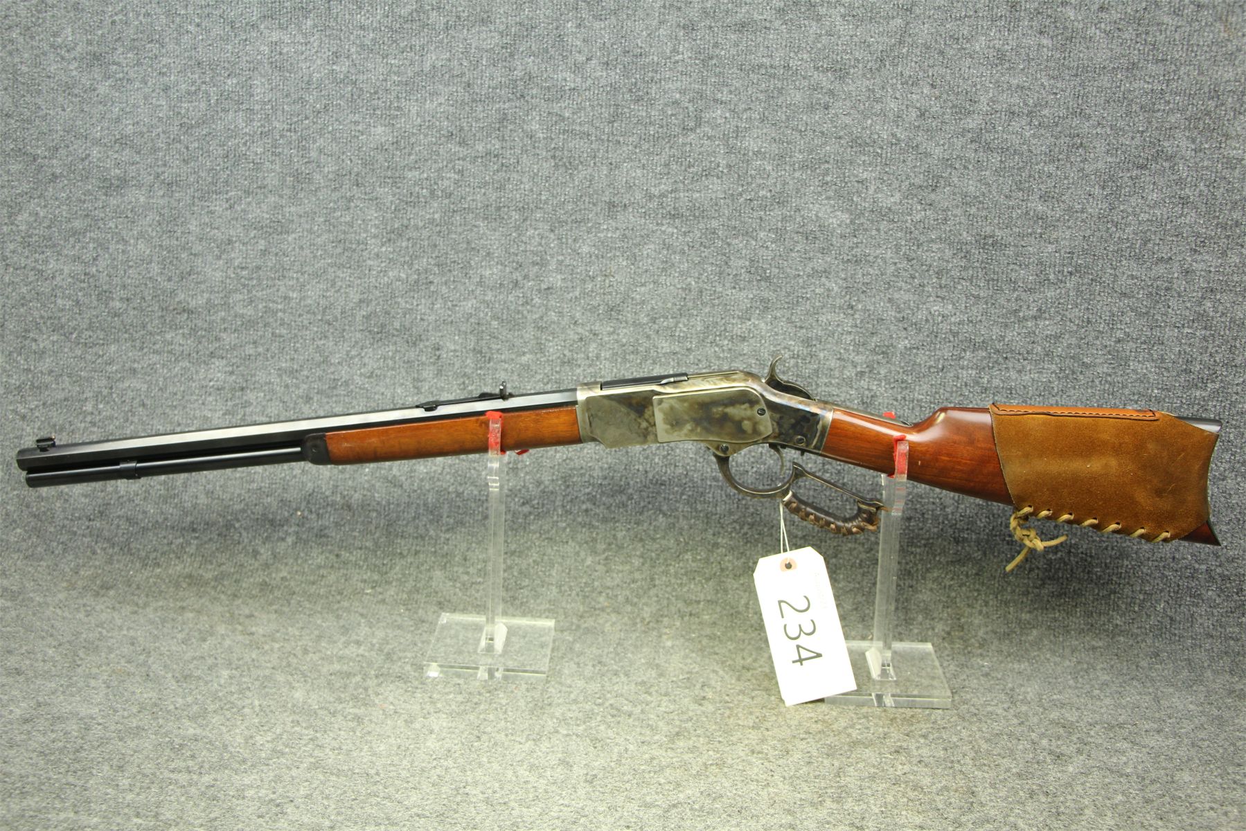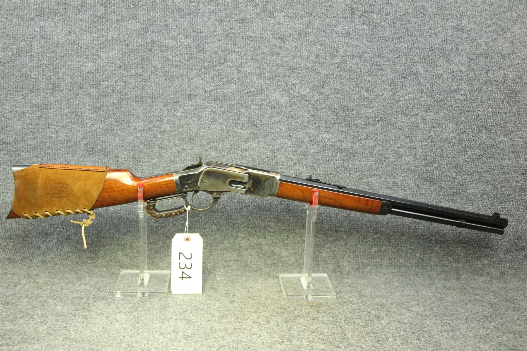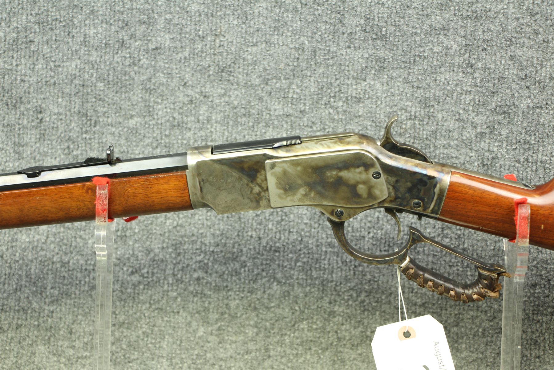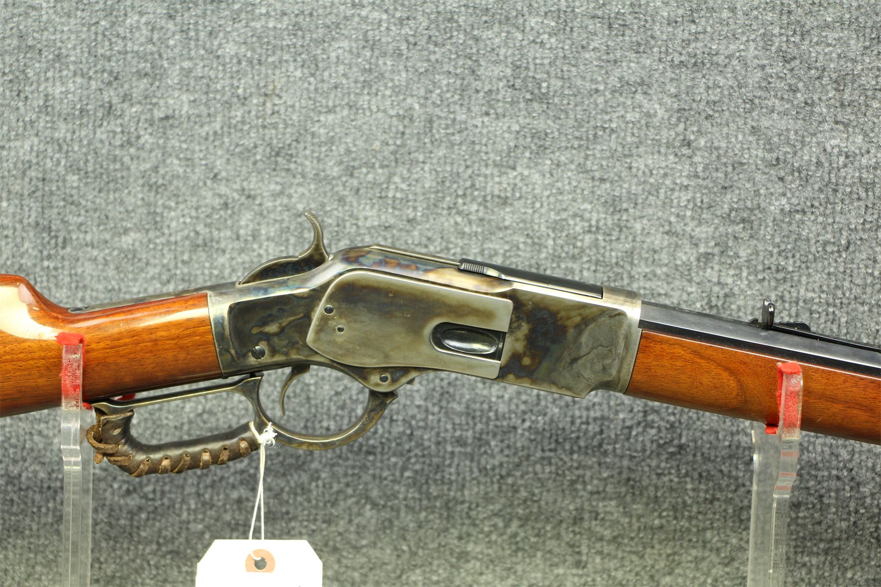 Great representation. Case hardening throughout. Leather comfort on the hoop and buttstock. Octagonal barrel. Tiniest of handling marks only.