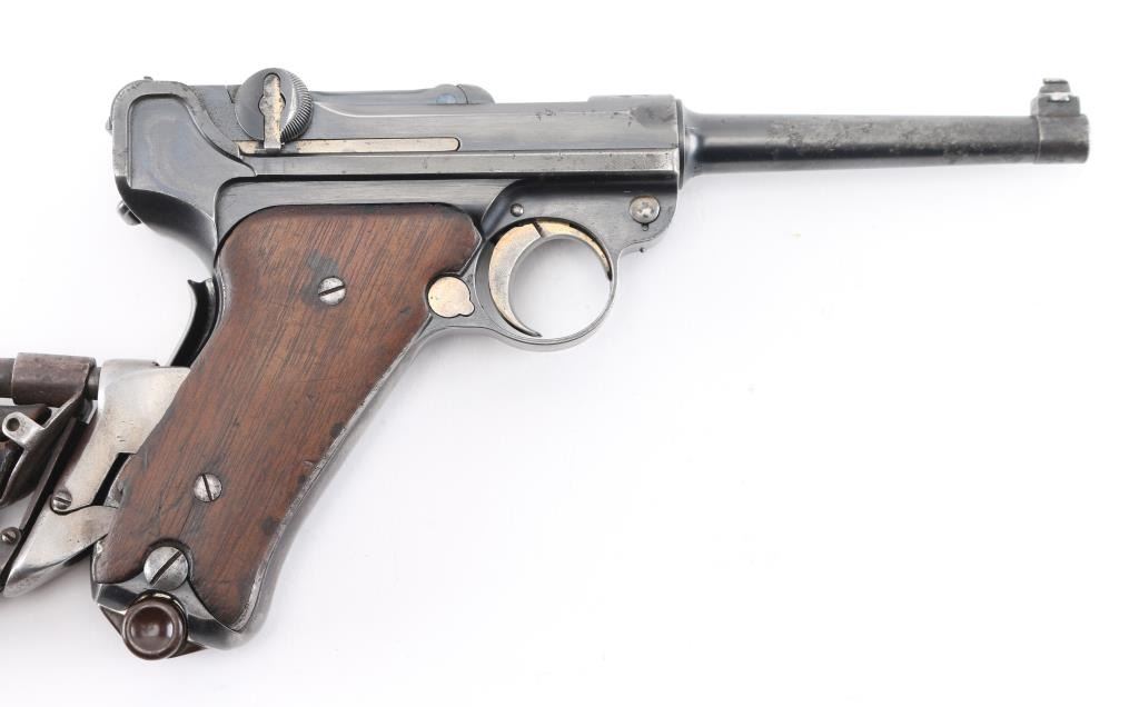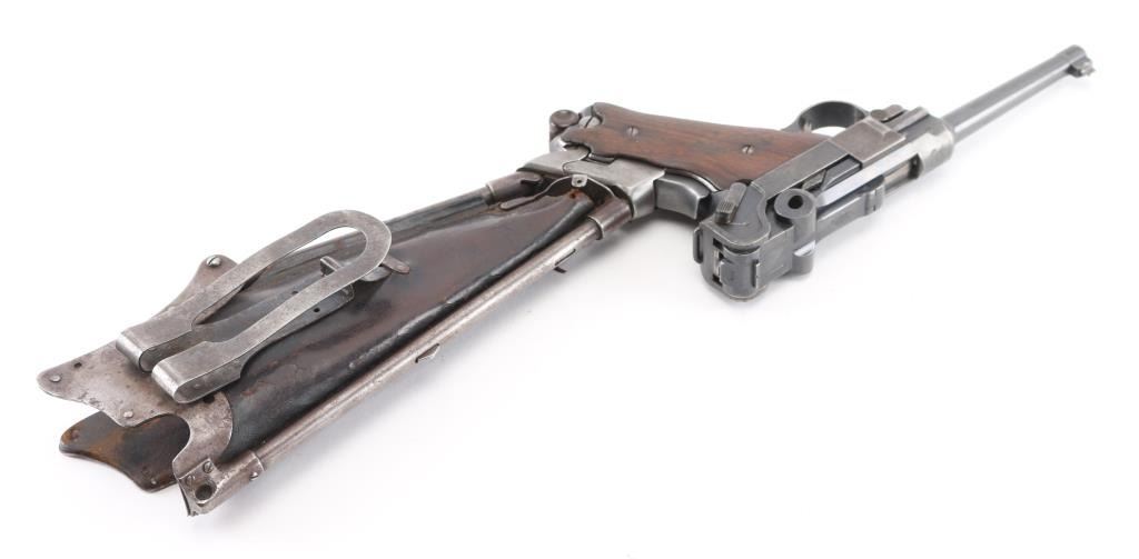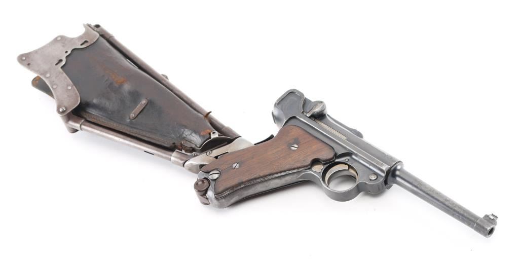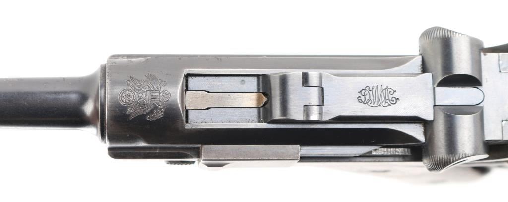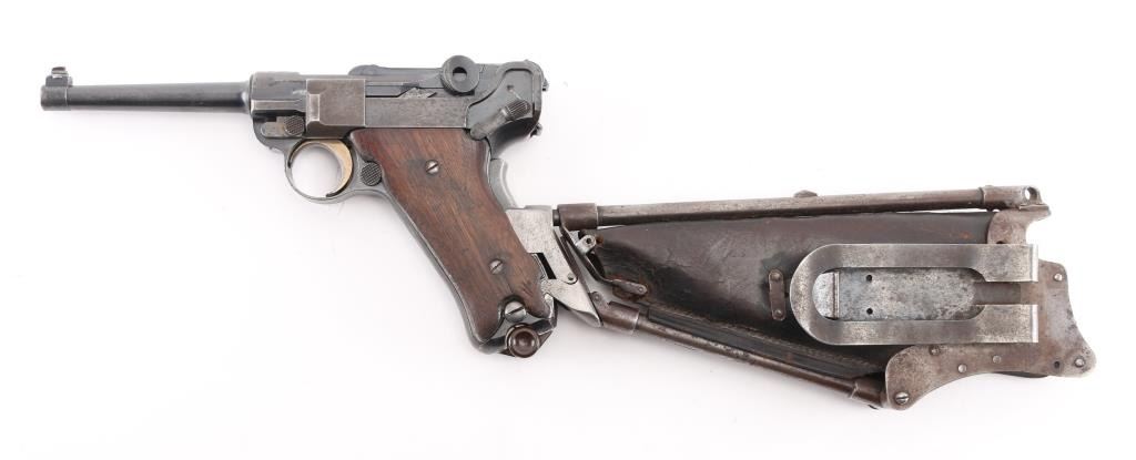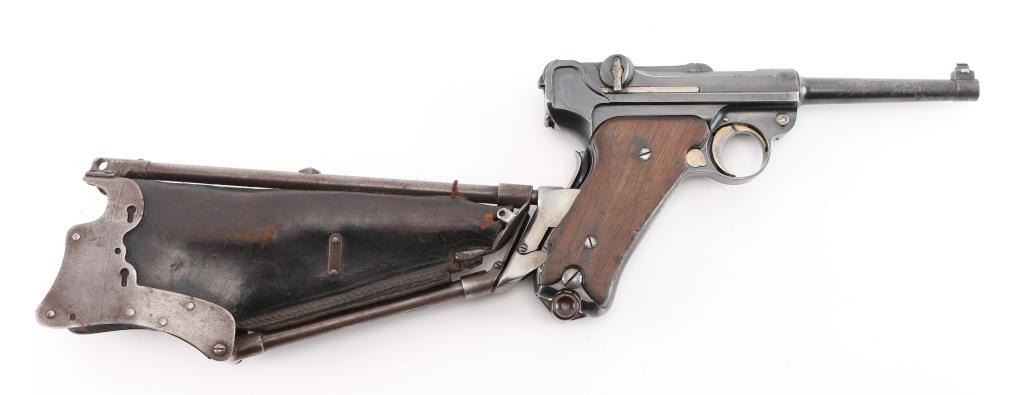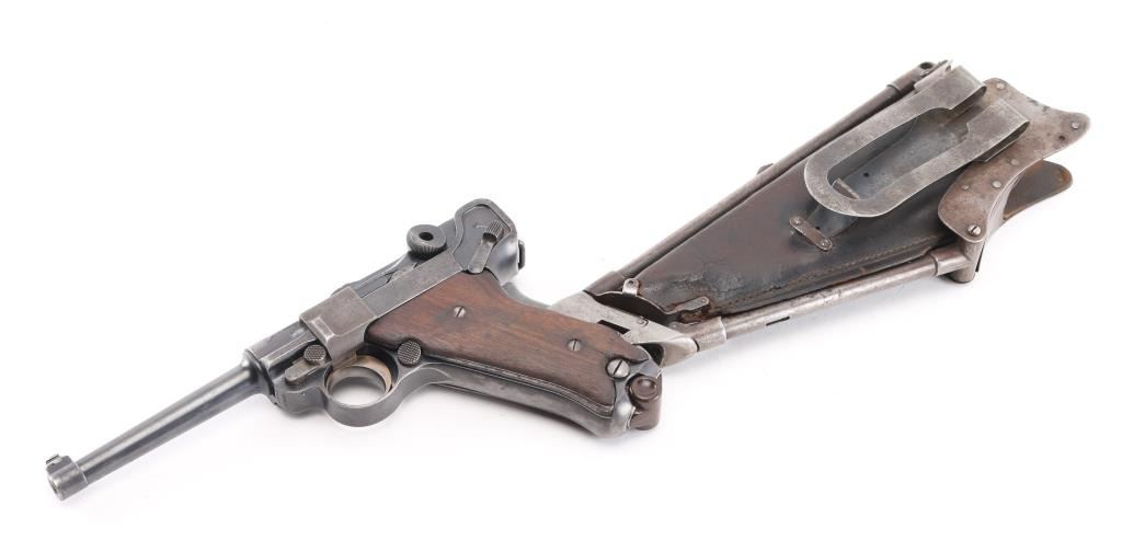 SN:L 18066. 7.65mm. Semi-Automatic. 8 rd Magazine. Toggle-locked, short recoil. DWM (Deutsche Waffen Und Munitions Fabriken) Classic 1900 American Eagle. Made for export to the United States. Kenyon estimates production 1,100 to 1,200. Grip Safety. Scalloped toggles. Frame under the unmarked safety at the lowest point is polished not blued. "DWM" monogram on toggle lever. American Eagle on ring. Matching Serial numbers. 4 3/4" barrel. Front of the frame under the serial number is stamped "Germany". Original blued finish is about 60% with minor scratches and edge/muzzle wear, scattered pin-prick pitting on the frame & barrel, handling loss on the fore and back straps, and on the edges. All markings are crisp/clear. Bore is good with strong rifling, very light areas of pitting. Smooth wood grips are very good. Unmarked magazine with bakelite plug. Comes with the scarce Ideal patent combination Luger stock/holster with grip panels Developed and marketed prior to the integration of the stock lug on the 1900 or 1906 Luger, the Ideal holster uses a pair of wood covered steel panels as a mounting point for a extending tubular frame buttstock which has a leather pistol holster within the frame. "patent/Pending marked on both sides of the mouth with a reversible spring steel belt hook, The smooth grips panels are unmarked with the appropriate cutouts in the left side for grip safety. Blue finish is gone, leather is sound/scuffed, and the two rivets at the front of holster are gone,