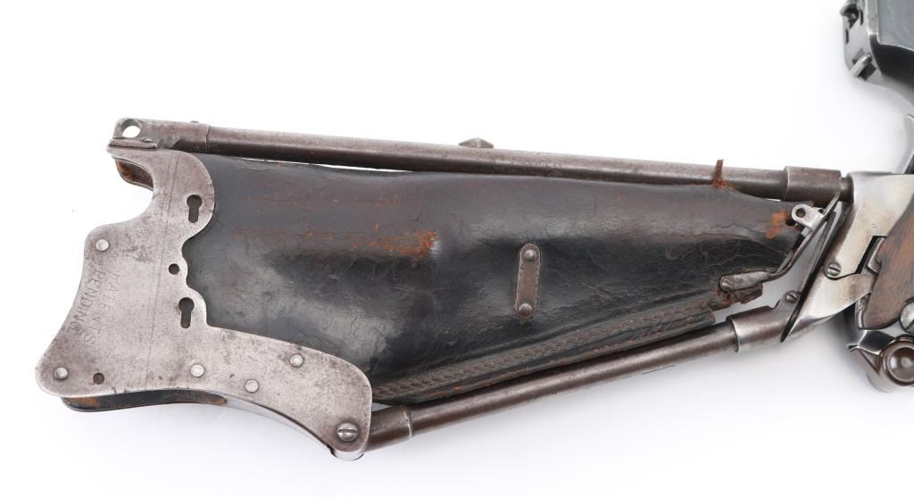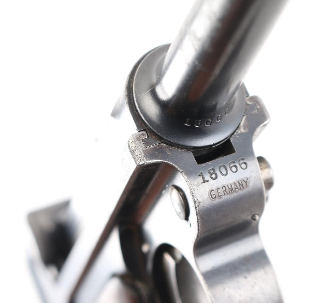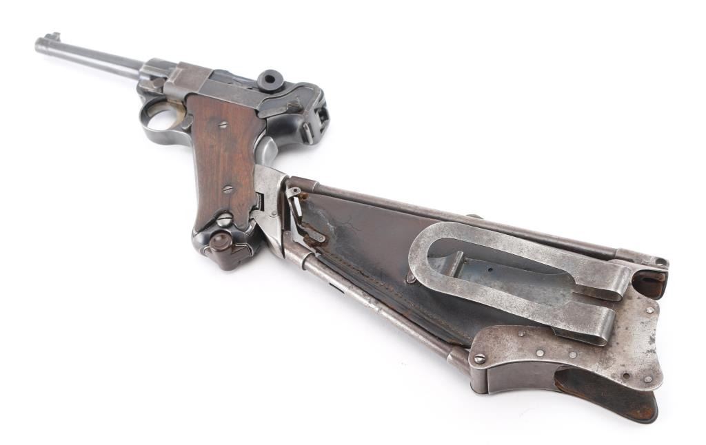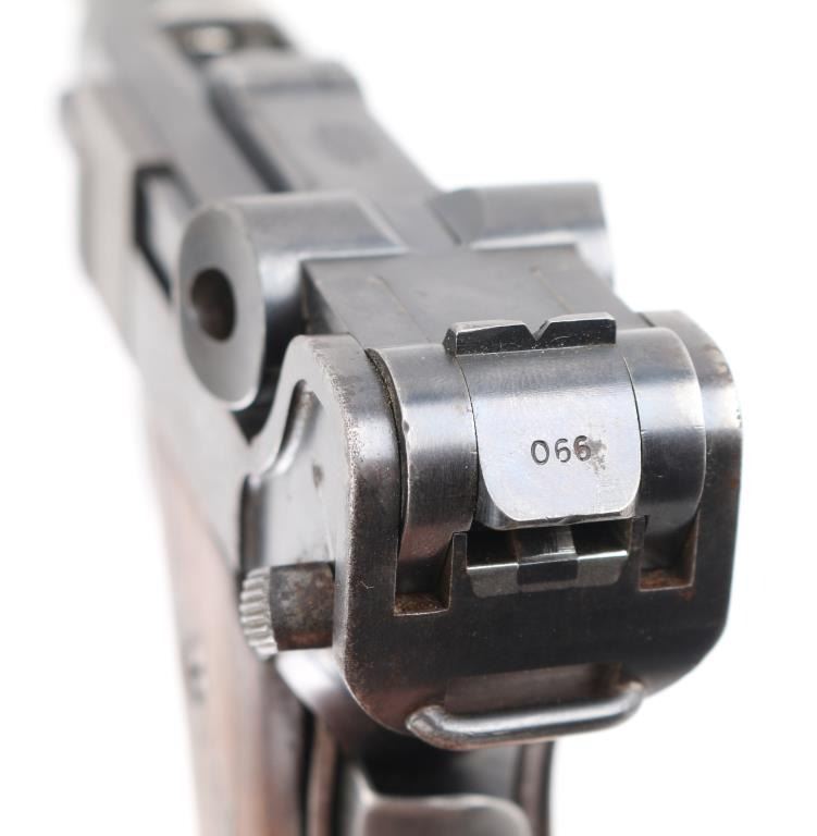 SN:L 18066. 7.65mm. Semi-Automatic. 8 rd Magazine. Toggle-locked, short recoil. DWM (Deutsche Waffen Und Munitions Fabriken) Classic 1900 American Eagle. Made for export to the United States. Kenyon estimates production 1,100 to 1,200. Grip Safety. Scalloped toggles. Frame under the unmarked safety at the lowest point is polished not blued. "DWM" monogram on toggle lever. American Eagle on ring. Matching Serial numbers. 4 3/4" barrel. Front of the frame under the serial number is stamped "Germany". Original blued finish is about 60% with minor scratches and edge/muzzle wear, scattered pin-prick pitting on the frame & barrel, handling loss on the fore and back straps, and on the edges. All markings are crisp/clear. Bore is good with strong rifling, very light areas of pitting. Smooth wood grips are very good. Unmarked magazine with bakelite plug. Comes with the scarce Ideal patent combination Luger stock/holster with grip panels Developed and marketed prior to the integration of the stock lug on the 1900 or 1906 Luger, the Ideal holster uses a pair of wood covered steel panels as a mounting point for a extending tubular frame buttstock which has a leather pistol holster within the frame. "patent/Pending marked on both sides of the mouth with a reversible spring steel belt hook, The smooth grips panels are unmarked with the appropriate cutouts in the left side for grip safety. Blue finish is gone, leather is sound/scuffed, and the two rivets at the front of holster are gone,