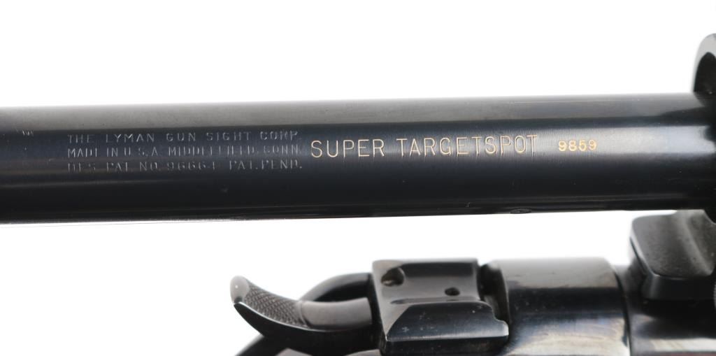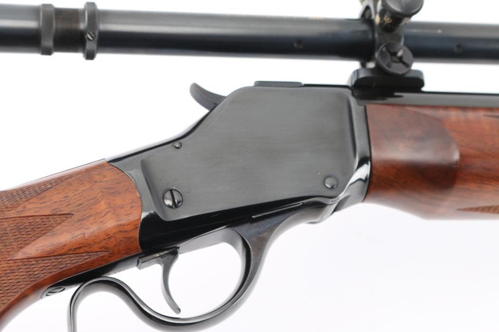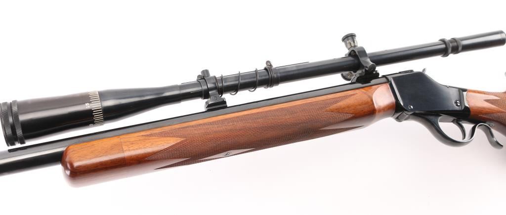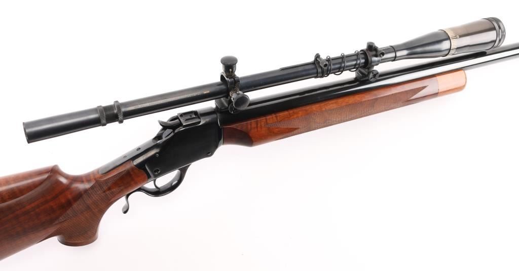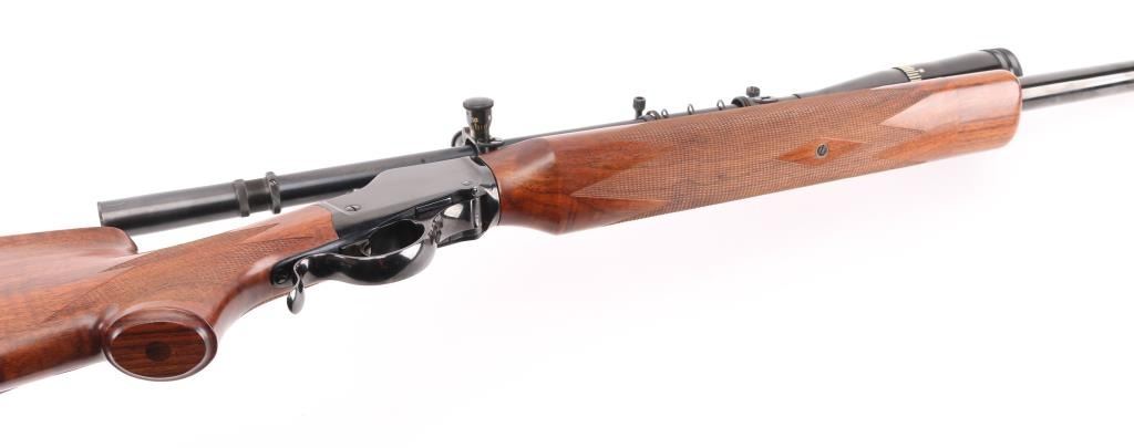 This is a custom target rifle built on a Winchester M1885 High Wall receiver. Re-barreled with a 26" heavy round barrel chambered in .225 Win. High polish re-blued finish, beautiful highly figured American walnut stock with high comb, shadow line cheek piece, contrasting wood grip cap and forearm tip, fine checkering on forearm & wrist. A checkered steel 'Neidner' style buttplate .Mounted with a Lyman 15x Super Target spot scope with adjustable rings, recoil spring, fine cross hair reticle, clear optics. Falling block action is smooth, locks up tight, blue & wood stocks are excellent, bore is excellent/bright. Comes with approx. 50 rounds of reloads. NRA Condition-Excellent. C&R Firearm.