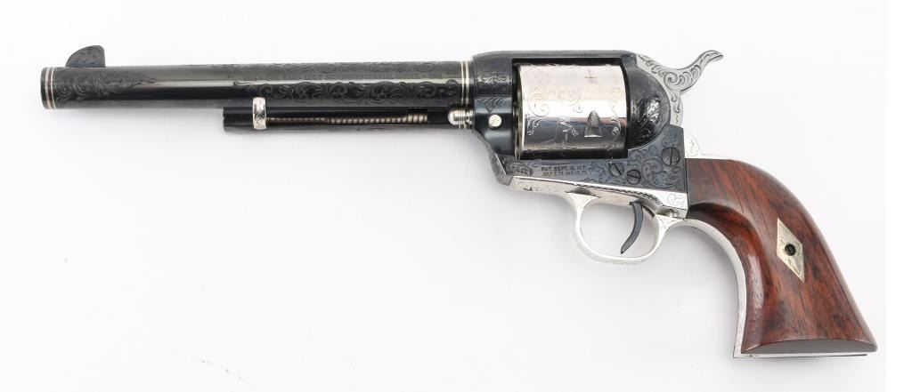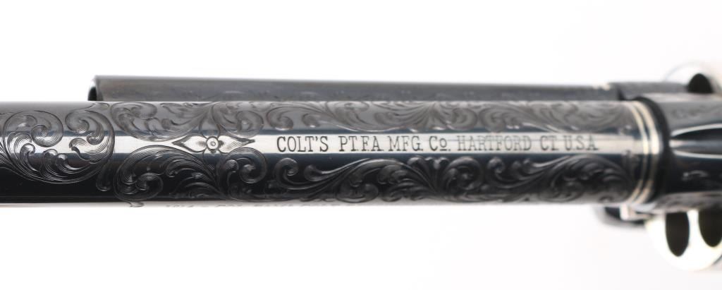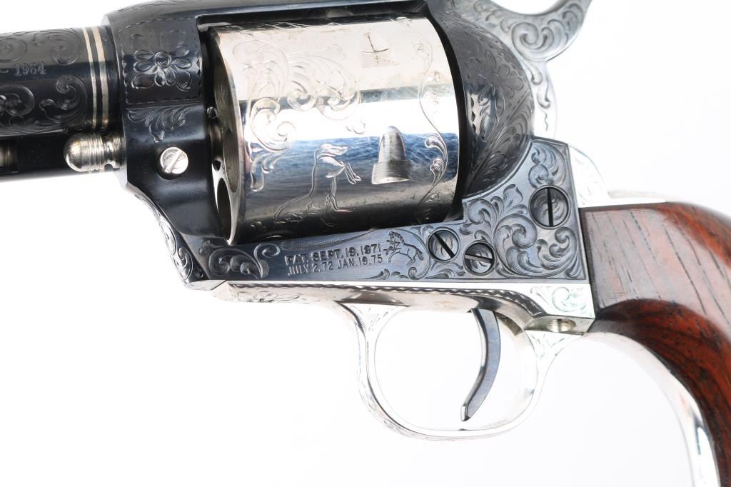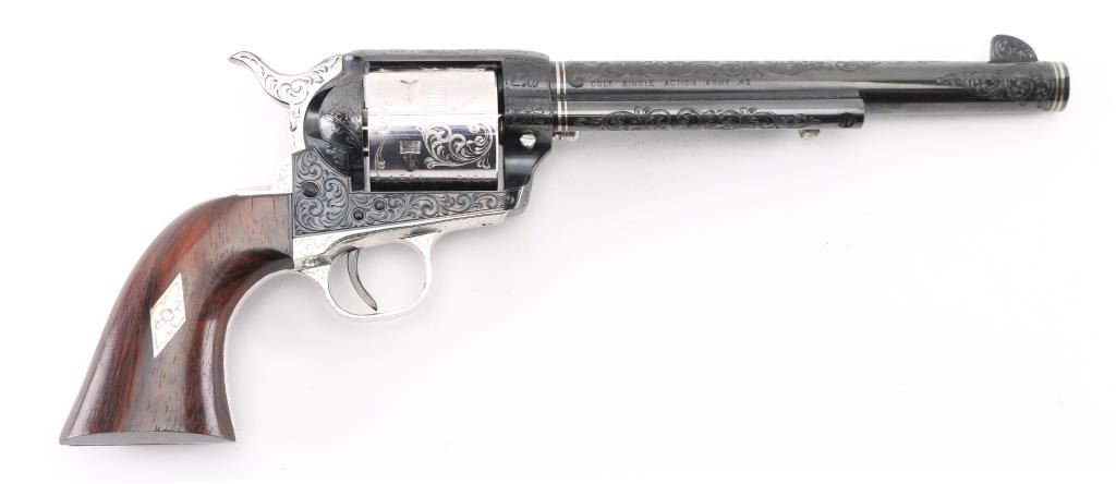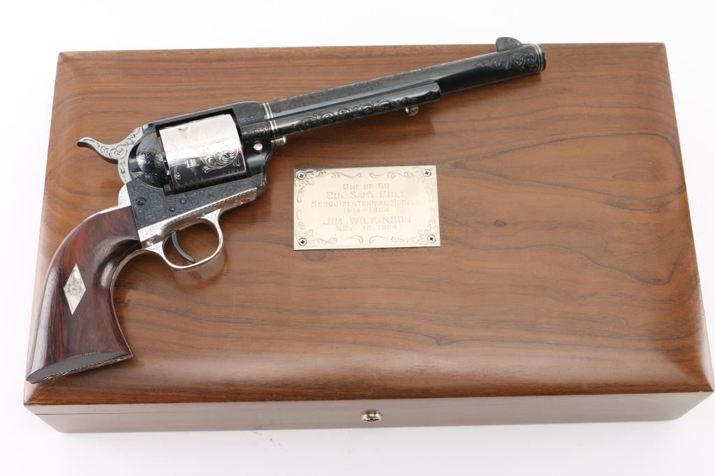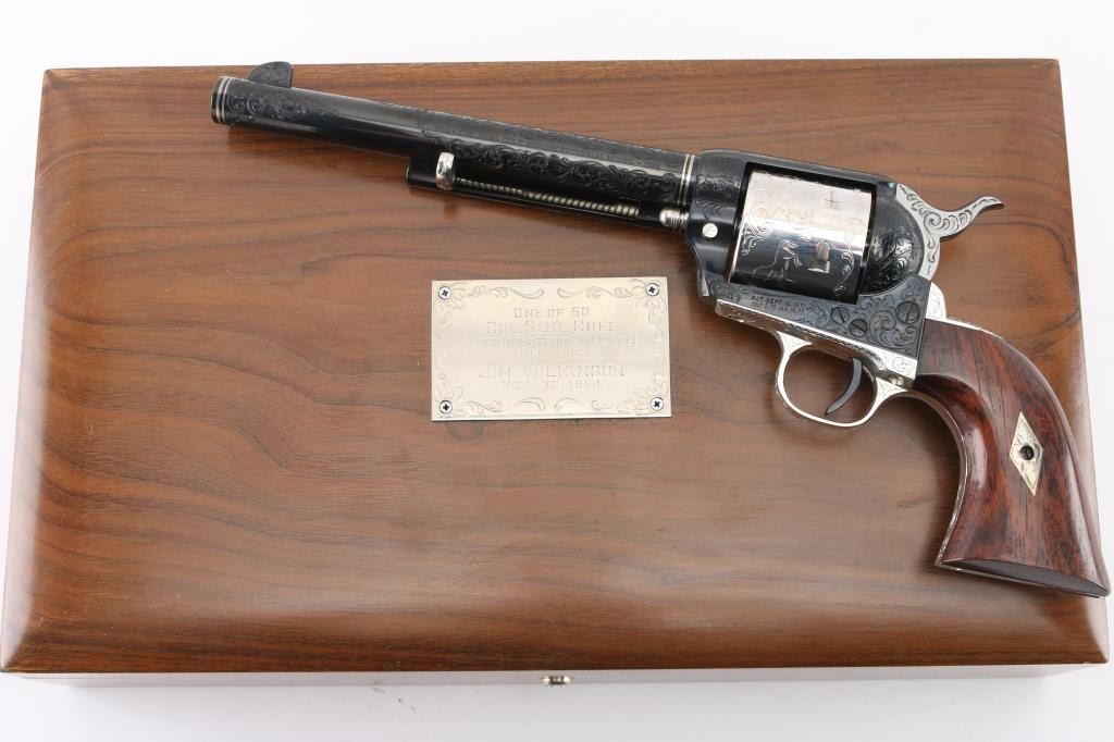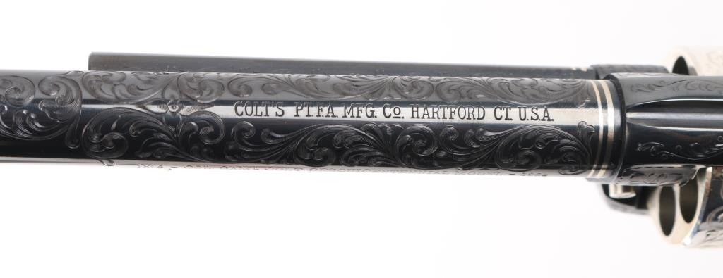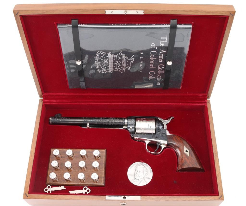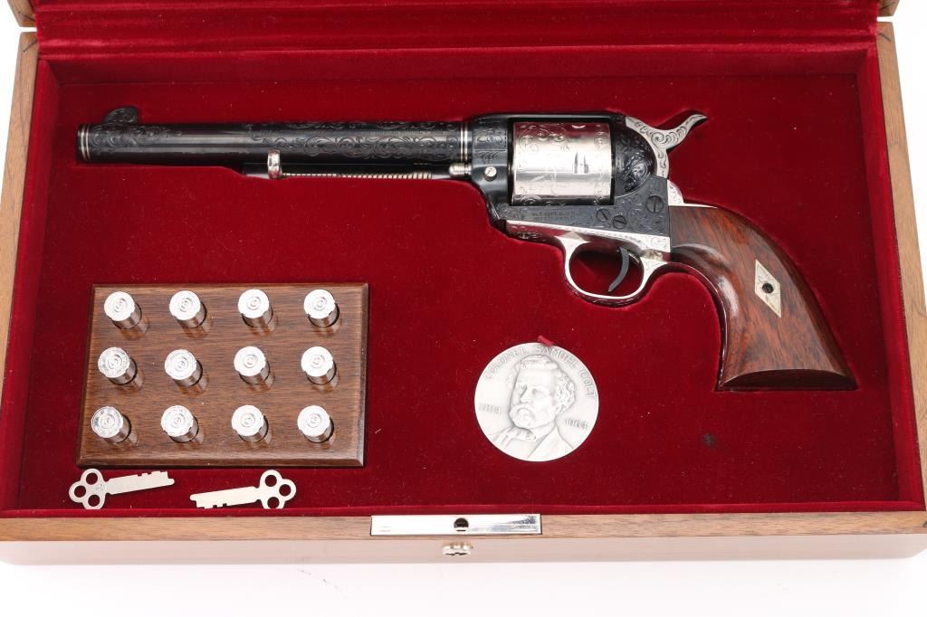 Custom Deluxe .45 LC SN: 3100SC, Alvin White Engraved stamped "Colt's A.A. White/Eng" on the frame under the right grip panel. 1 of only 50 produced featuring: master engraving on 7-1/2" barrel, frame, backstrap, triggerguard and cylinder; four white gold inlaid barrel bands, yellow gold serial numbers, white gold inlaid grip escutcheons, "Sam Colt" signature engraved on butt. Engraving is floral scroll pattern, with panels on cylinder showing: the Rampant Colt, the Colt Paterson revolver, and the Colt factory dome. Grips are wax polished rosewood. Included are 12 silver plated dummy cartridges, cased in a select walnut fitted display box, red velvet lined, with leather bound limited edition book "The Arms Collection of Colonel Colt" by R.L. Wilson, and coin featuring likeness of Samuel Colt and embossed "Colonel Samuel Colt 1814 - 1964". Case lid bears a silver plate engraved with description of revolver, and purchaser name: Jim Wilkinson, Nov. 30, 1964. Also included: original Colt marketing brochures, receipts and invoices, and personally signed letter from Paul A Benke, President of Colt's Firearms Division.
