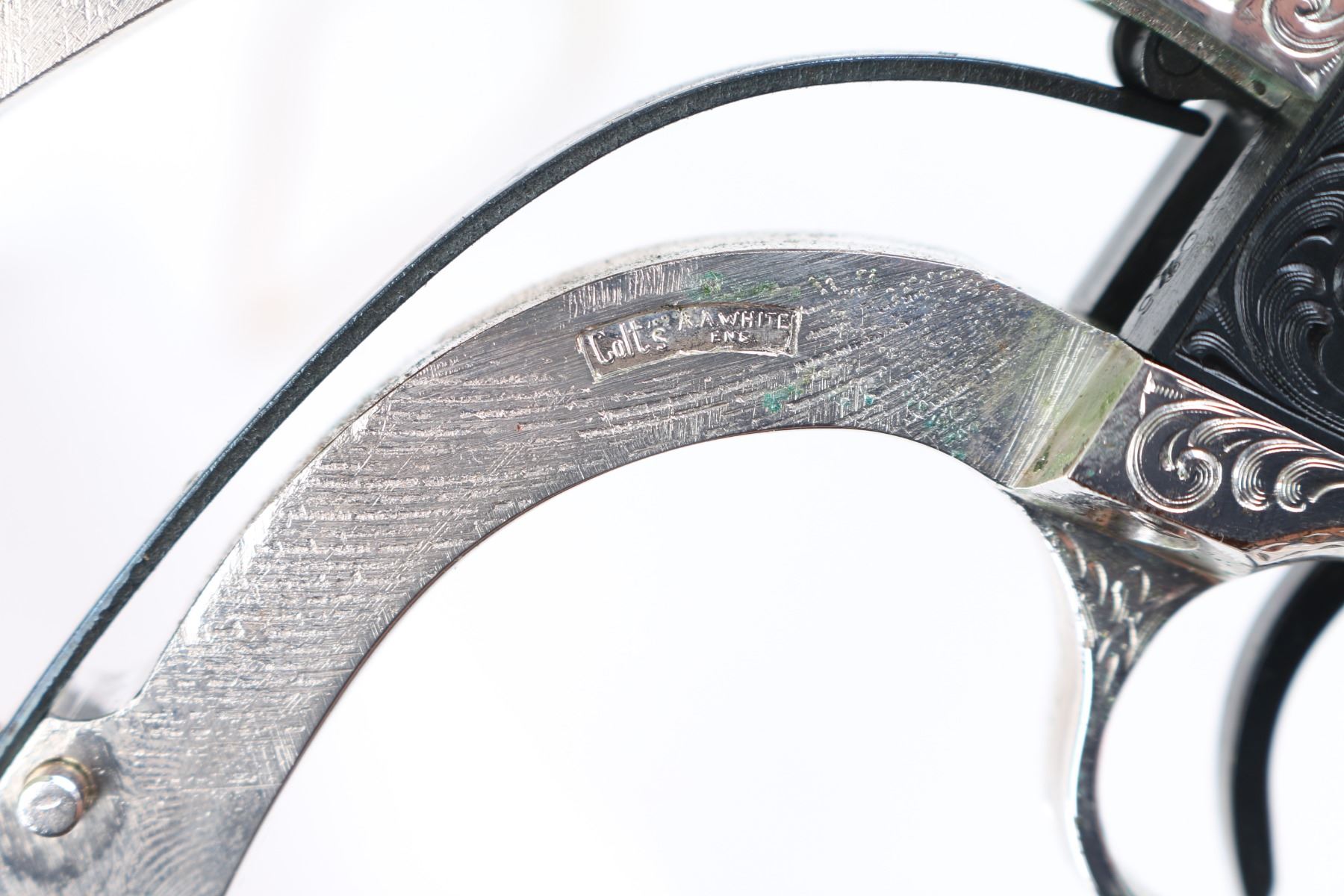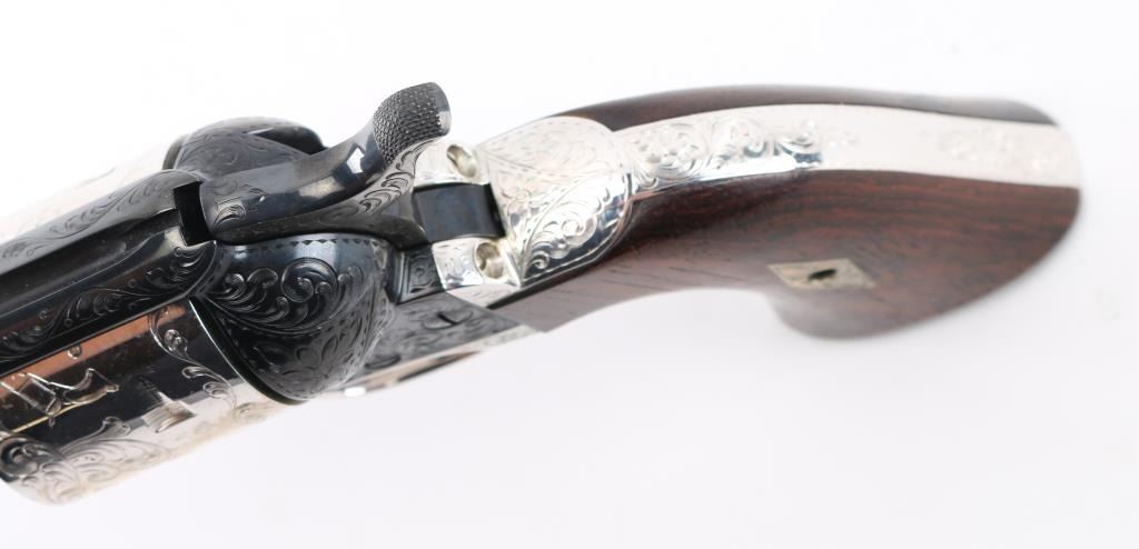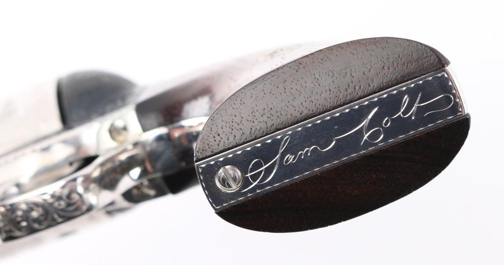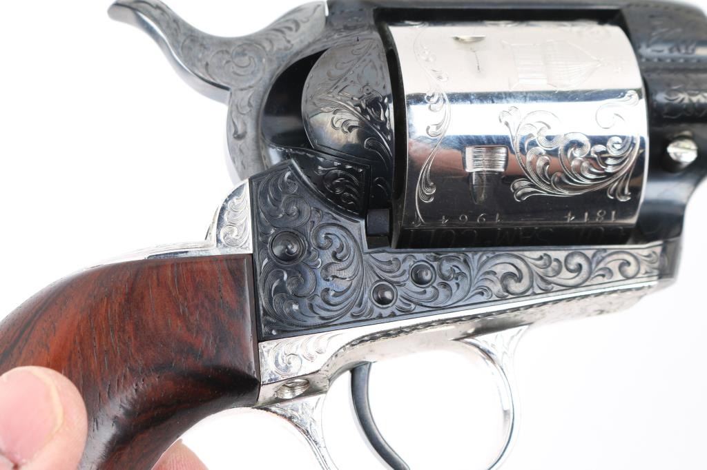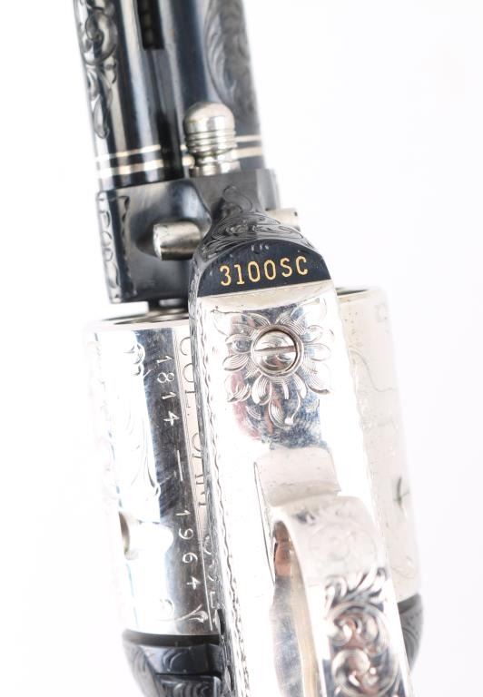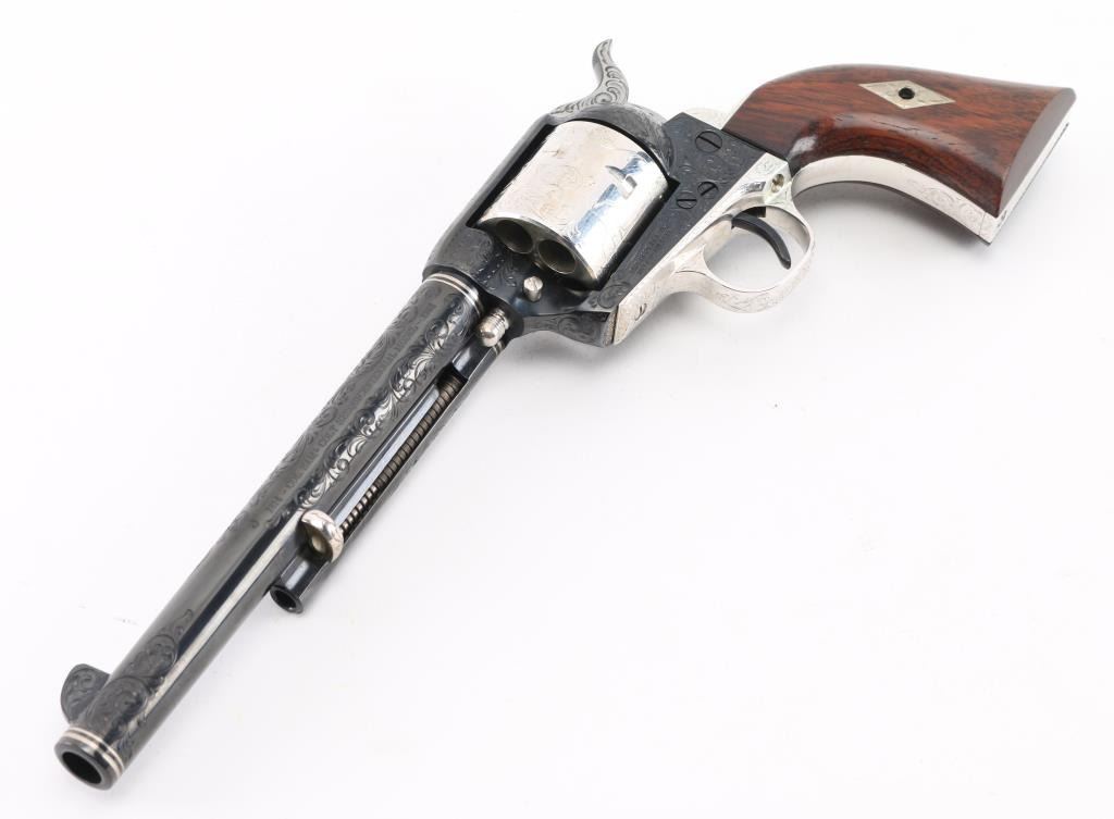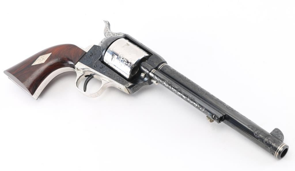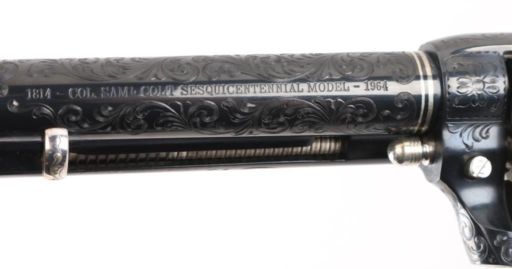 Custom Deluxe .45 LC SN: 3100SC, Alvin White Engraved stamped "Colt's A.A. White/Eng" on the frame under the right grip panel. 1 of only 50 produced featuring: master engraving on 7-1/2" barrel, frame, backstrap, triggerguard and cylinder; four white gold inlaid barrel bands, yellow gold serial numbers, white gold inlaid grip escutcheons, "Sam Colt" signature engraved on butt. Engraving is floral scroll pattern, with panels on cylinder showing: the Rampant Colt, the Colt Paterson revolver, and the Colt factory dome. Grips are wax polished rosewood. Included are 12 silver plated dummy cartridges, cased in a select walnut fitted display box, red velvet lined, with leather bound limited edition book "The Arms Collection of Colonel Colt" by R.L. Wilson, and coin featuring likeness of Samuel Colt and embossed "Colonel Samuel Colt 1814 - 1964". Case lid bears a silver plate engraved with description of revolver, and purchaser name: Jim Wilkinson, Nov. 30, 1964. Also included: original Colt marketing brochures, receipts and invoices, and personally signed letter from Paul A Benke, President of Colt's Firearms Division.
