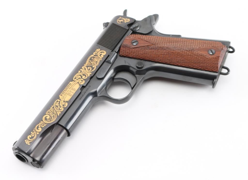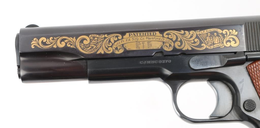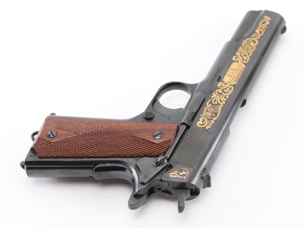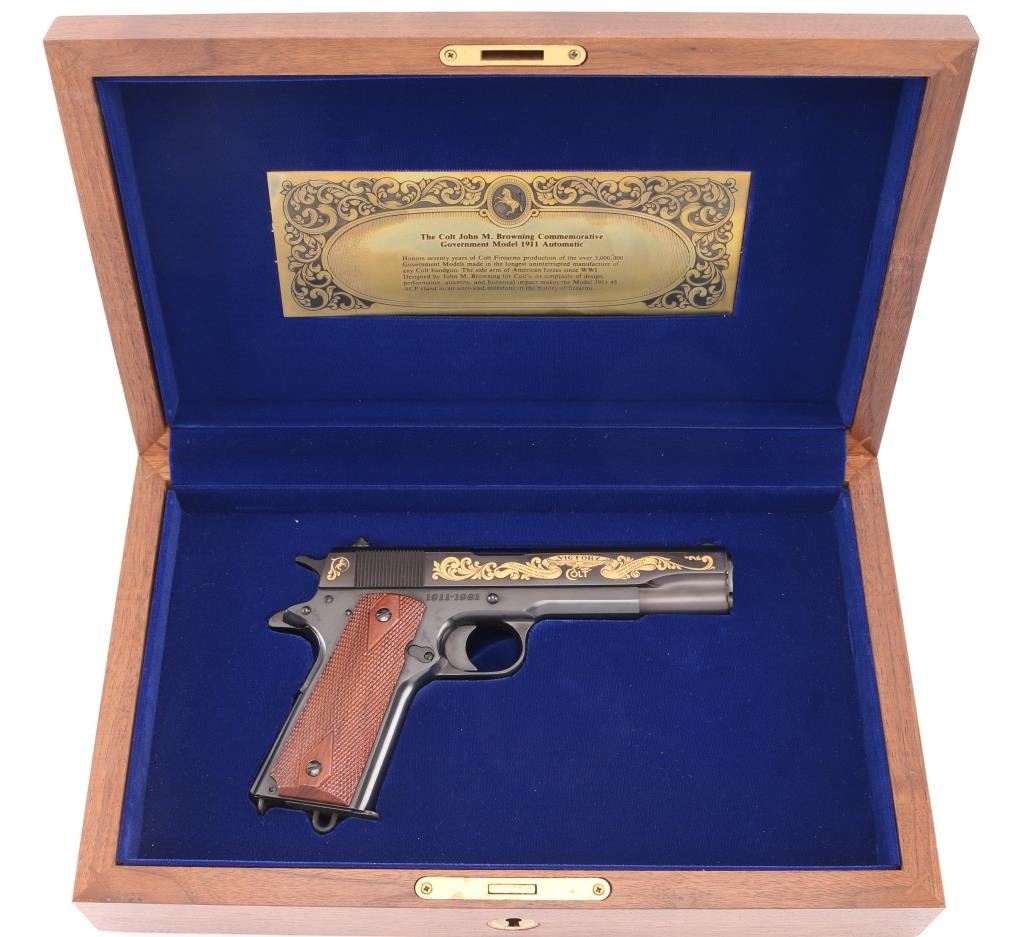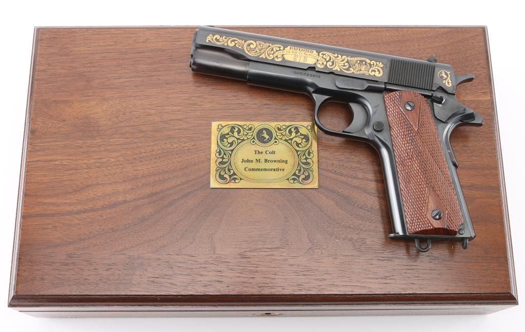 'John M. Browning Commemorative' 1911 style pistol, manufactured circa 1981. Features blued finish with gold inlay accents on both sides of slide, 5" barrel, fixed sights, manual & thumb safeties, double diamond checkered walnut grips, lanyard loops on butt and on base of supplied 7 round magazine. Comes in a blue felt lined inletted locking walnut case (key inside) with commemorative plaque on lid. Retains 98% finish with minor handling marks. Includes Colt styrofoam box with wood grained cardboard sleeve. Condition is NRA Excellent *** Modern Firearm ***