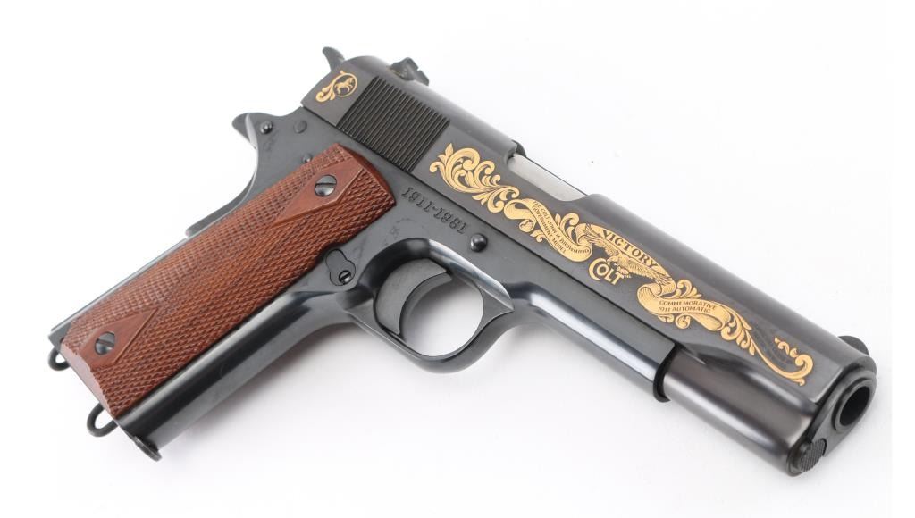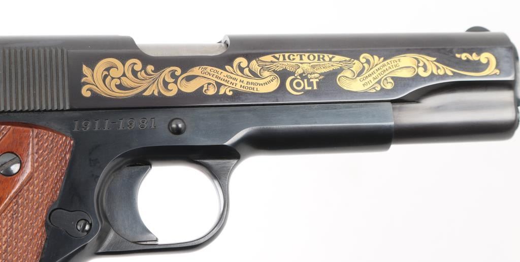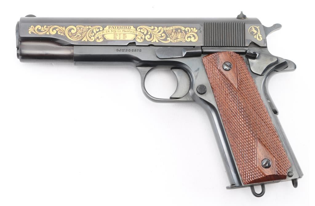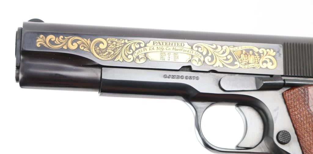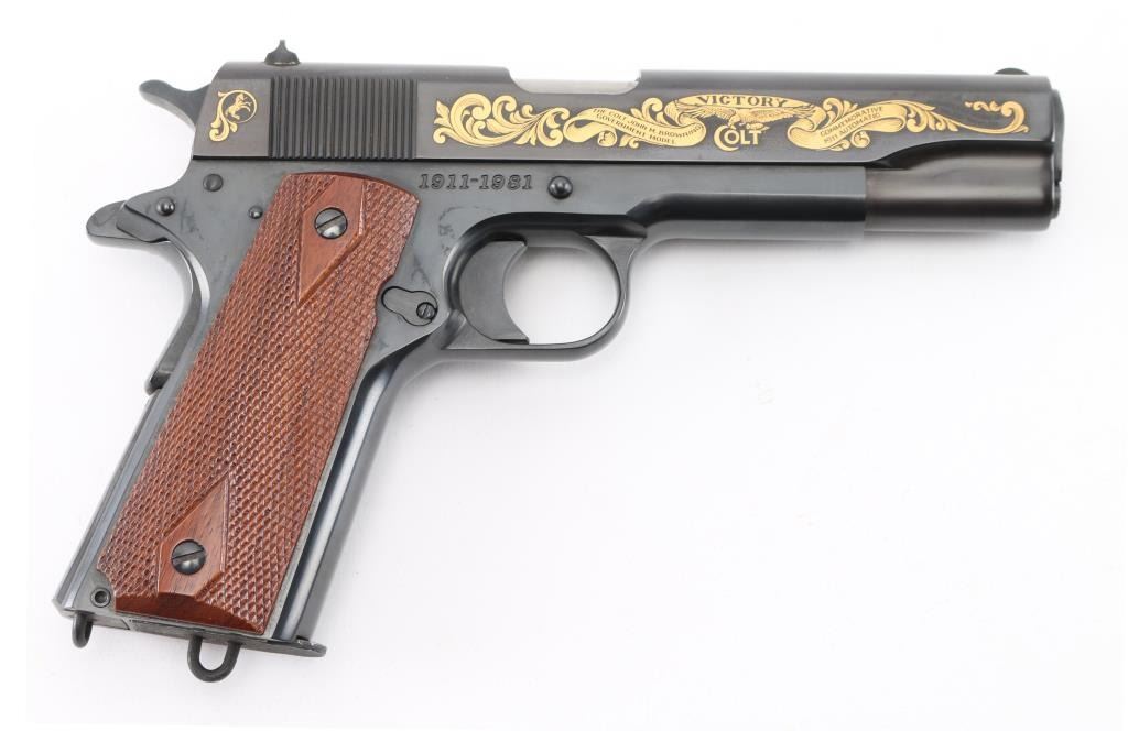 'John M. Browning Commemorative' 1911 style pistol, manufactured circa 1981. Features blued finish with gold inlay accents on both sides of slide, 5" barrel, fixed sights, manual & thumb safeties, double diamond checkered walnut grips, lanyard loops on butt and on base of supplied 7 round magazine. Comes in a blue felt lined inletted locking walnut case (key inside) with commemorative plaque on lid. Retains 98% finish with minor handling marks. Includes Colt styrofoam box with wood grained cardboard sleeve. Condition is NRA Excellent *** Modern Firearm ***
