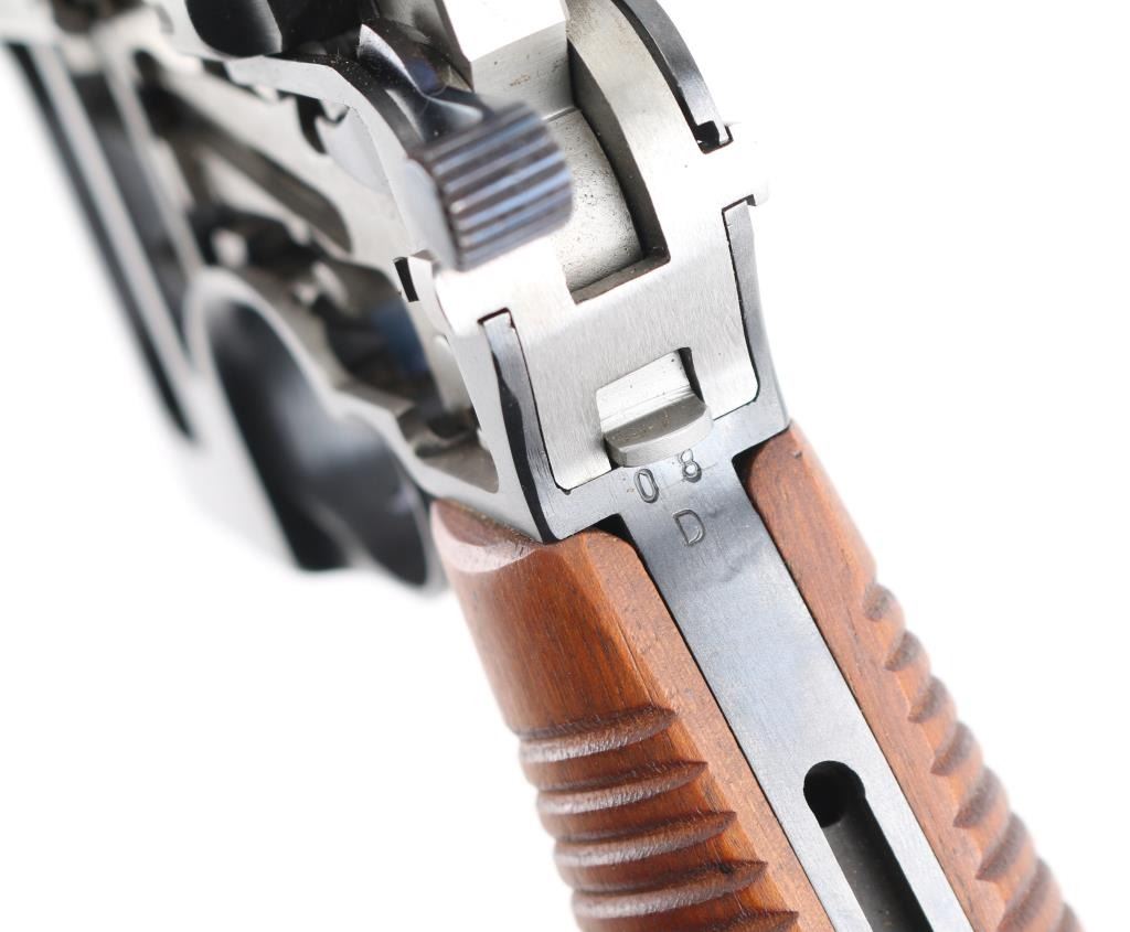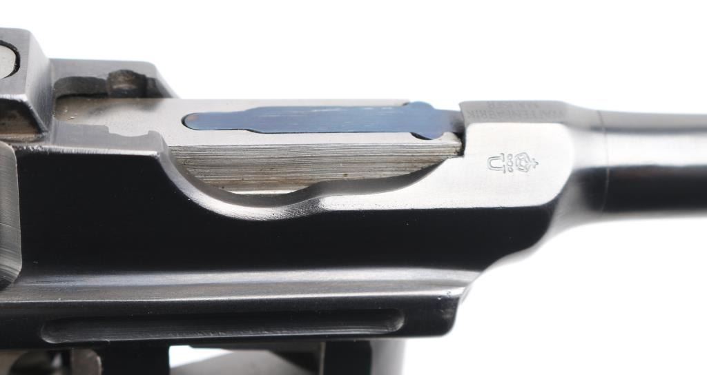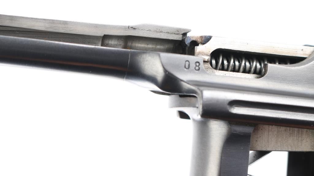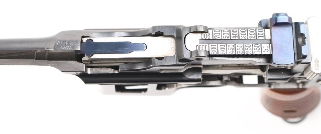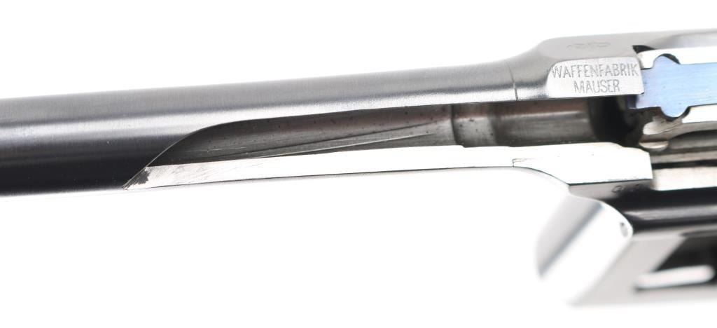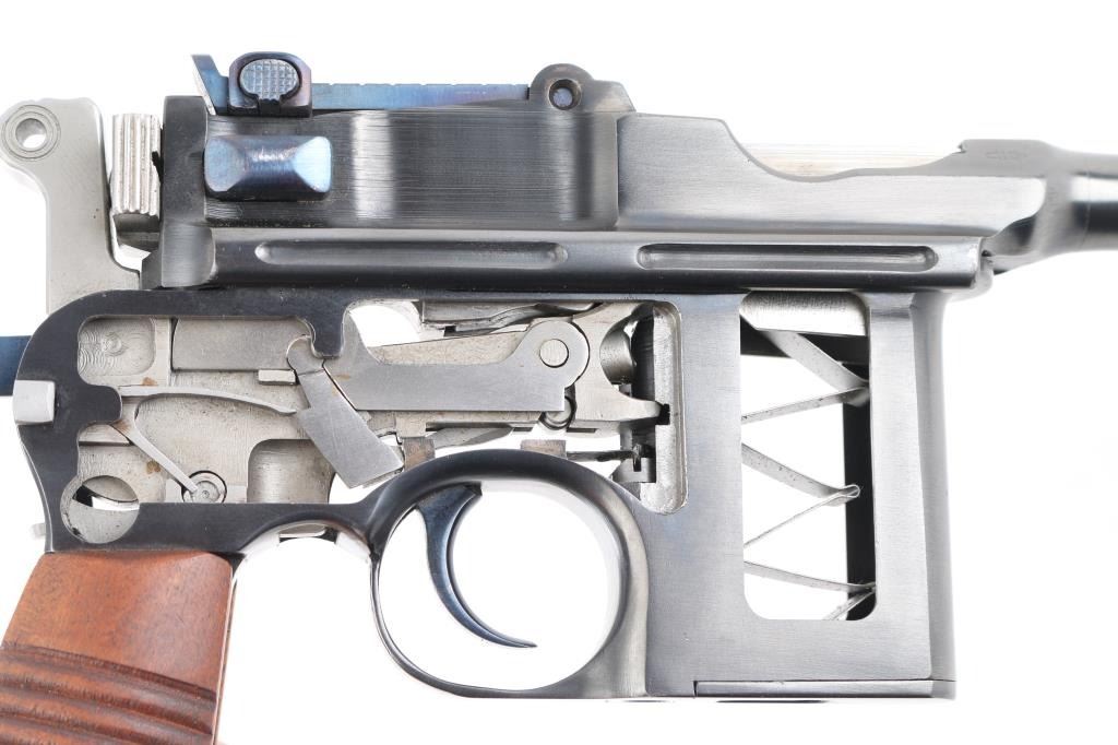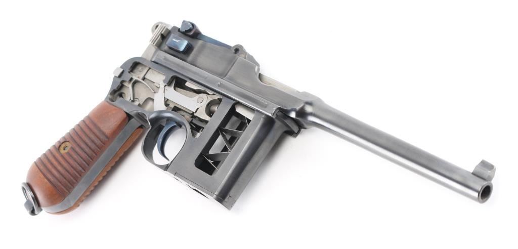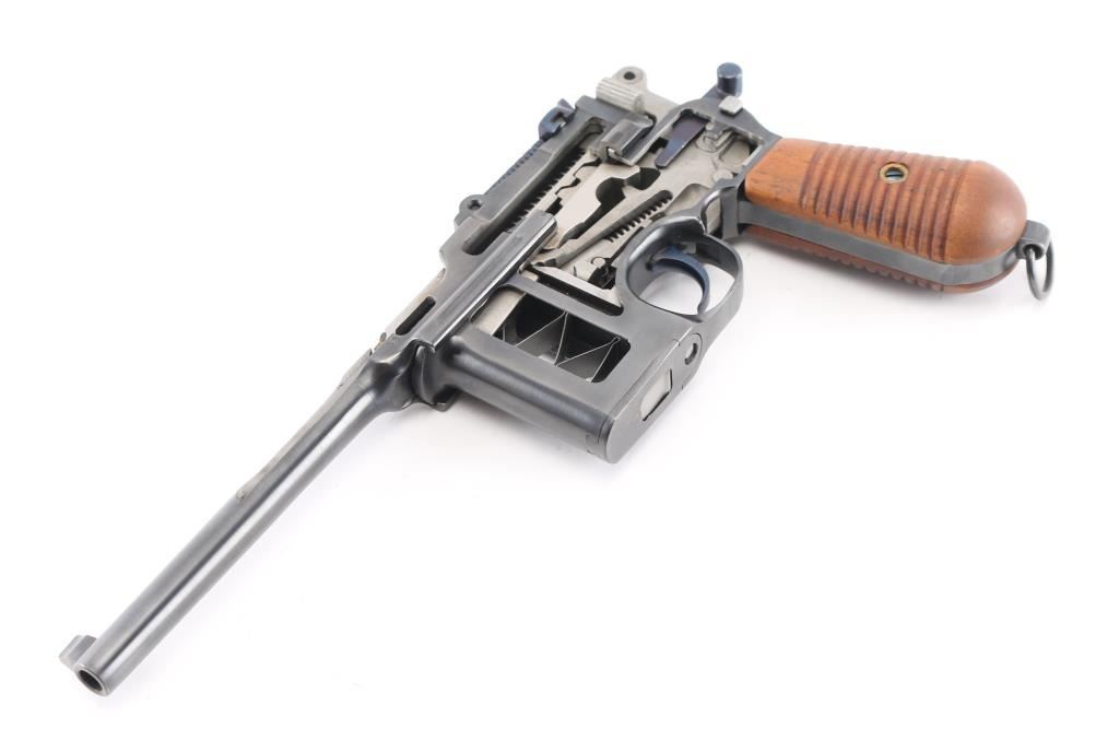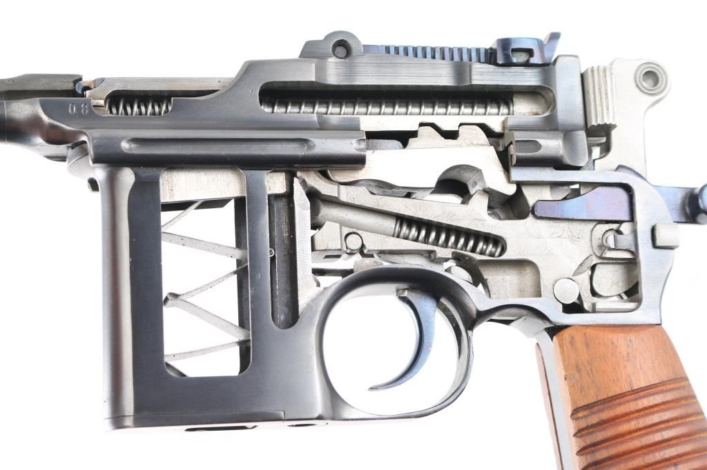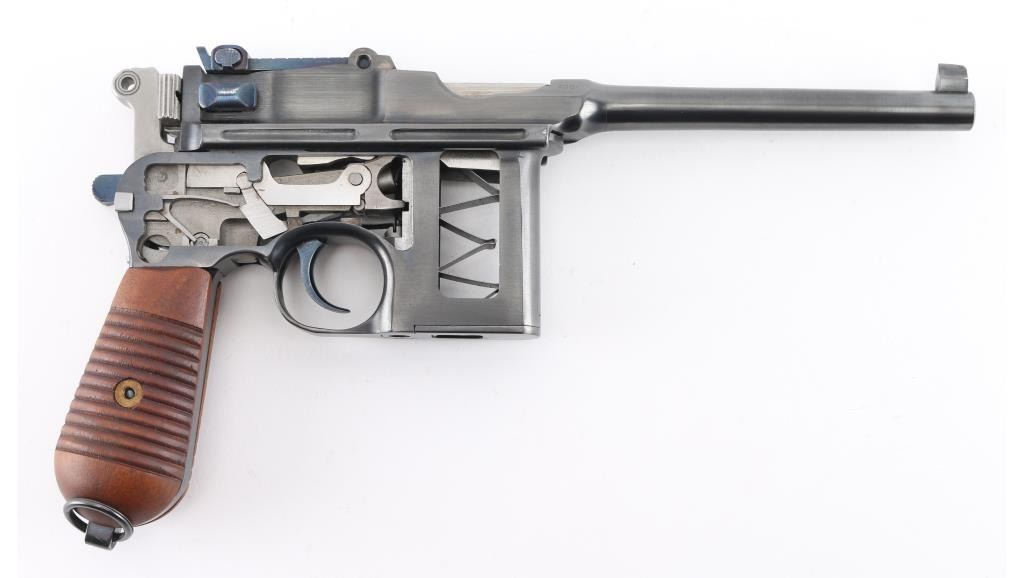 Mauser C96 7,63mm 'Broomhandle' semi-automatic cutaway pistol. Retains grip panels. Nitre blue rear sight leaf and adjustment as well as nitre blue trigger and other small parts Both sides of gun have been completely cut away, which includes 2 3/4" of the left side of the barrel showing all the internal workings of the Model C96 Broomhandle Mauser. Crown U proof, partial "Waffenfabrik Mauser" on chamber, "08" on left barrel extension & backstrap. has 98% reapplied blued finish. All nitre blue parts remain at 98%. An incredibly interesting non-shootable display piece for the Mauser collector. All internals are in near new condition. Excellent overall. Deactivated Firearm.