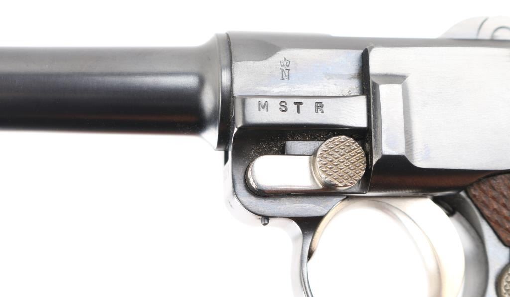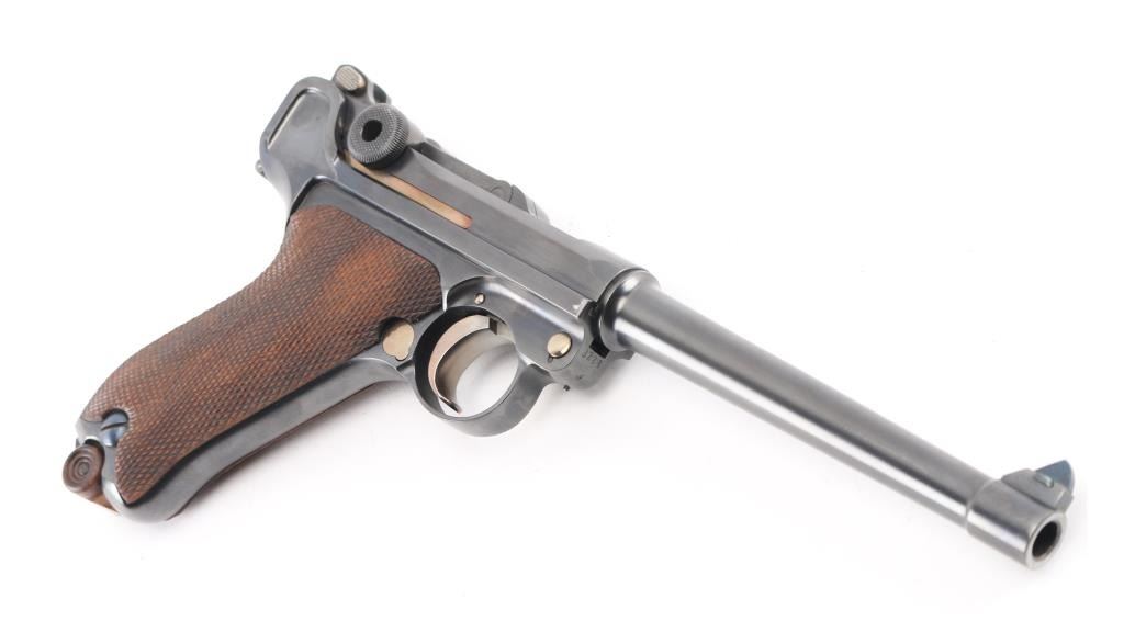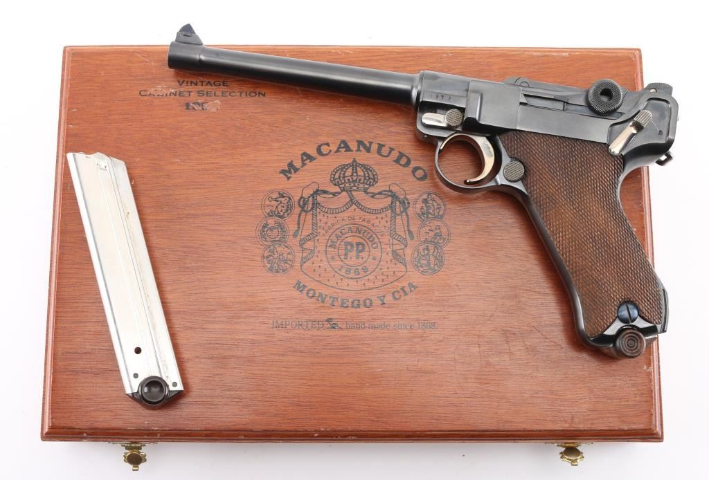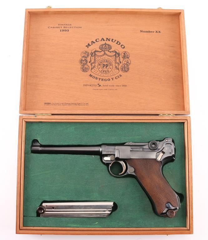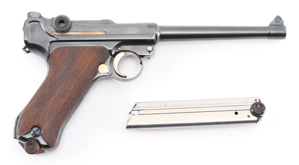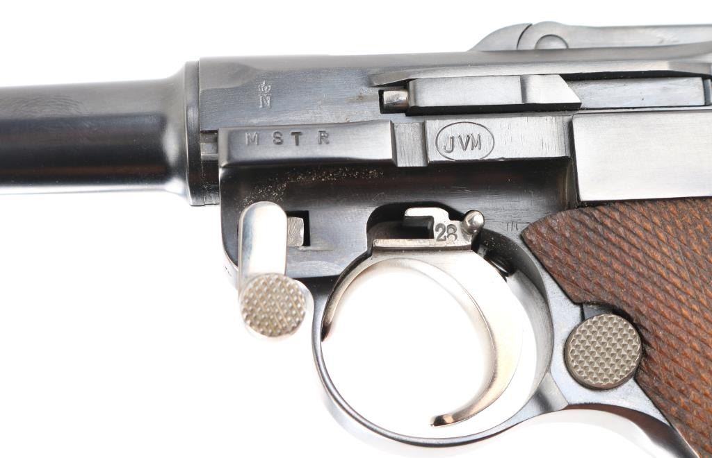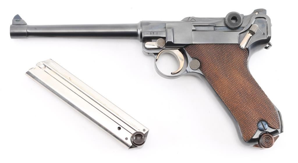 Operating out of his home workshop in California, John Martz is best known for his alterations and upgrades of Luger and P-38 pistols, all of which were performed by him and often took several months of work. Manufactured using a combination of new-made components and vintage Luger parts, this pistol follows the overall pattern of a Second Model Navy Luger and integrates the Martz Safe Toggle Release upgraded 6" unmarked barrel. Blade front and 2-position notch rear sight with "100" and "200" graduations. With a small "crown N" proof on the left side of the breechblock, "DWM" on the front toggle link, and "MSTR" on the left side of the frame. Fitted with a pair of checkered walnut grips and a nickel finished magazine with a concentric circle decorated "JVM" marked walnut base. Nitre blue grip screws, & spring. Bore is excellent/bright, straw is about 98%, with very minor muzzle wear, grips are excellent. Matching serial Numbers on frame, side plate, and take-down lever. Comes in a custom form fitted, green felt, Macanudo cigar case with spare magazine, bakelite plug. Marked under side plate on frame JBM inside oval Martz's signature marking. NRA Condition-Excellent. C&R firearm.
