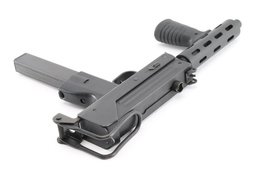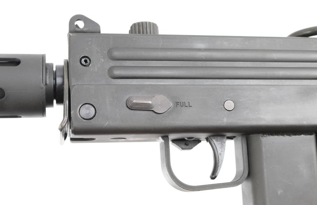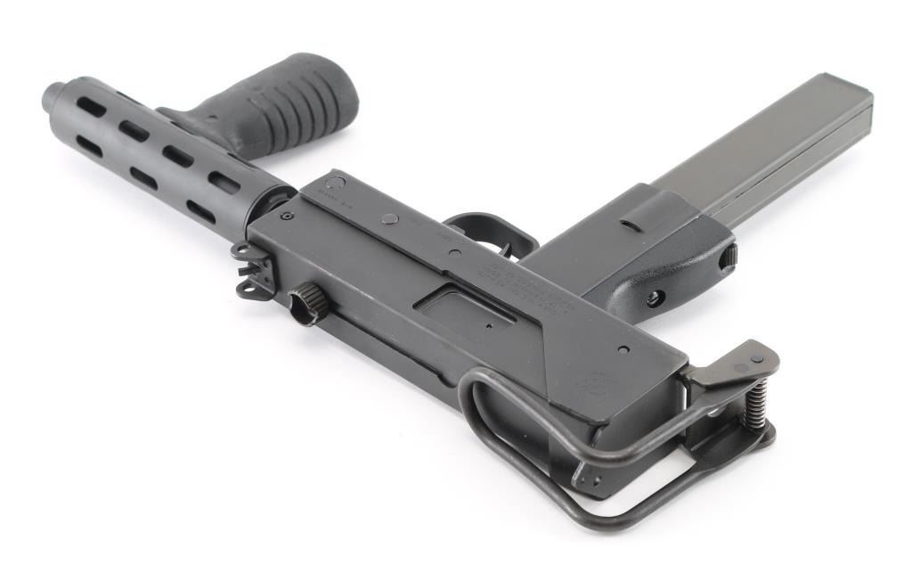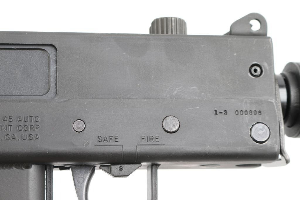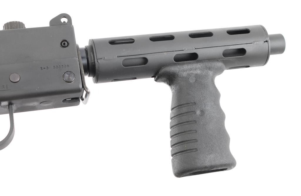 Fully transferable selective fire machine gun. Features dark gray parkerized finish, black polymer backstrap on grip, approx 6" threaded barrel, fixed sights, collapsing steel wire stock, sling slot swivel between barrel & receiver, manual safety, mode selector for semi or full. Bore is pristine. Metal is in excellent condition, nearly perfect, with few minor handling marks & sole areas with slight discoloration. Includes a steel 30 rd magazine, mag loader tool, and a ventilated barrel shroud extension with fore grip. Condition is NRA Excellent ***NFA Firearm*** ***Fully Transferable***