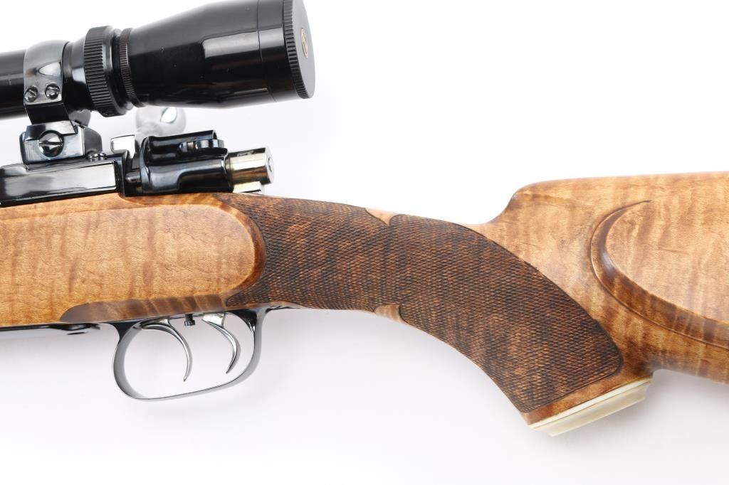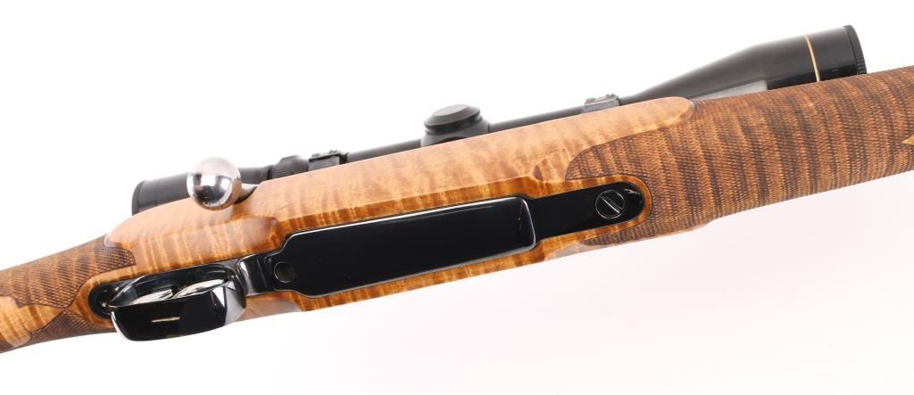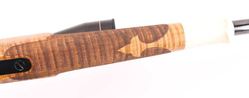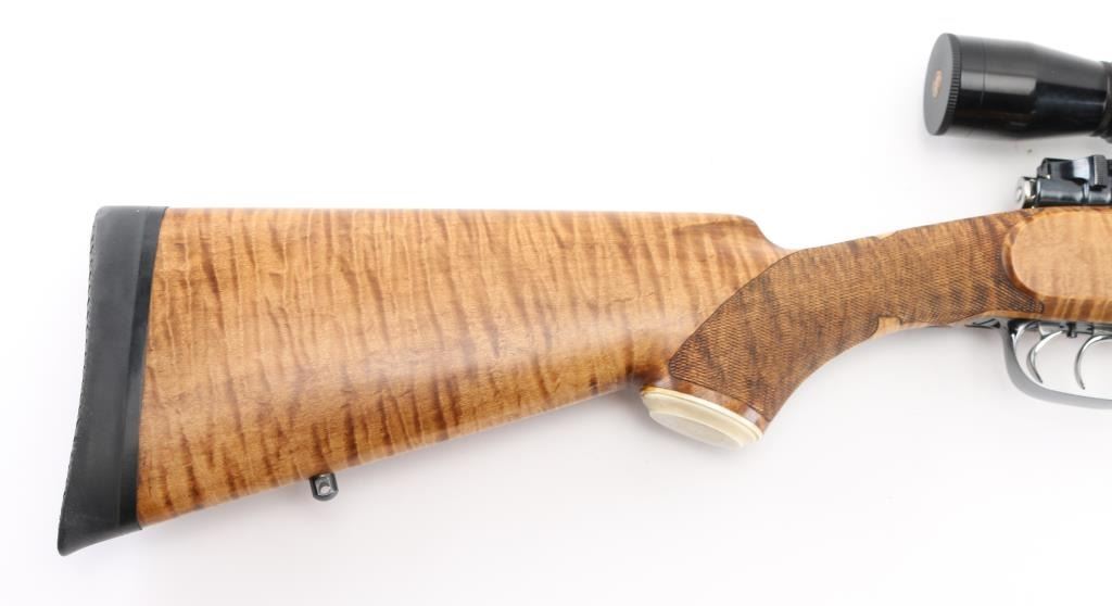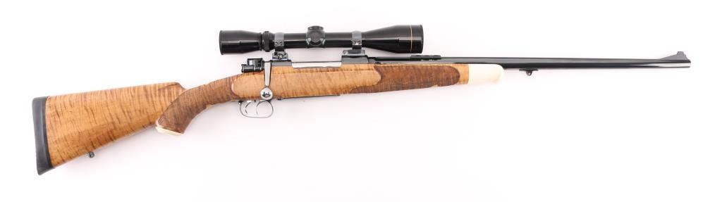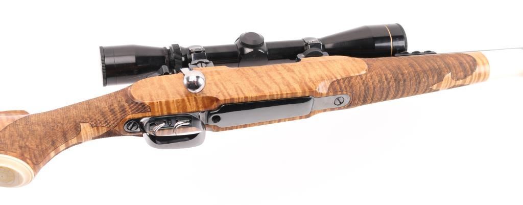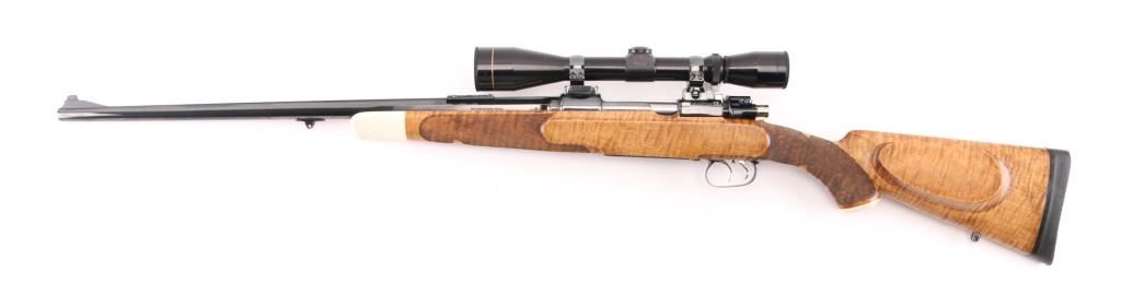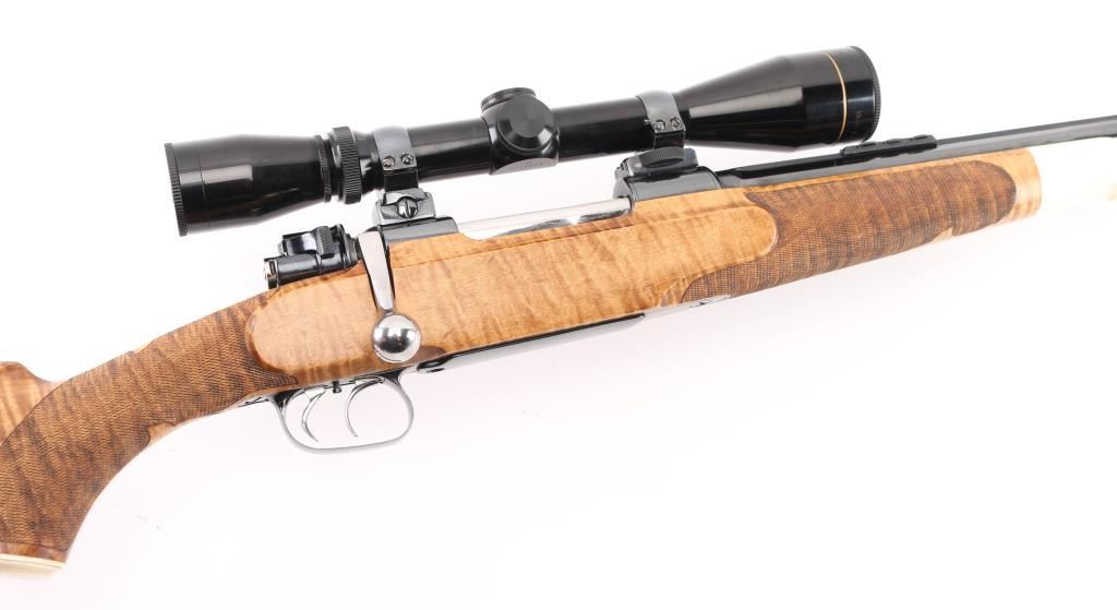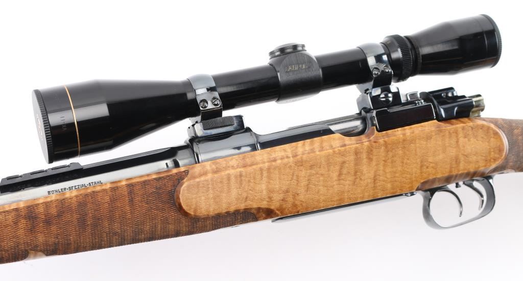 Mauser 98-style receiver with a 22" Bohler Special Steel barrel, chambered for the 35 Whelen cartridges, barrel also marked 'Made in Austria". Fixed ramp blade front sight and 3 folding adjustable leaf rear sights on the lightly tapered half-octagon barrel. Chrome bolt with the handle contoured for the scope, a double-set trigger, and a quick release floorplate. Beautiful finely checkered striped blonde wood pistol grip stock , Fleur-de-Lis panels, a raised shadow-line cheekpiece for right-handed and Pachmayr rubber recoil pad. Ivory forearm tip and grip cap. Consignor states the Ivory came from the Sudan. Mounted with a Leupold VX-II 3-9x40mm scope, clear optics. Bore is excellent/tight, action is smooth, wood and high polish blue finish are excellent. Comes with approx. 20 rounds of reloads and 50 empty brass. NRA Condition-Excellent. C&R Firearm.