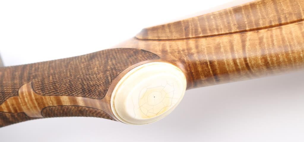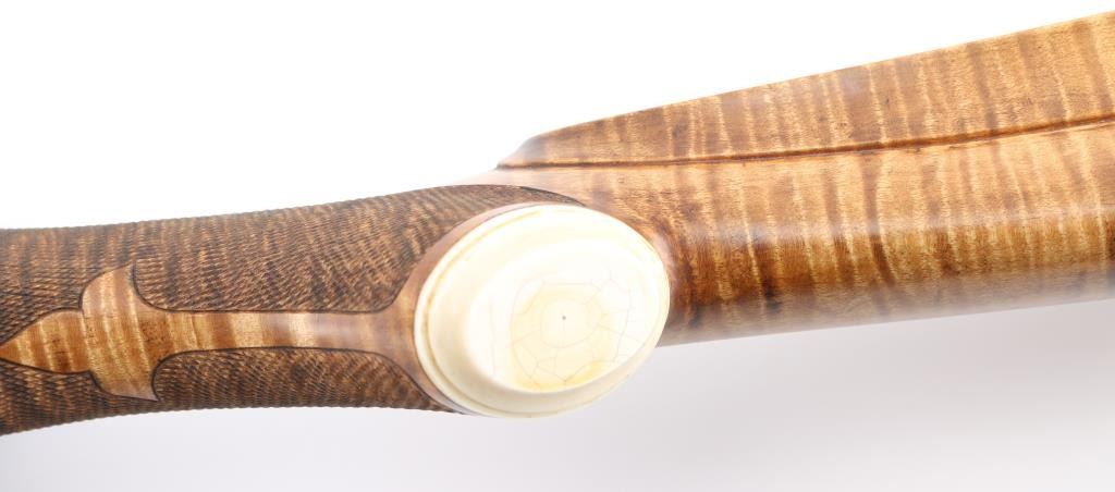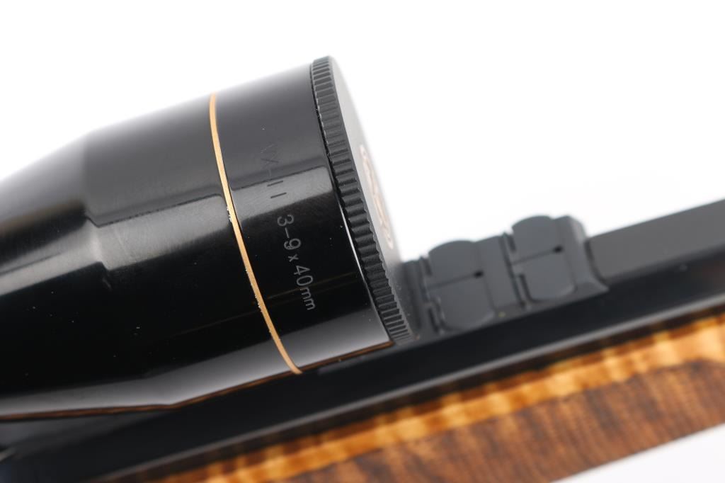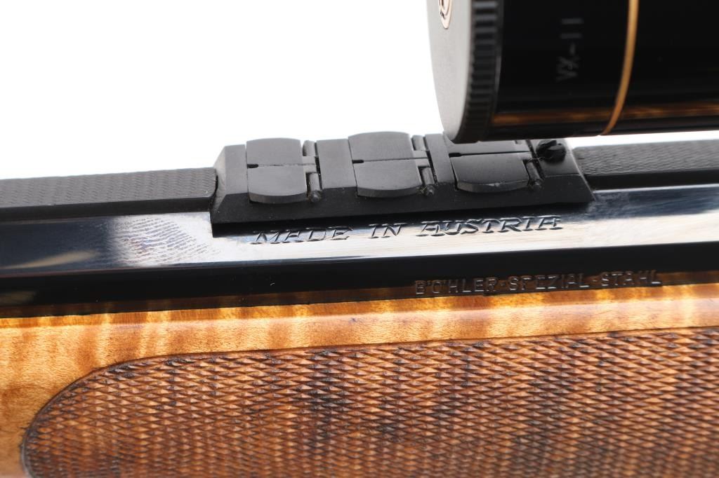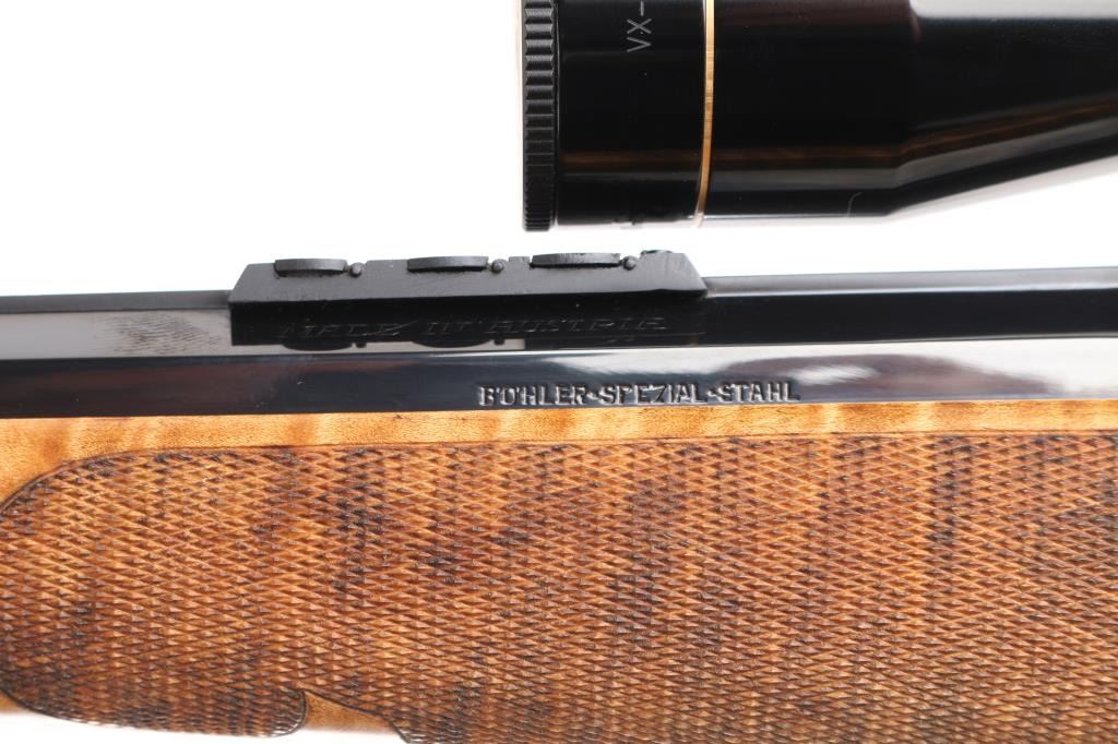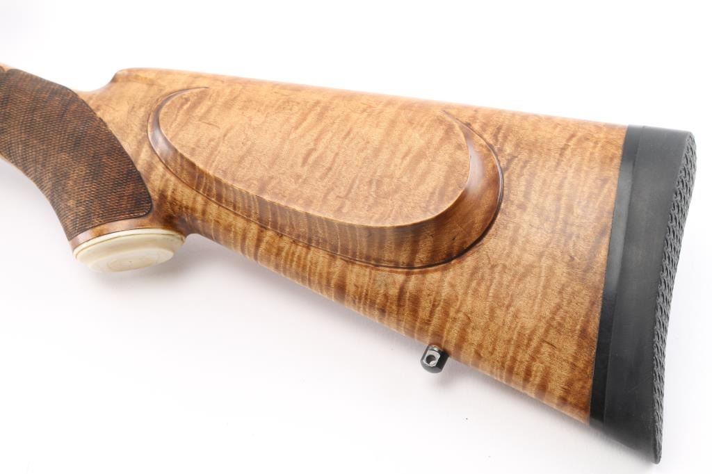 Mauser 98-style receiver with a 22" Bohler Special Steel barrel, chambered for the 35 Whelen cartridges, barrel also marked 'Made in Austria". Fixed ramp blade front sight and 3 folding adjustable leaf rear sights on the lightly tapered half-octagon barrel. Chrome bolt with the handle contoured for the scope, a double-set trigger, and a quick release floorplate. Beautiful finely checkered striped blonde wood pistol grip stock , Fleur-de-Lis panels, a raised shadow-line cheekpiece for right-handed and Pachmayr rubber recoil pad. Ivory forearm tip and grip cap. Consignor states the Ivory came from the Sudan. Mounted with a Leupold VX-II 3-9x40mm scope, clear optics. Bore is excellent/tight, action is smooth, wood and high polish blue finish are excellent. Comes with approx. 20 rounds of reloads and 50 empty brass. NRA Condition-Excellent. C&R Firearm.