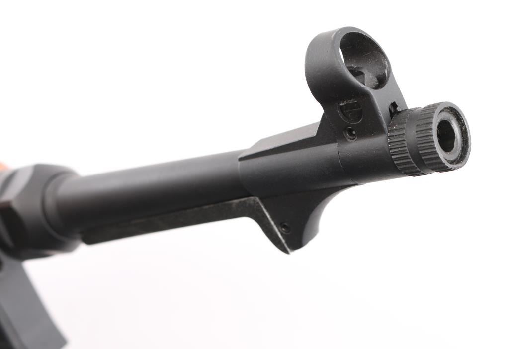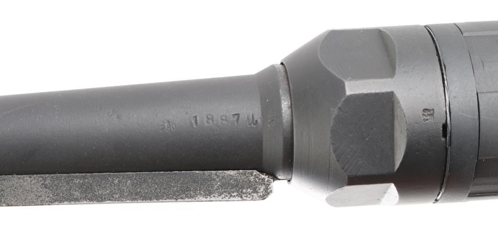 SN: J.C.F.-1 Fully transferable machinegun, made using mostly original German WWII parts, with "bnz 42" code at rear cap for receiver. Many parts retain original numbers and suffix letters. Features dark gray parkerized finish, 9.9" threaded barrel with muzzle cap, protected blade front sight, notch rear with one standing and one falling leaf, under folding steel wire stock, sling slots. Brown bakelite grip and forend panels have ribbed gripping areas. Bore is very good condition, some dimming of the bright inner surface with strong sharp rifling, tiny pits visible. Retains 95% finish with edge losses, scratches. Bakelite is very good overall with some scuffing and light wear. Barrel support hook shows bare metal from rubbing. Includes one 32 rd magazine. Condition is NRA Very Good++ ***NFA Firearm*** ***Fully Transferable***