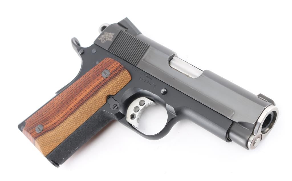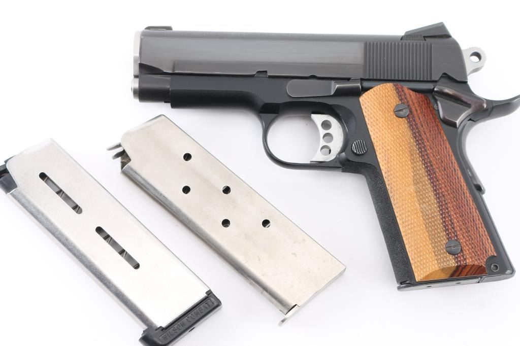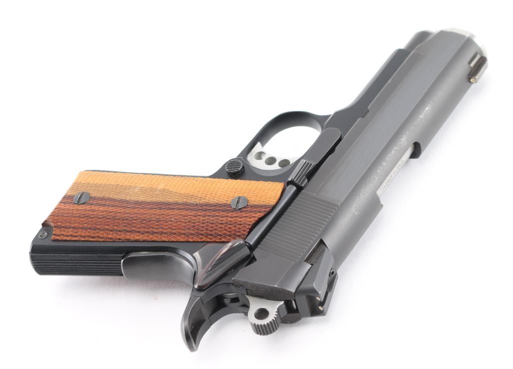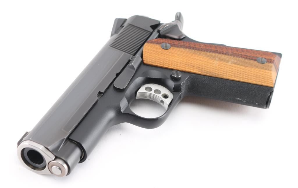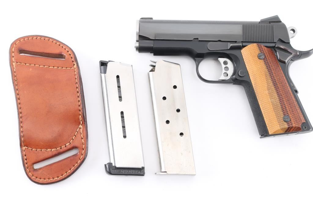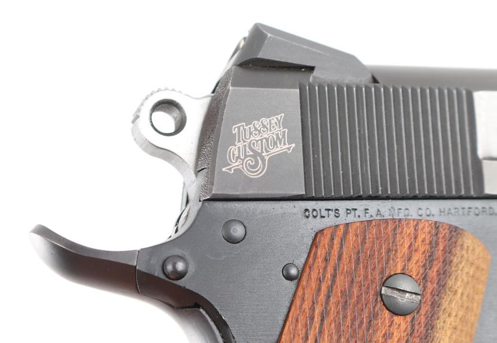Single action, Tussey Custom 1911 with 3 1/2" barrel, manufactured circa 1989, bore is bright, three-dot sights, serrated hammer spur and trigger, fully textured custom wood grips, single-stack magazine. Light rub marks on top of the slide. Includes brown leather universal OWB holster and two extra magazines. **NRA Excellent** Modern Firearm
