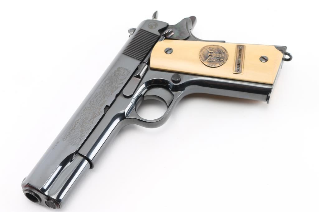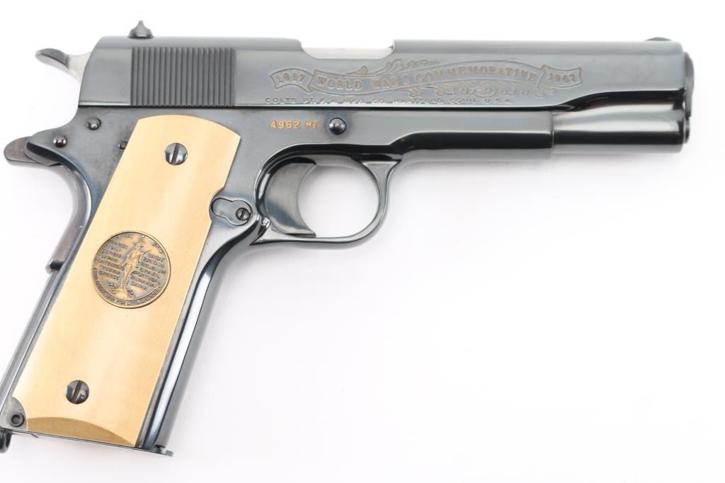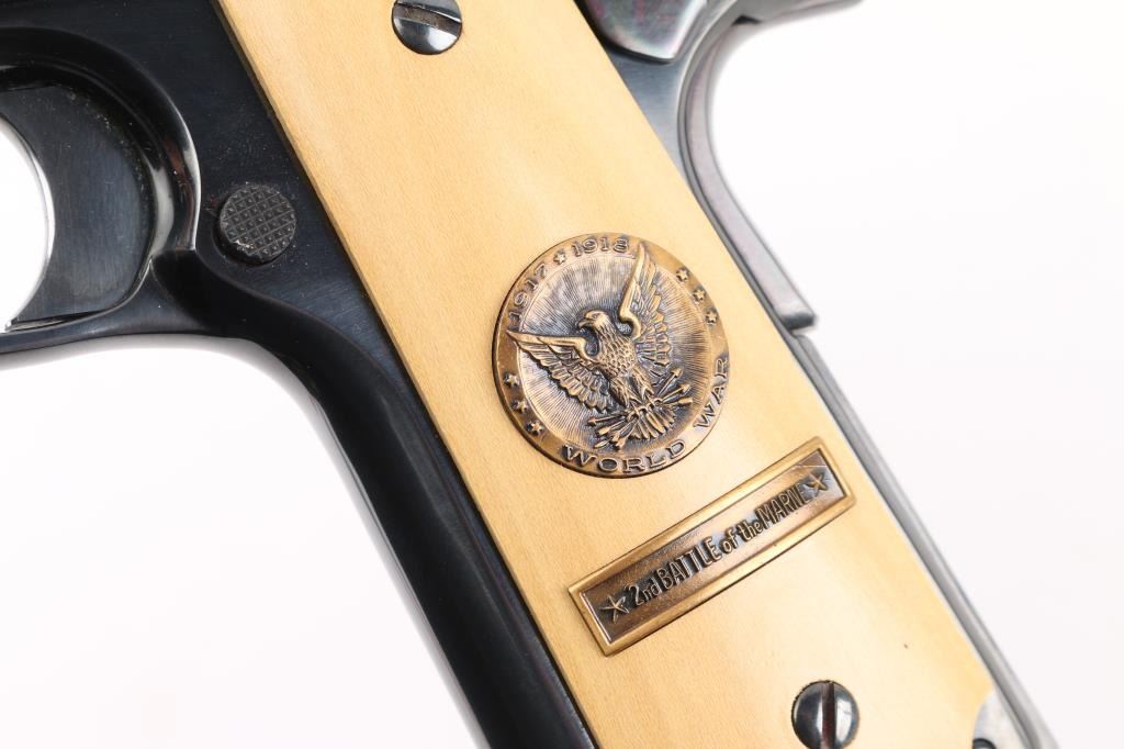 SN:4962-M2 Pistol. Semi-Automatic. 7+1 capacity. In 1968 Colt wanted to commemorate WW1 by producing a Model 1911 in remembrance of the 4 most noted battles of WW1. This pistol is for the 2nd battle of the Marne. Production for each model was 7400. All were Pre-series model 70's with flat mainspring housings, long triggers, checkered slide stop and safety. Checkered wide hammer spur, and type 2 beveled proper rear sight. High polish blue finish with polished blond grips, Ivory in appearance. The left slide has a roll engraved battle scene, and the right has the WW! banner with "1917-1967, the 50th anniversary of entering the war. All gold toned. Left grip has Eagle medallion with "1917 1918, World War" with "2nd battle of the Marne" under it. Right grip was Doughboy medallion listed the Countries that fought in WW1. Lanyard ring in place. Bore is excellent/bright. Slide action is smooth/tight. Blued finish is about 99% with some minor scratches on the mainspring housing and frame. Grips are excellent. Comes with original Colt magazine. NRA Condition-Excellent. C&R Firearm.