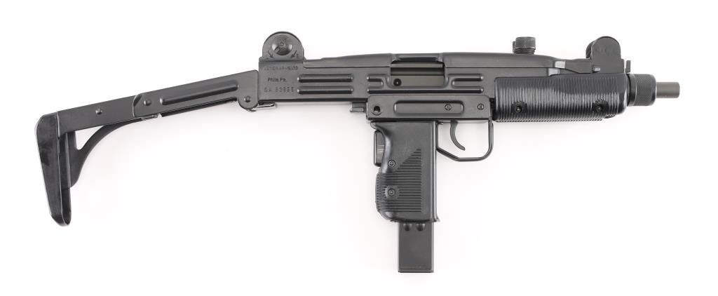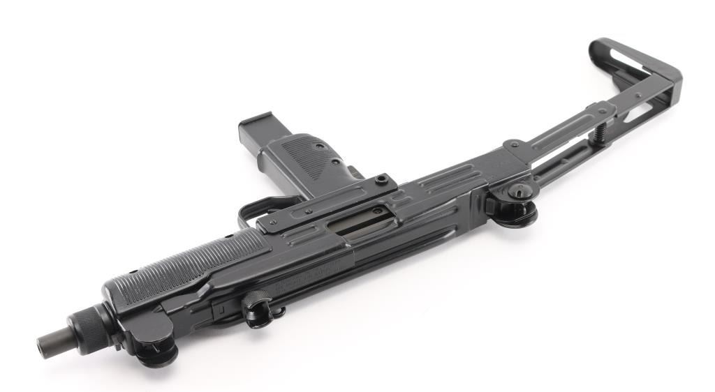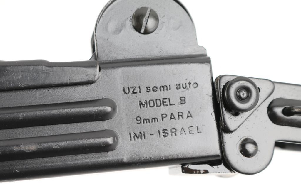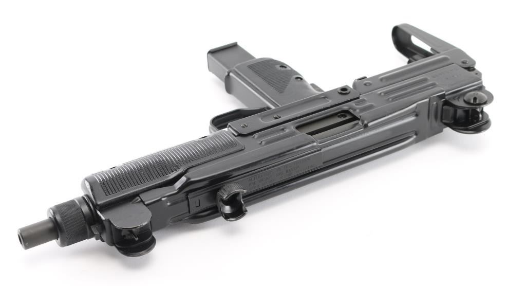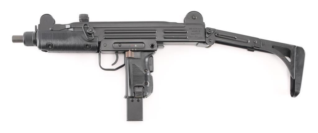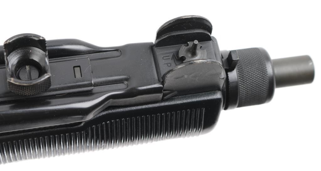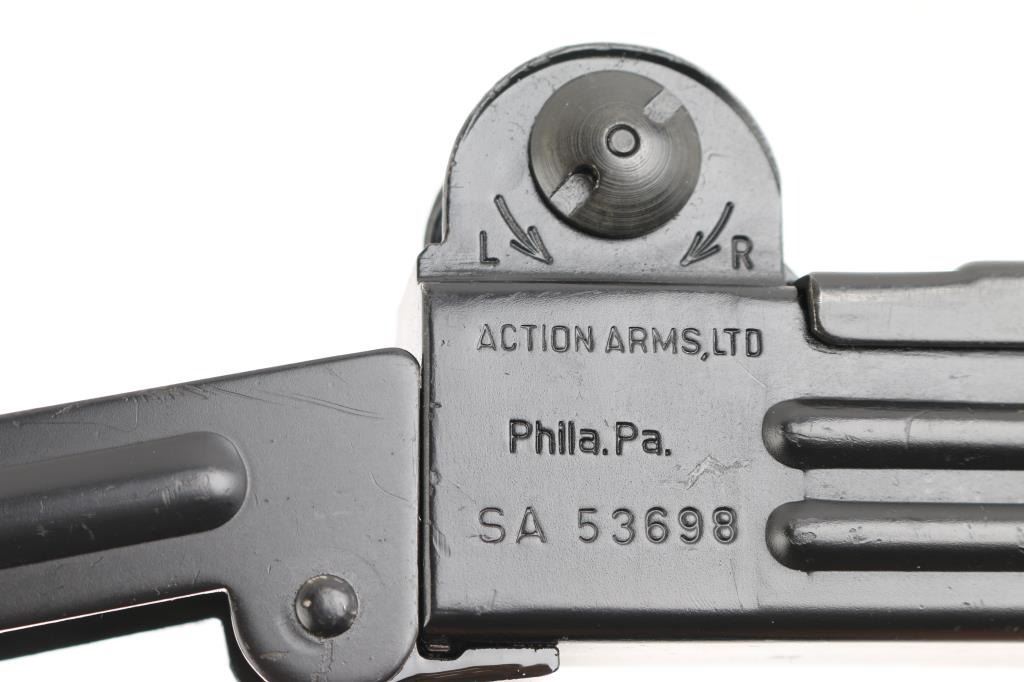 w/ IMI/Action Arms Uzi Model B 9mm SN:SA53698. The bolt is a fully transferable machinegun. Together the pair provide a fully featured select fire Uzi submachinegun. Features approx 8.75" barrel, black semi-gloss paint finish on all metal, black polymer grip and forend panels, bayonet lug, grip safety, forward sling swivel, rear sling bar, elevation adjustable protected post front sight, windage adjustable protected peep rear sight (two selectable ranges), manual safety/selector on left side at top of grip. Machine gun is near perfect condition, with bright bore and few signs of handling or firing. Few minor edge losses, little loss of finish where stock rubs when opening. Includes one excellent condition steel 25 rd magazine. Condition is near NRA Perfect ***NFA Firearm*** ***Fully Transferable***