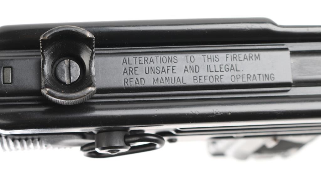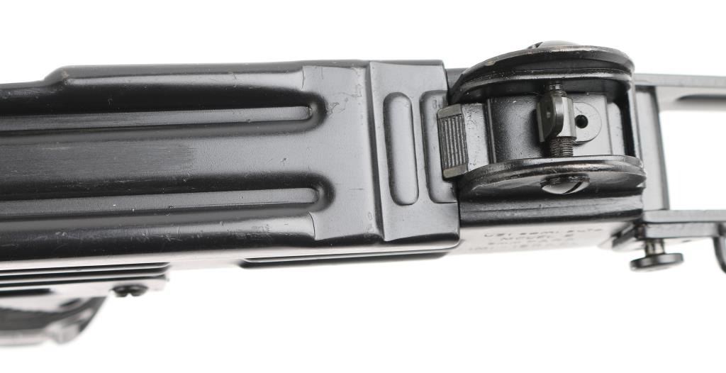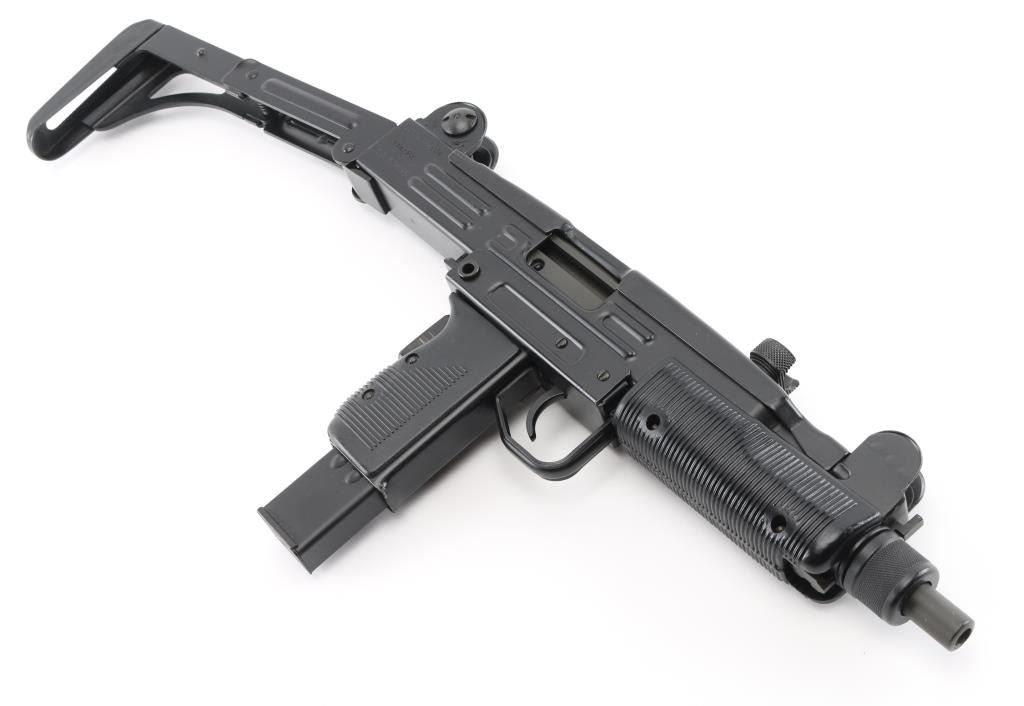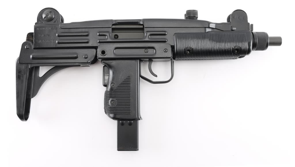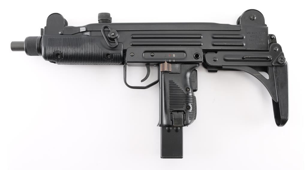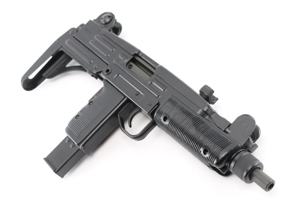 w/ IMI/Action Arms Uzi Model B 9mm SN:SA53698. The bolt is a fully transferable machinegun. Together the pair provide a fully featured select fire Uzi submachinegun. Features approx 8.75" barrel, black semi-gloss paint finish on all metal, black polymer grip and forend panels, bayonet lug, grip safety, forward sling swivel, rear sling bar, elevation adjustable protected post front sight, windage adjustable protected peep rear sight (two selectable ranges), manual safety/selector on left side at top of grip. Machine gun is near perfect condition, with bright bore and few signs of handling or firing. Few minor edge losses, little loss of finish where stock rubs when opening. Includes one excellent condition steel 25 rd magazine. Condition is near NRA Perfect ***NFA Firearm*** ***Fully Transferable***