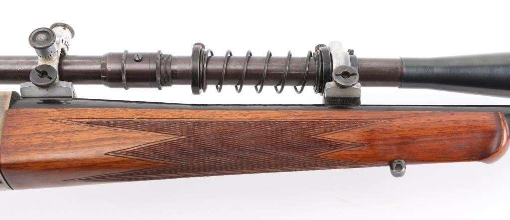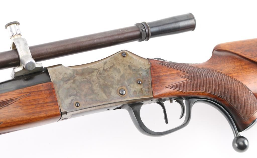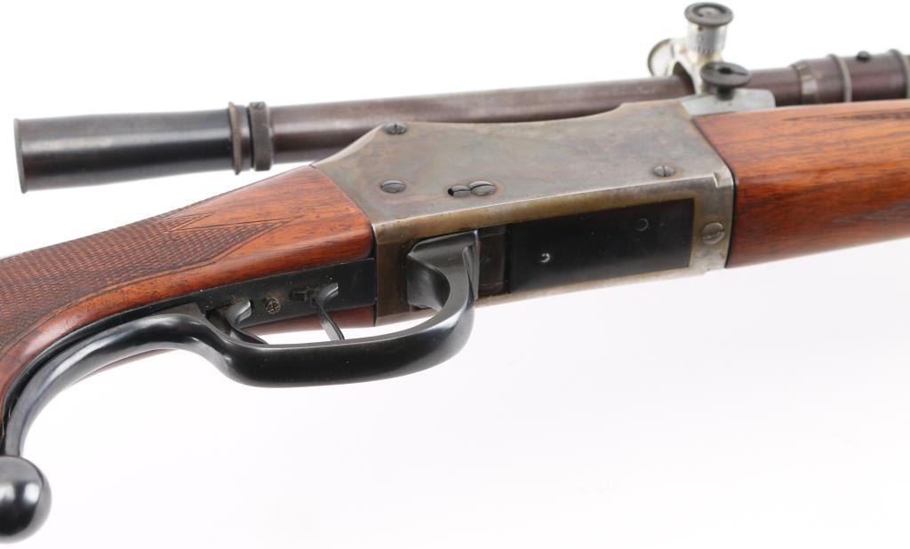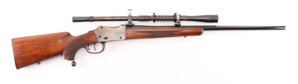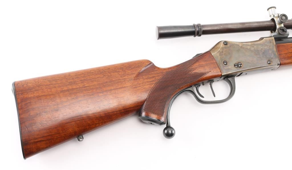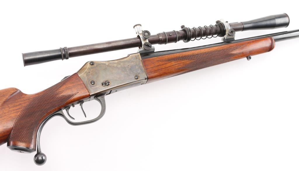 PAUL YAEGER CUSTOM MARTINI GERMAN VARMIT RIFLE, 220 Swift, ,single-shot, falling block action. sling swivel eyelets, 26” tapered round blue barrel. marked “Paul Yaeger-Jenkintown PA”, no provision for open sights, knobbed action lever, gold case colored receiver, double set trigger, sliding tang safety. Beautiful French walnut highly figured stocks with fine checkering on the forearm, and wrist, shadow line cheek piece for right-handed shooting steel checkered 'Neidner' style butt plate. Mounted with a 1930's vintage J.W. Fecker scope, Serial number 8063, recoil spring, fine crosshairs, screw on steel lens covers,Fecker adjustable rings. Unertl based his scopes on Feckers, clear optics. Paul Yeager (1901-1993) is a very well known maker of German hunting rifles. Bore is excellent/bright, wood and finish are excellent, action is smooth/tight. Comes with approx. 50 rounds of reloads. NRA Condition-Excellent. C&R Firearm.