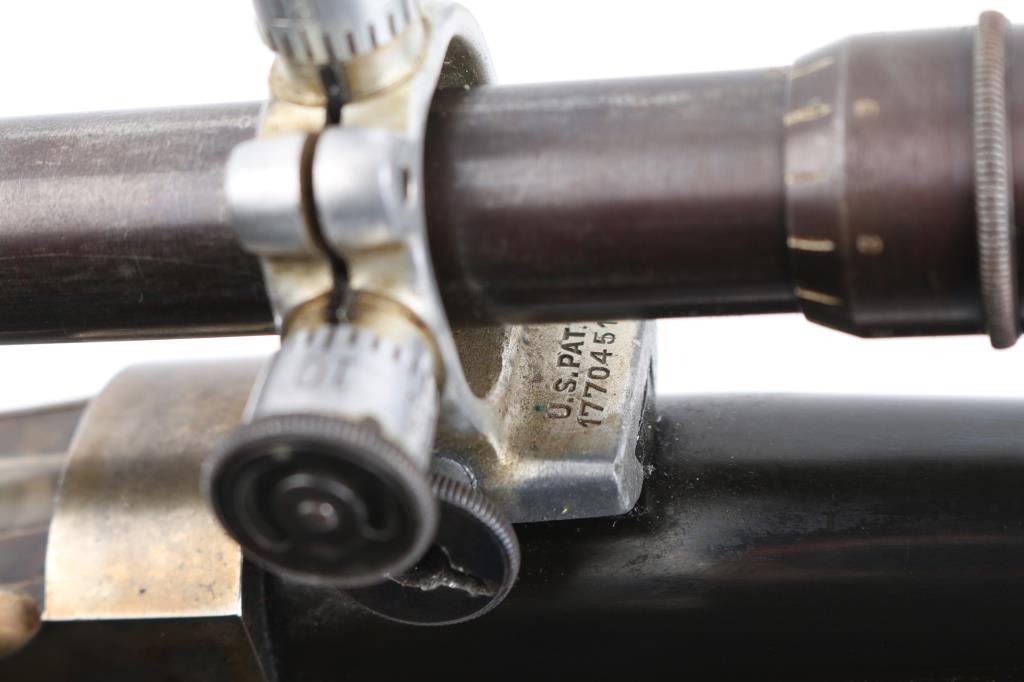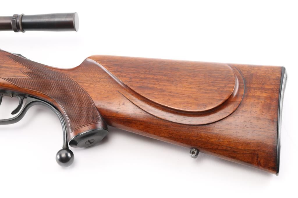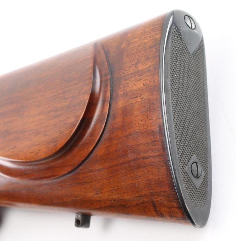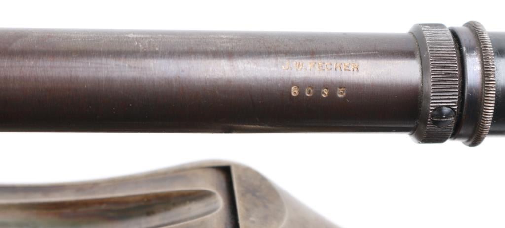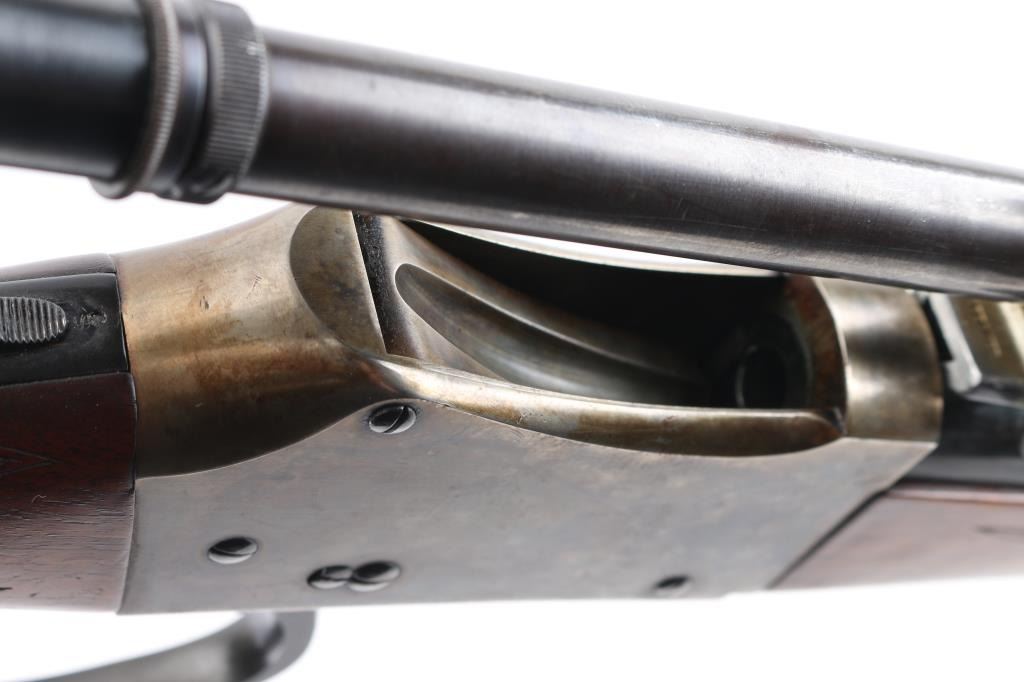 PAUL YAEGER CUSTOM MARTINI GERMAN VARMIT RIFLE, 220 Swift, ,single-shot, falling block action. sling swivel eyelets, 26” tapered round blue barrel. marked “Paul Yaeger-Jenkintown PA”, no provision for open sights, knobbed action lever, gold case colored receiver, double set trigger, sliding tang safety. Beautiful French walnut highly figured stocks with fine checkering on the forearm, and wrist, shadow line cheek piece for right-handed shooting steel checkered 'Neidner' style butt plate. Mounted with a 1930's vintage J.W. Fecker scope, Serial number 8063, recoil spring, fine crosshairs, screw on steel lens covers,Fecker adjustable rings. Unertl based his scopes on Feckers, clear optics. Paul Yeager (1901-1993) is a very well known maker of German hunting rifles. Bore is excellent/bright, wood and finish are excellent, action is smooth/tight. Comes with approx. 50 rounds of reloads. NRA Condition-Excellent. C&R Firearm.