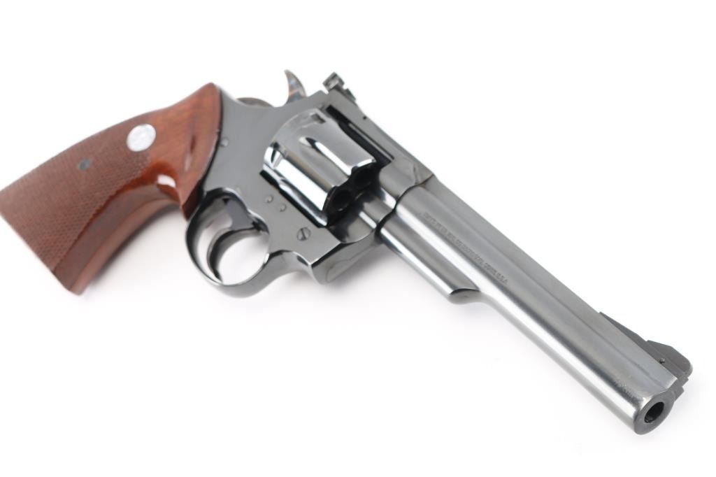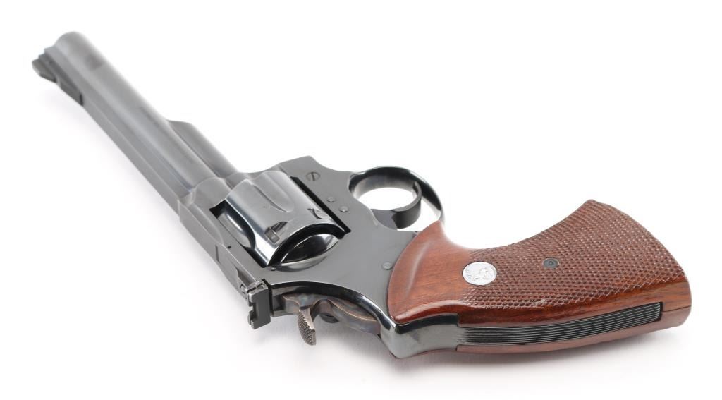 Double-action revolver chambered in .357 Magnum. Manufactured circa 1973. Features a blued finish, 6" barrel with solid top rib, shrouded ejector rod, raised & pinned ramp front sight, adjustable rear sight, fluted six-shot cylinder, smooth trigger, case hardened hammer with knurled wide spur and two-piece walnut checkered grips with rampant Colt medallions. Serrated backstrap. Bore is excellent. Revolver appears nearly new with faint cylinder drag line,and slight muzzle wear, few signs of handling. Grips are excellent. Condition is NRA Excellent -C&R Firearm.