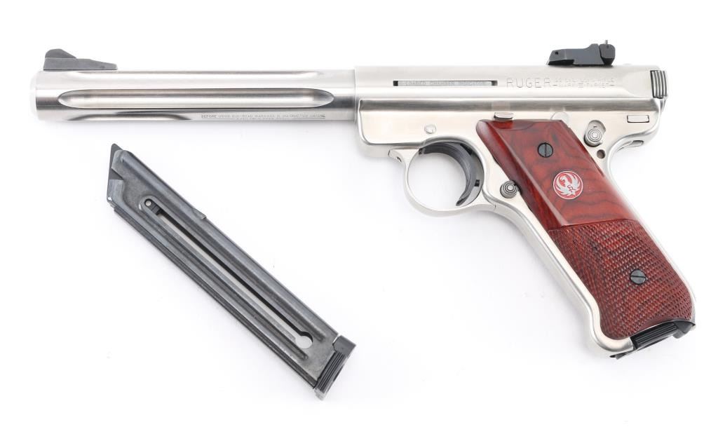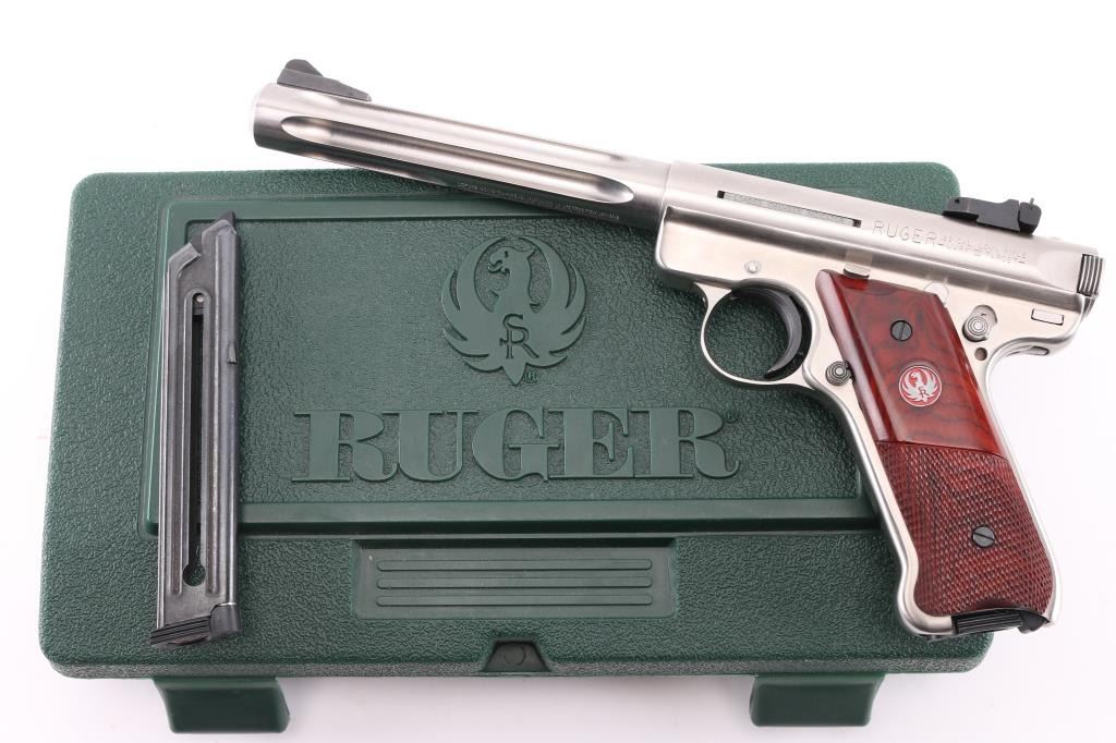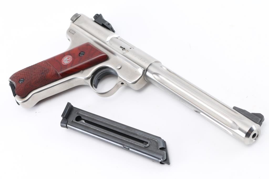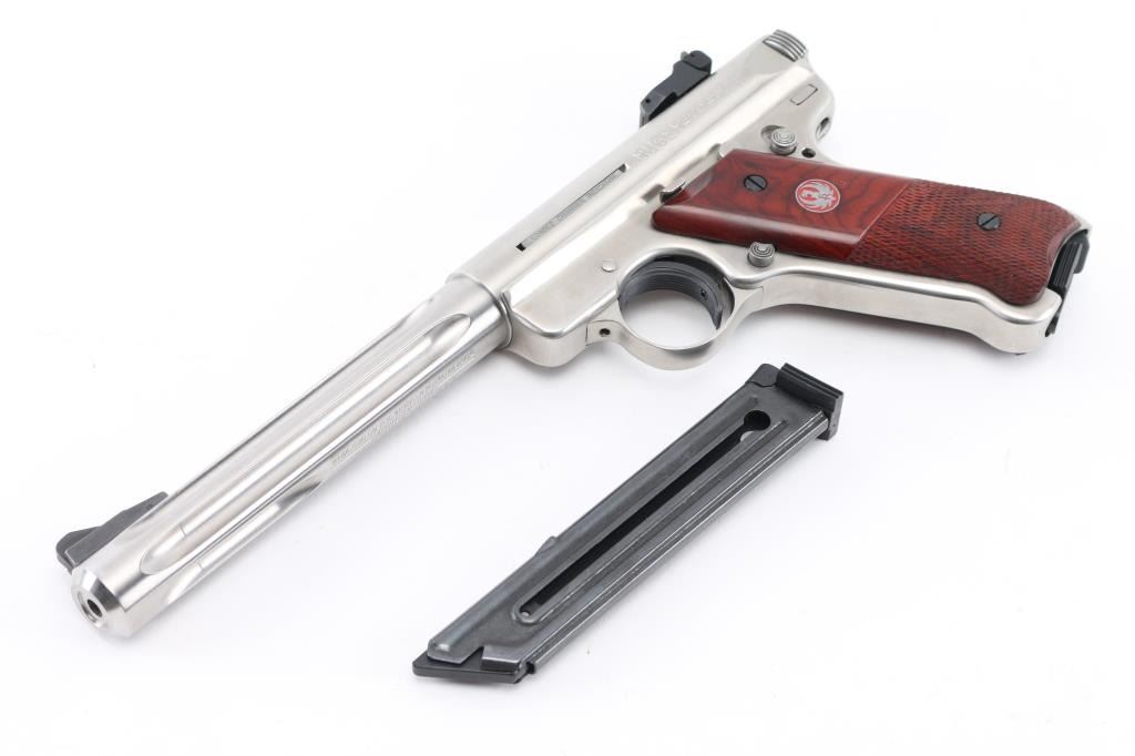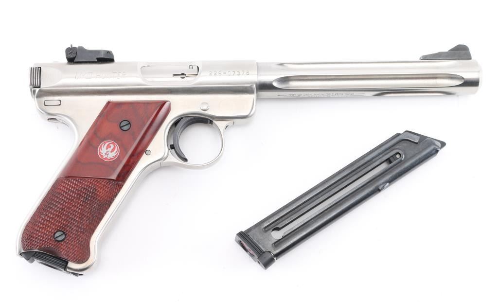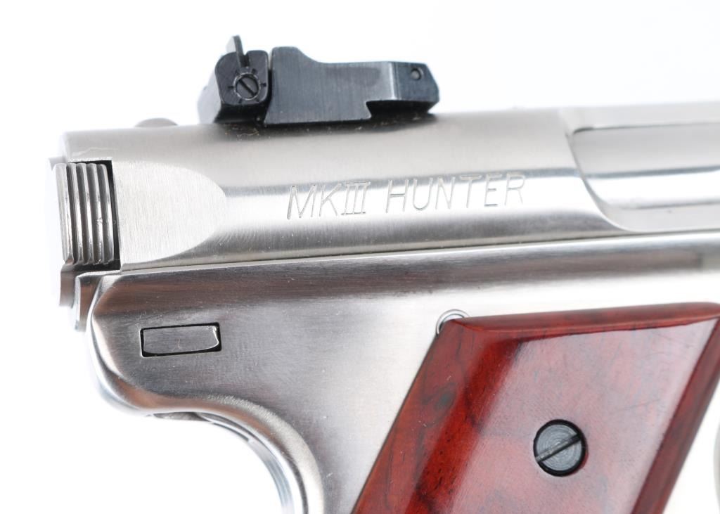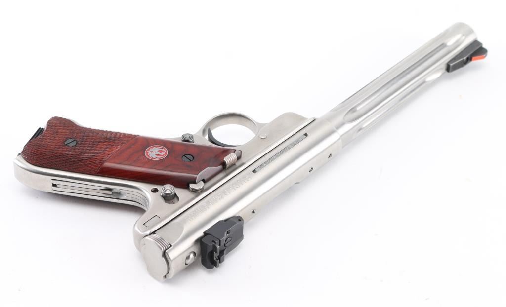 Rare MARK III HUNTER Blowback operated single action semi-automatic target pistol chambered in .22 Long Rifle, manufactured circa 2005. Features a stainless steel finish, stainless steel 6.88" fluted heavy barrel with recessed crown, raised red optic front sight, adjustable rear sight, wide serrated trigger, loaded chamber indicator, thumb safety on the left side of the frame, internal locking safety, cocking serrations on the bolt, push button magazine release, factory 10 round magazine, and checkered/smooth wood grips with red eagle medallions. Includes the original factory green plastic hard case with key, manual, spent case, lock, factory scope rail, green and red inserts for optic sights and spare magazine. Pistol is new in box condition. Condition is near NRA Perfect in case. Modern Firearm.
