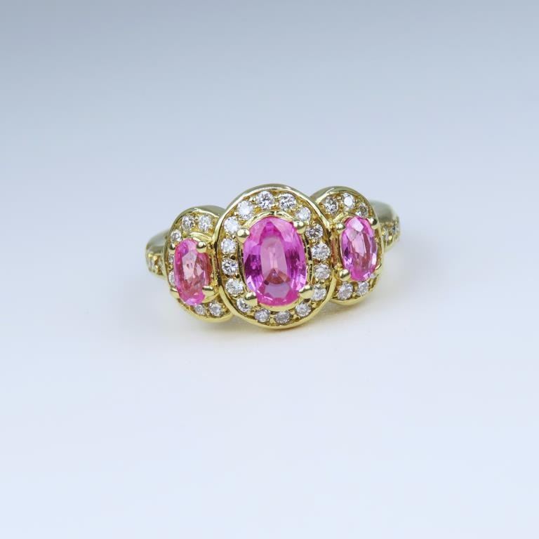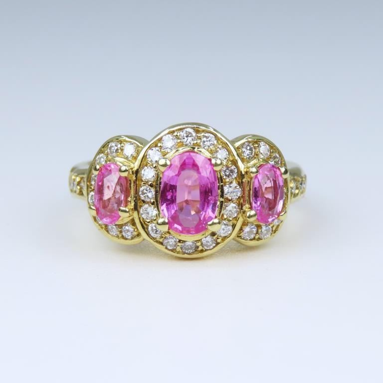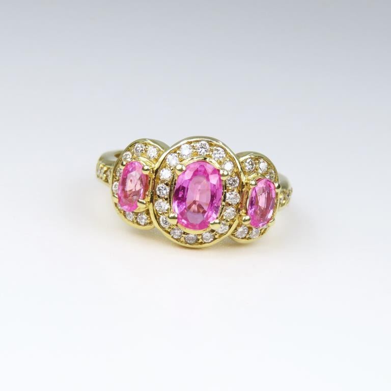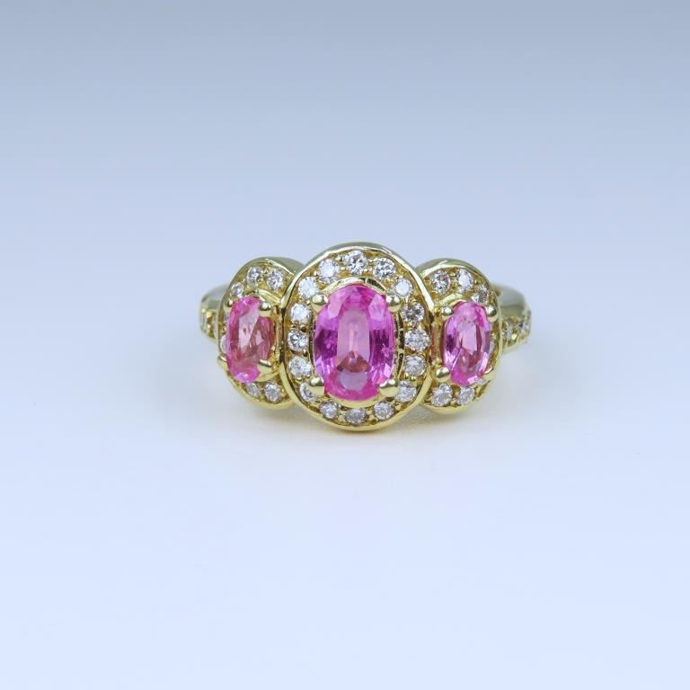 featuring 3 oval cut Pink Sapphires weighing approx. 2.00 carats with vivid pink color accented with 38 round ‘IDEAL’ cut Diamonds weighing approx. 1.00 carats with G-H color and VS clarity set in 14 karat yellow gold setting. Size 7. Retail $5,000-$6,000