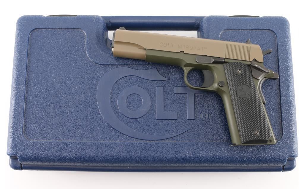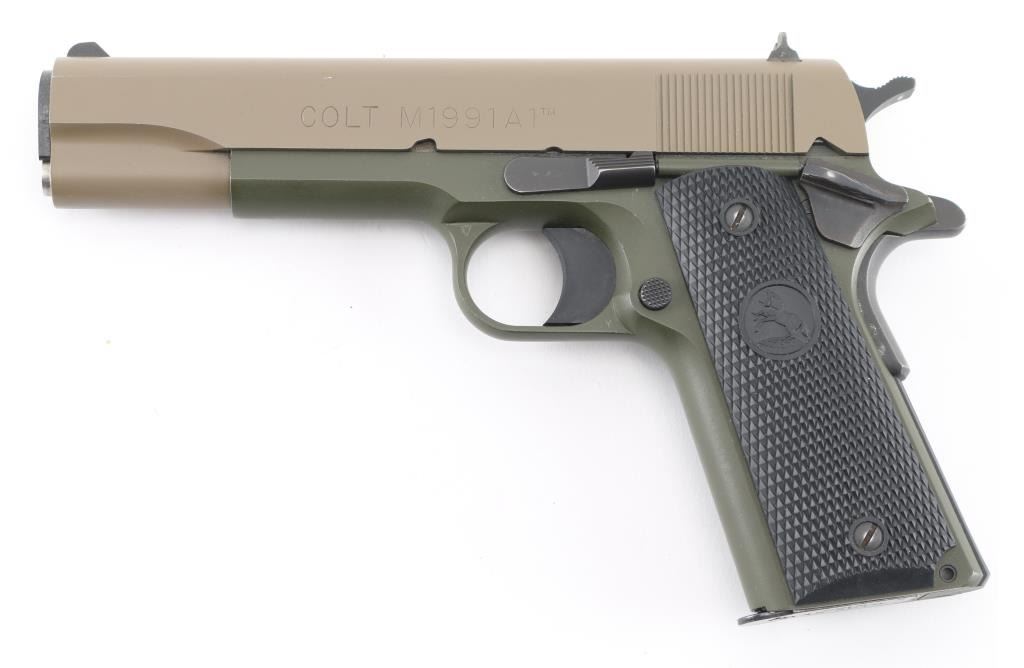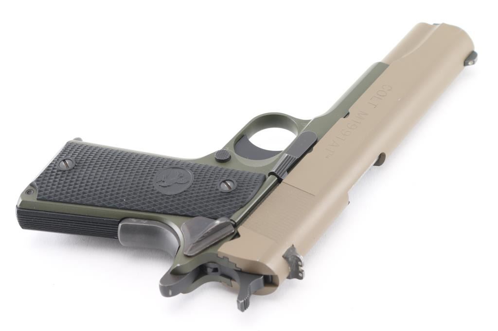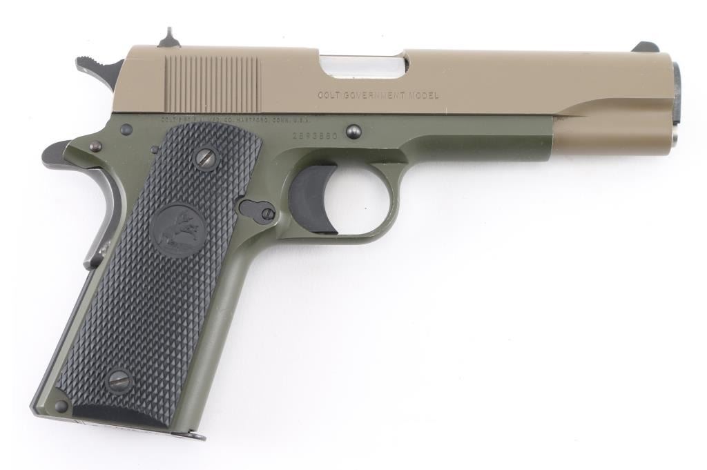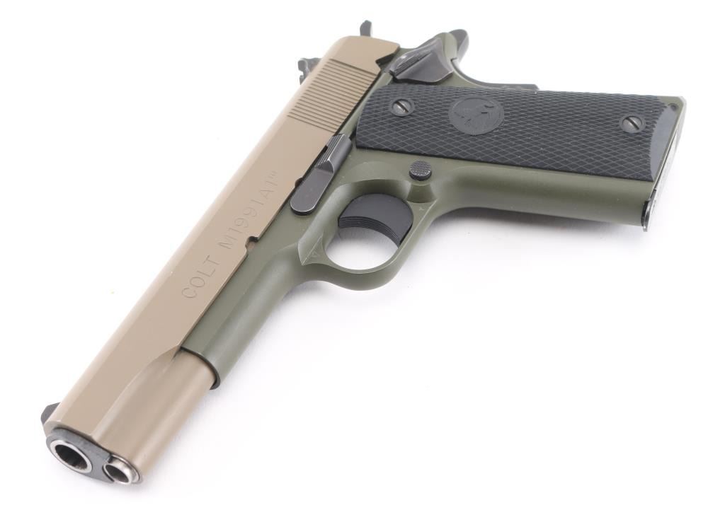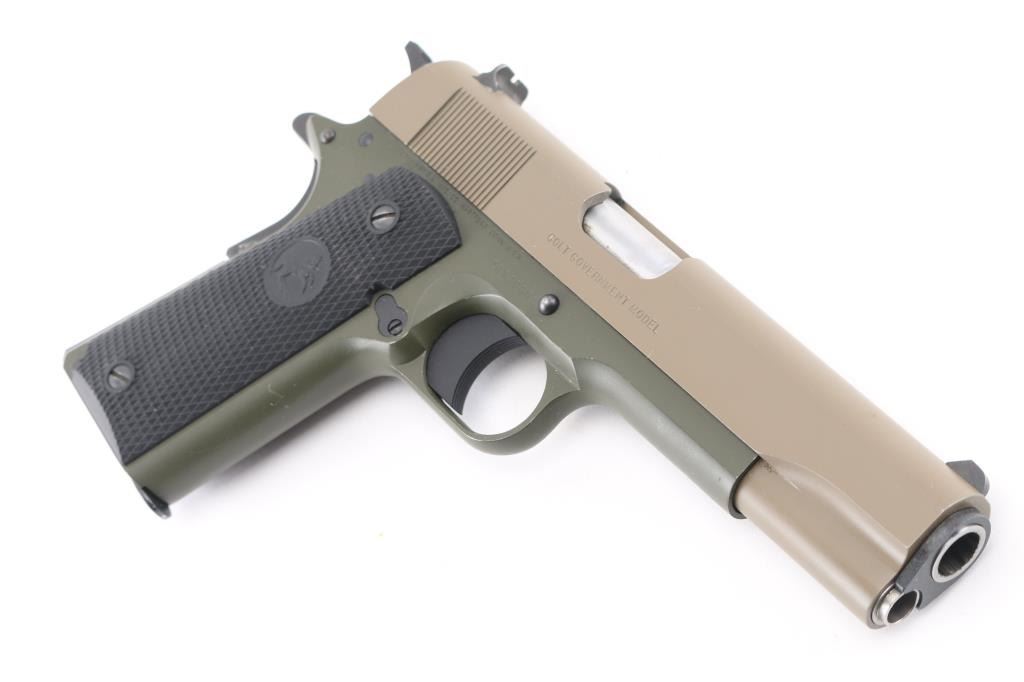 This is a 1911 style semi-auto pistol chambered for .45 ACP ammunition circa 2017. This is a Talo Distributor exclusive. This is one of only 300 of these Cerakote FDE slide over OD Green frames made. It has a 5" barrel, a fixed white dot front sight, dovetailed two dot rear sight, serrated trigger and hammer spur and black checkered rubber grip panels with the Rampant Colt on a globe. Metal finish looks very good with one tiny ding on the left side of the slide above the O in Colt. The bore looks very good, dusty. Grips are fine. Comes with original blue hard case, owners manual, one magazine and lock. Condition is NRA Very Good+. *Modern Firearm*