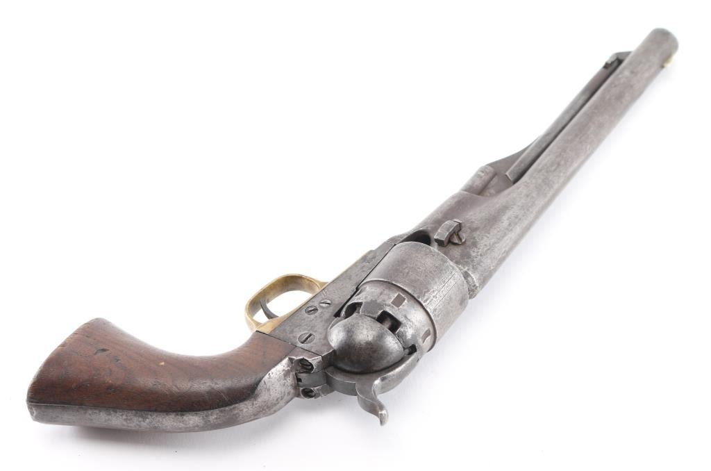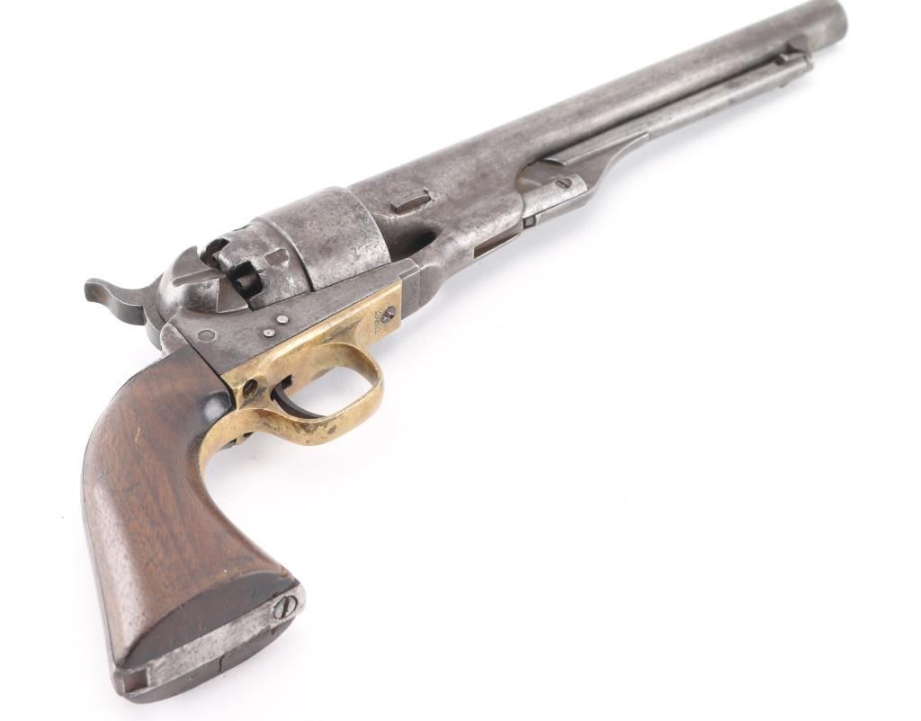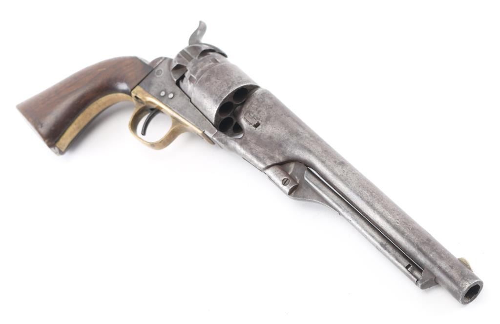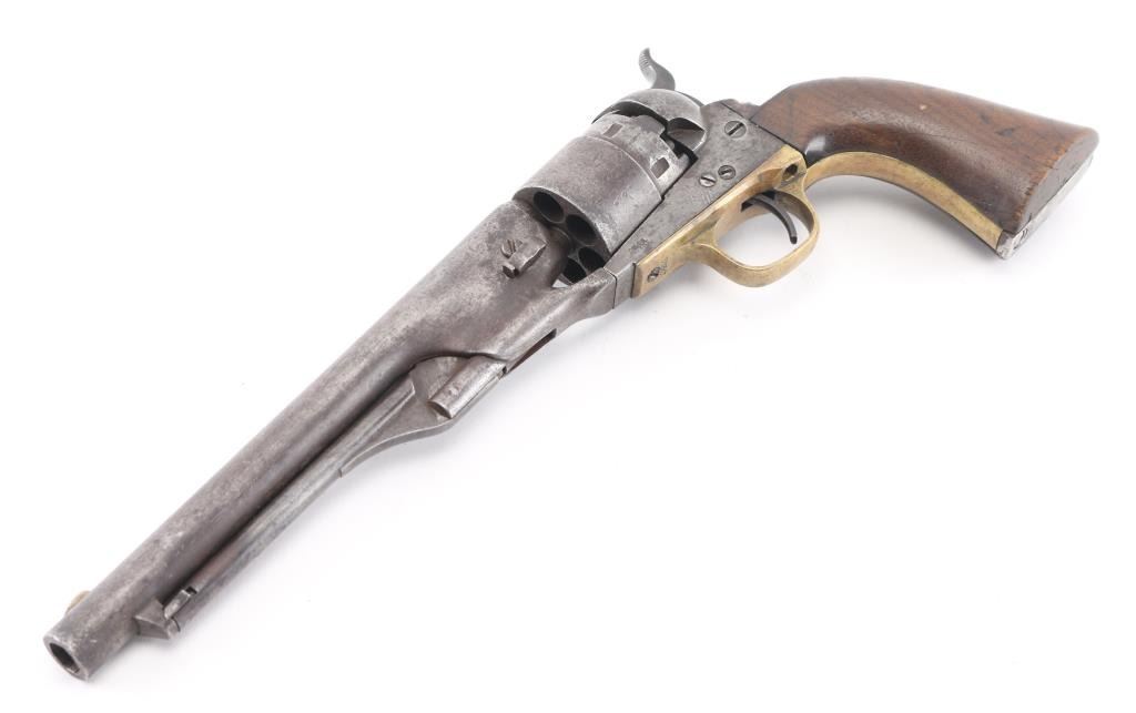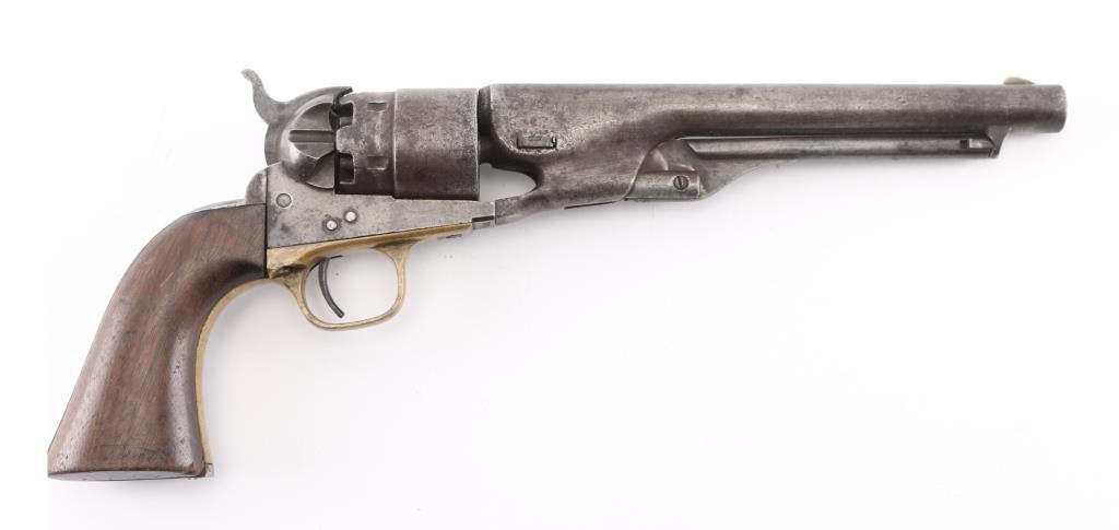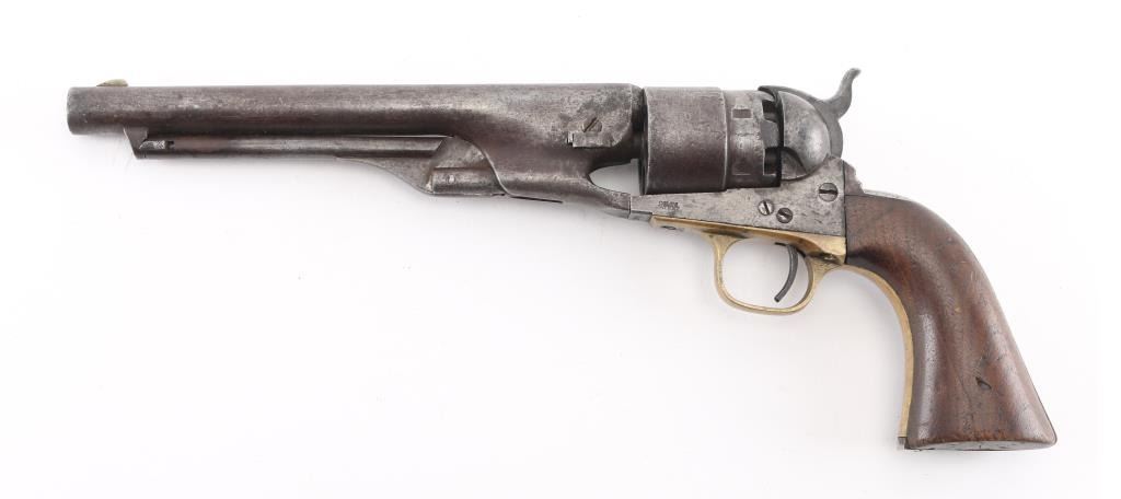 Martially marked & inspected single action percussion revolver issued to the Union Army during the American Civil War, manufactured circa 1863. Features an 8" round barrel, German silver blade front sight, 'v' notch rear sight cut into the hammer lip, smooth thin trigger, knurled hammer spur, non-fluted six shot cylinder with roll stamped Naval Engagement scene, loading lever, round brass trigger guard, steel backstrap, shoulder stock cuts in the recoil shield & butt and one-piece oil finished smooth walnut grip with boxed cartouches (illegible). All observed serial numbers match including the barrel, cylinder, frame, trigger guard and backstrap. Inspector marks include: Barrel - "D" & "D". Cylinder - "D" & "D". Trigger guard - "H". & Backstrap - "H". The barrel address has been removed and the barrel wedge has been installed with an additional metal shim. Revolver displays a mottled aged grey/brown patina with approximately 20% cylinder scene intact. Revolver is mostly functional though the cylider has the ability to spin counterclockwise when the hammer is down.The bore shows strong rifling & scattered light rust, the remaining marking are good and the walnut grip is fair to good with blemishes & repaired crack on the left side. Condition is NRA Good. ***Antique Firearm***