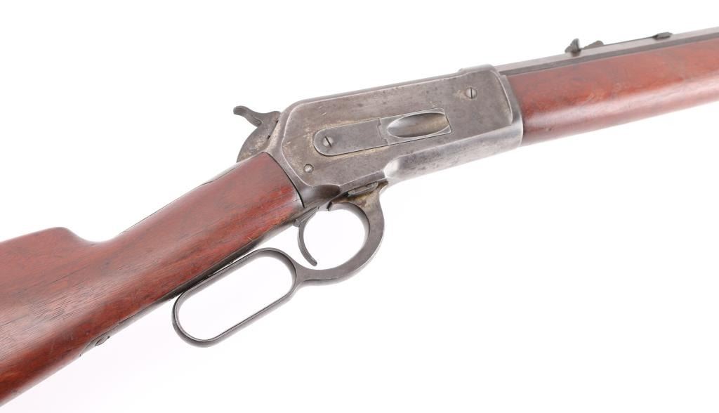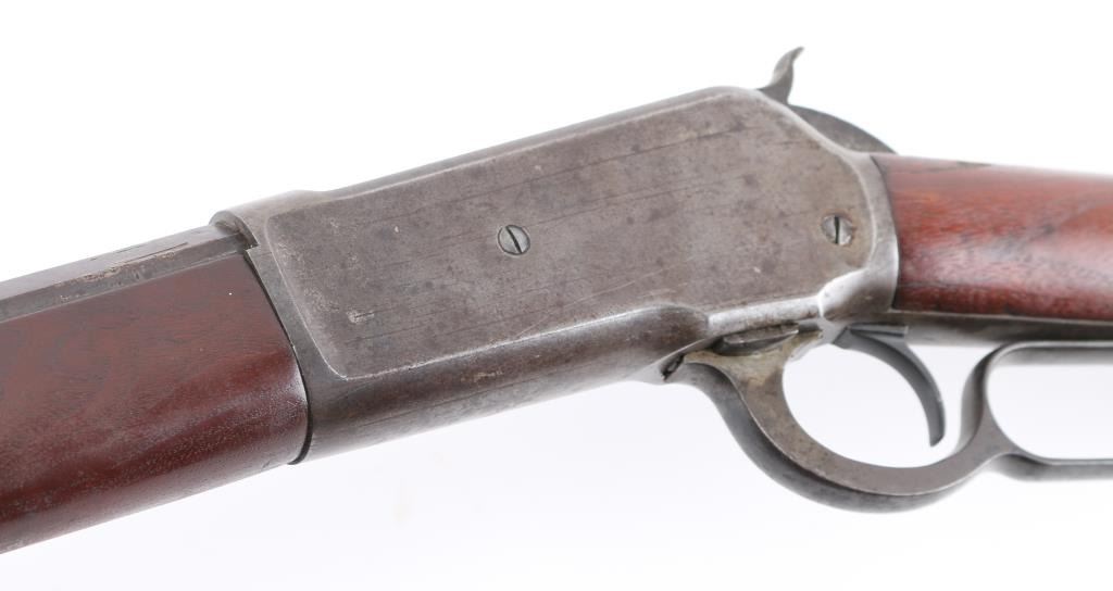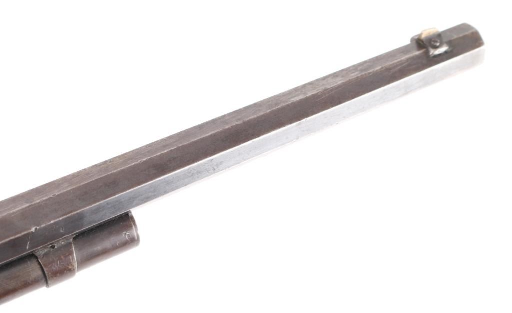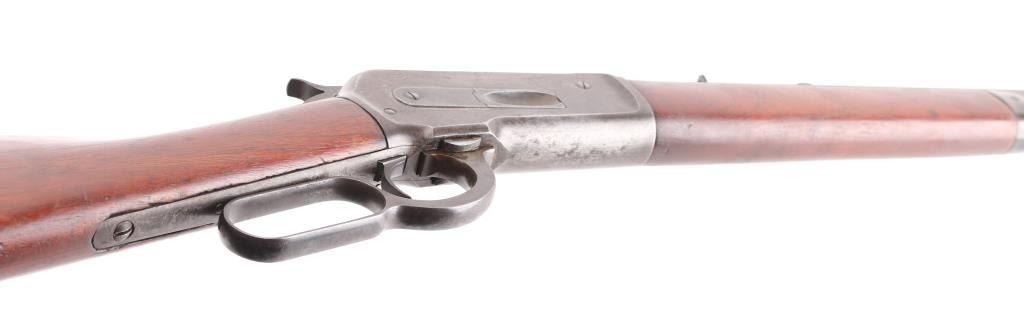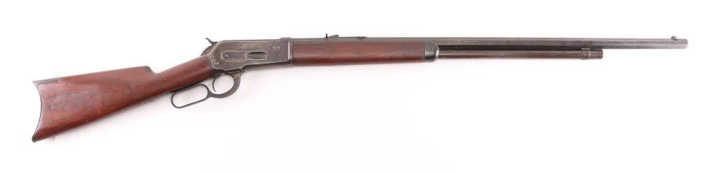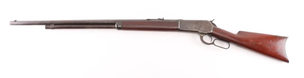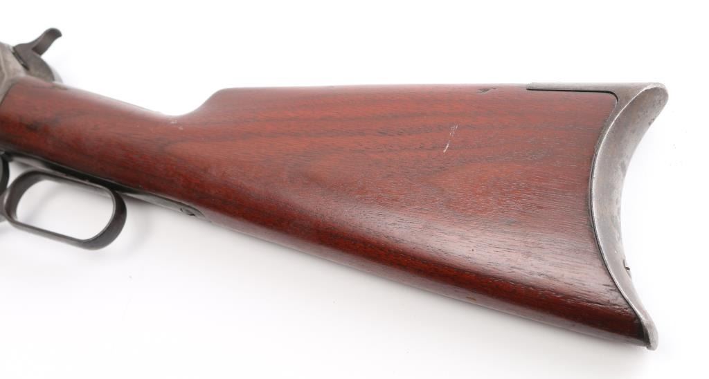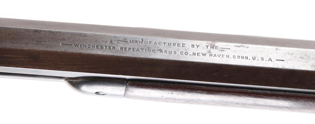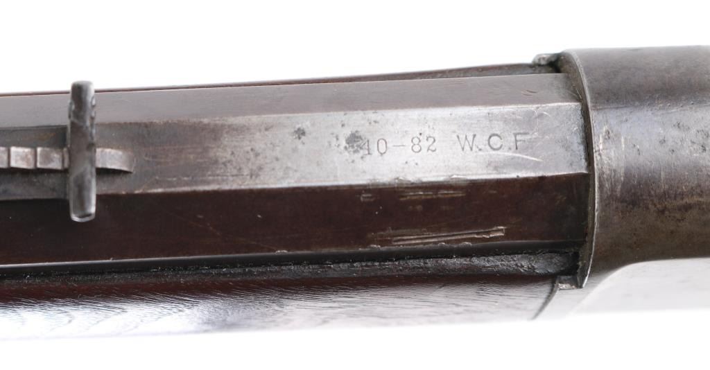 Antique large frame lever action repeating rifle chambered in .40-82 Winchester, manufactured in New Haven, CT circa 1889. Features 30" octagon barrel, 3/4 magazine tube, appears to have been shortened. dovetailed brass blade front sight, adjustable rear sporting sight, smooth trigger, knurled hammer spur, smooth walnut forend with metal cap and straight grip shoulder stock with crescent buttplate. The rifle exhibits mostly a mottled grey/brown patina with traces of dull blue, scratches & dings. The action is sound, the bore is good with light scattered pitting, rifling present. The wood stocks are very good, appear to have been refinished at some point. Condition is NRA Good. Antique Firearm,