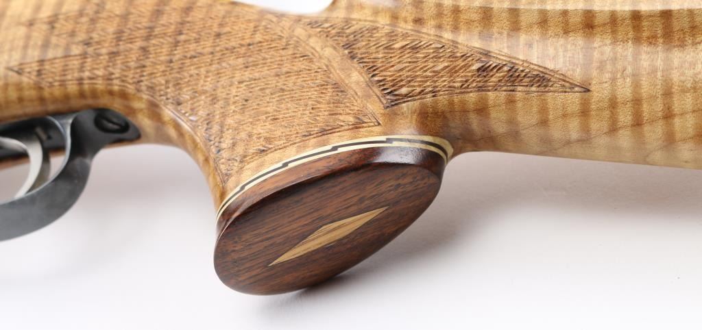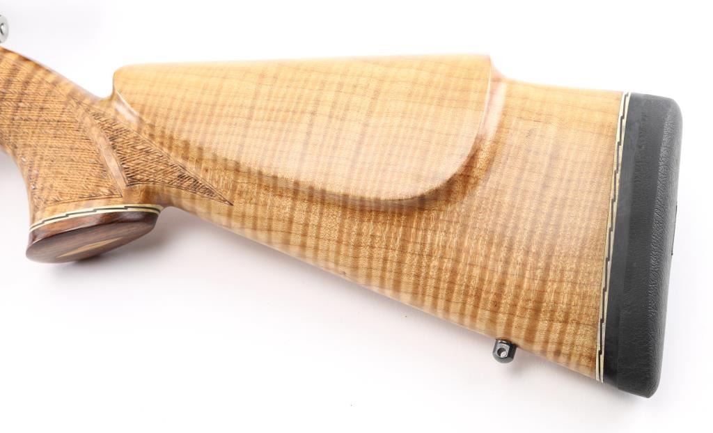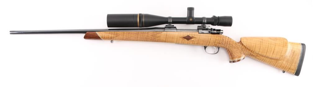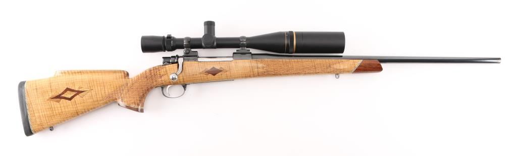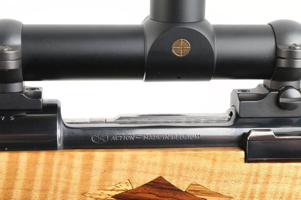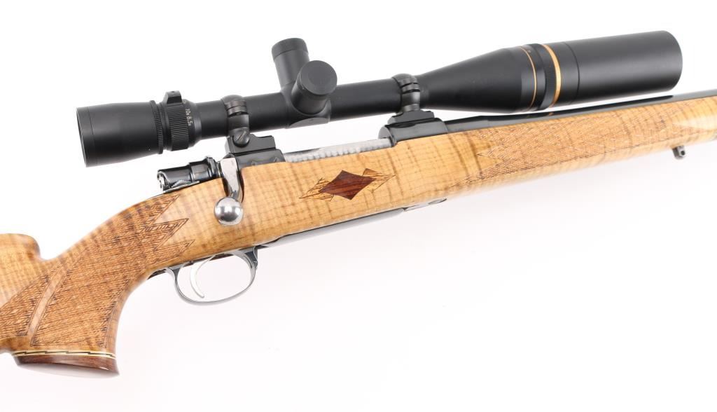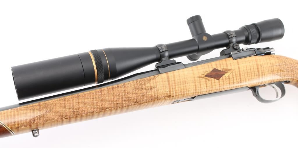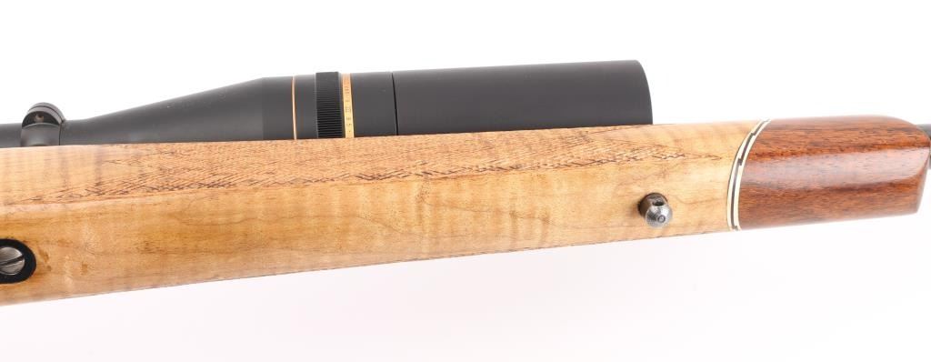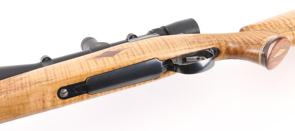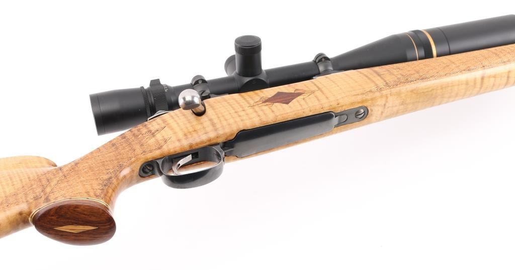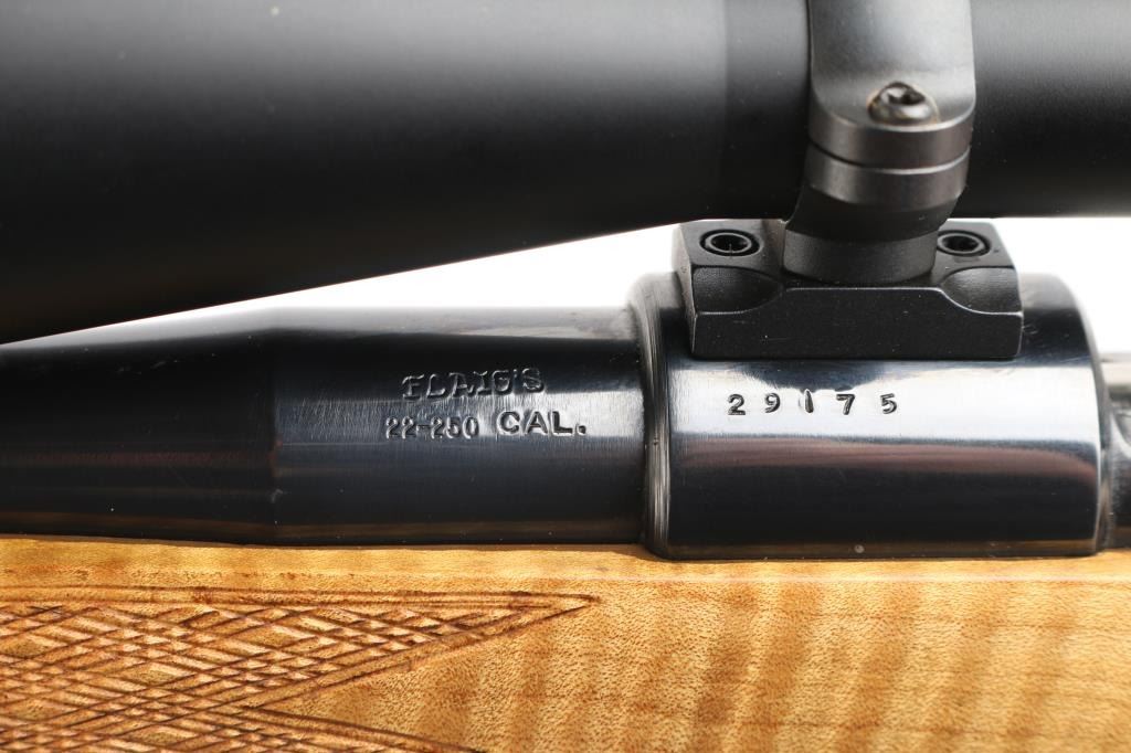 Custom sporting rifle built on a Belgium made FN Mauser. Barrel is marked 'Flaig's' 22-250 Cal. 24" tapered barrel, blued finish, jeweled bolt with knurled flat sided knob. Striped maple stock with contrasting forearm tip and grip cap, contrasting wood diamond shaped inserts inletted the stock and grip cap, checkering on the forearm and wrist, black rubber recoil pad, sling swivel studs, manual safety. Mounted with a Leupold Vari-X III 8.5-25 with sun shade, clear optics. Bore is excellent/bright. action is smooth, wood and finish are excellent. Comes with approx. 50 rounds of reloads. NRA Condition-Excellent. C&R Firearm.