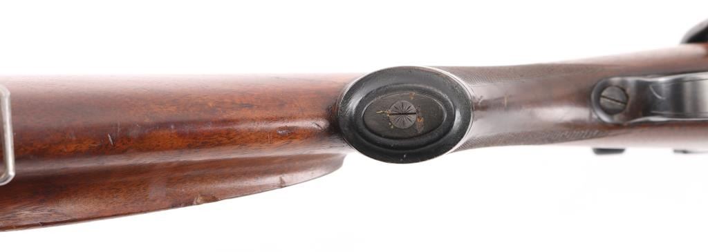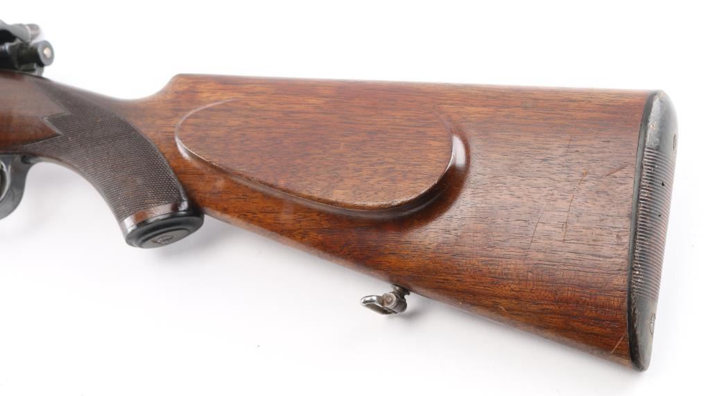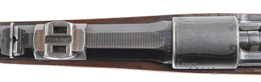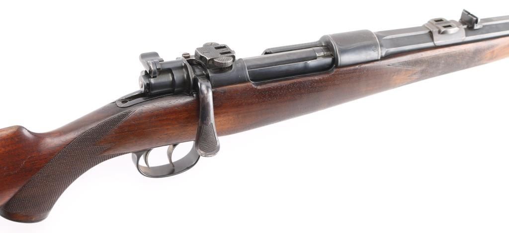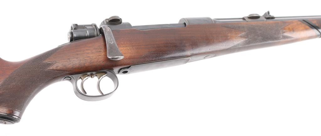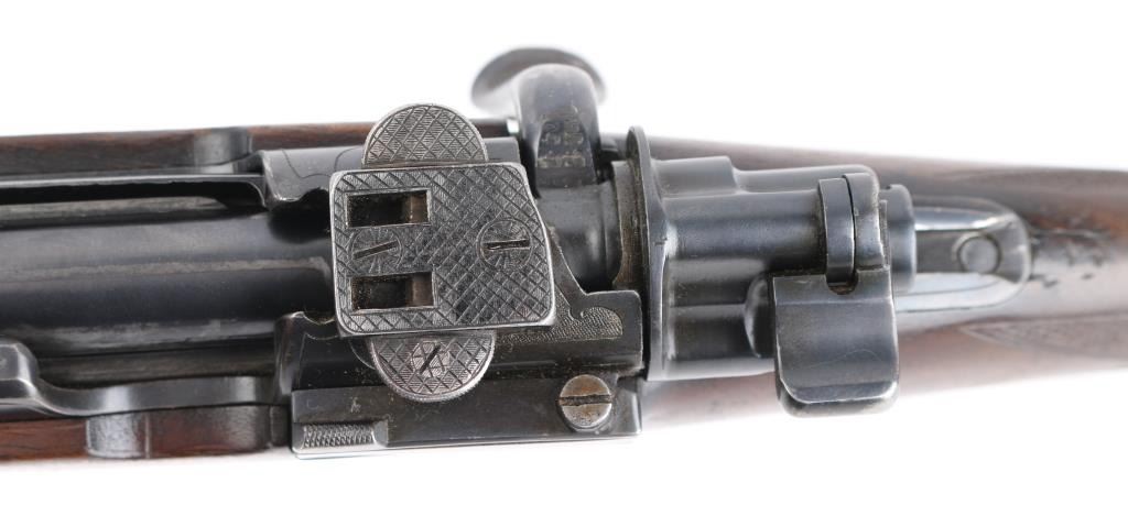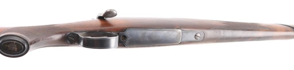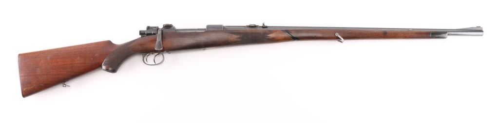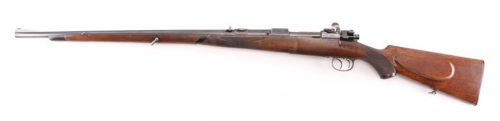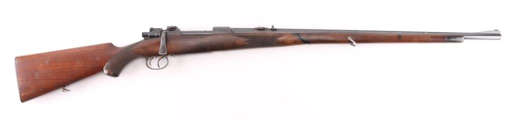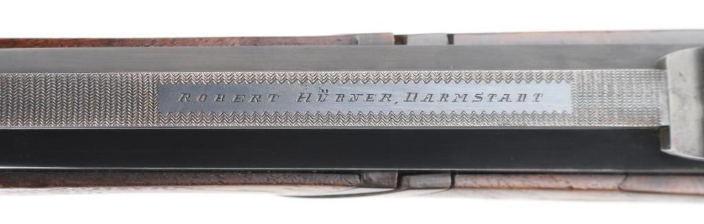 Custom made rifle by "master Rifle Maker" Robert Hubner. 27" Krupp steel round/octagonal ribbed barrel with ramp bead front and flip 2-notch rear sights, "ROBERT HUBNER" and "DARMSTADT" on rib. blue receiver with "crown/ letter" proofs, double set triggers, Mauser 3-position safety on bolt shroud , 'butter knife' bolt handle and double claw mounts. Checkered two- piece pistol grip stock with ebony fore tip, and forearm spacers, horn grip cap, shadow line cheek piece. Bore is excellent/bright, action is smooth/tight, wood is very good with minor scratches/dings, and a little finish loss under the bolt handle. Blue finish is about 85% with friction wear on the bolt, and some handling loss on the bolt handle, bolt release, floor plate & barrel. NRA Condition-Very Good. C&R Firearm.