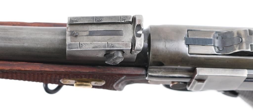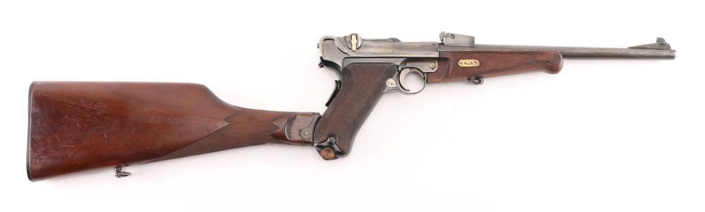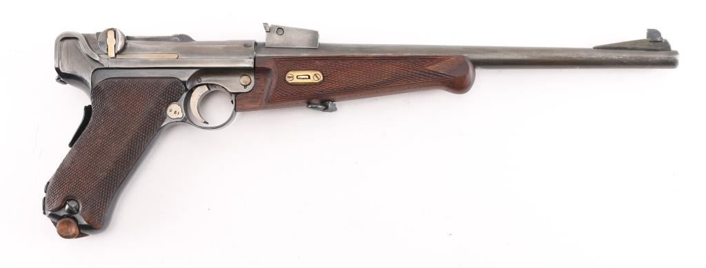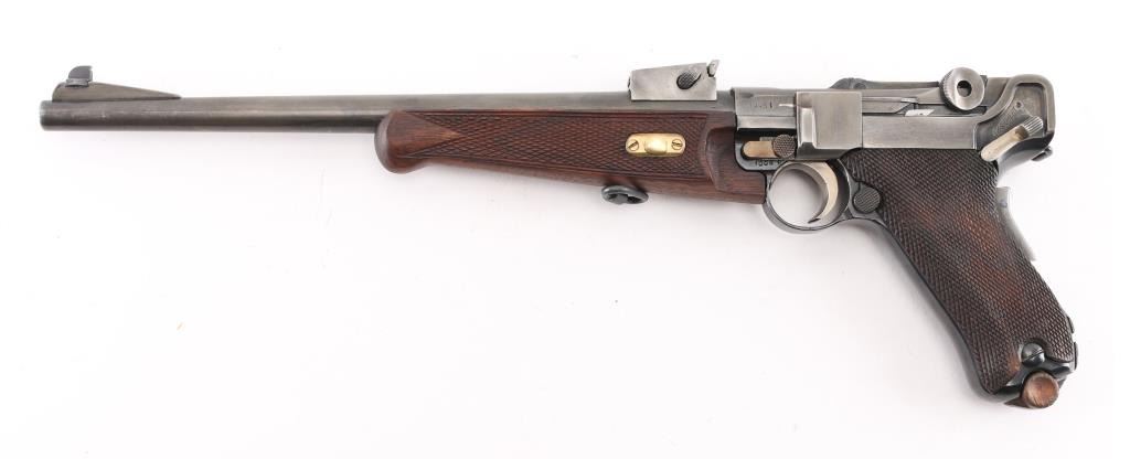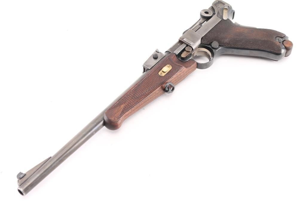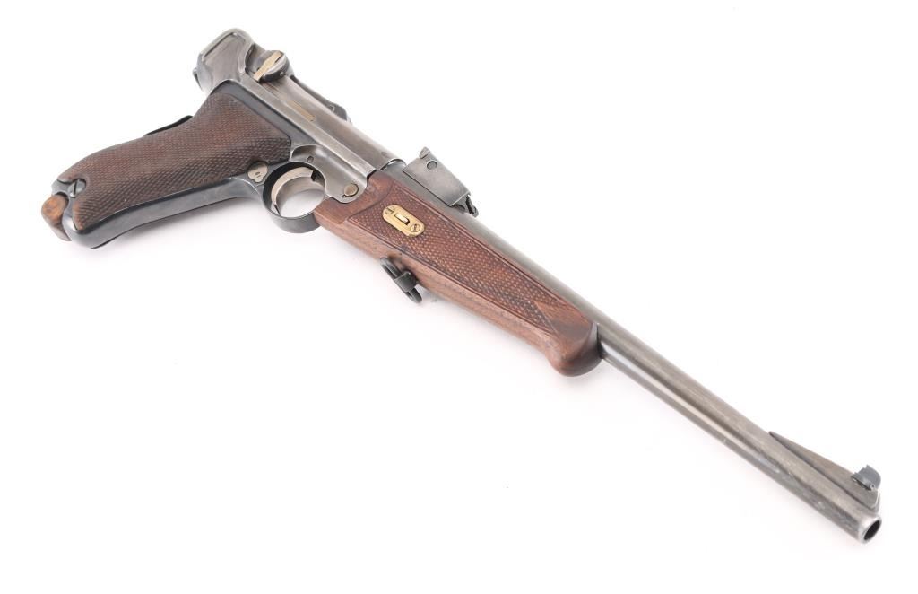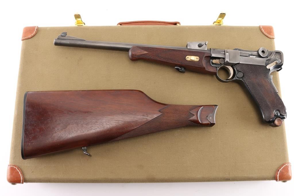 Custom 1902 Luger carbine. The forearm is a newer replacement, the sights are incorrect, the serial numbers on the frame, toggle link, magazine plug, & barrel extension appear to been re-stamped. Cannot remove forearm Stock is numbered '347', with incorrect wood butt stock. toggles appear to have been grinded down to give a dished apperence.11 3/4 inch barrel, short forend , grip safety, and recessed/flat breech bolt. . The top of the chamber is blank, and the front toggle linkhas the DWM logo for "Deutsche Waffen und Munitions Fabriken". Housed in a custom maroon felt lined luggage style case. The case has eight compartments that hold the carbine, the detachable buttstock, magazine, wood block that holds 16 rounds. Bore is excellent/bright Dull blue is about 50% turning a gray patina, rear of right frame is badly scratched. Action is smooth/tight. NRA Condition-Fair/Non Original Parts. C&R Firearm.