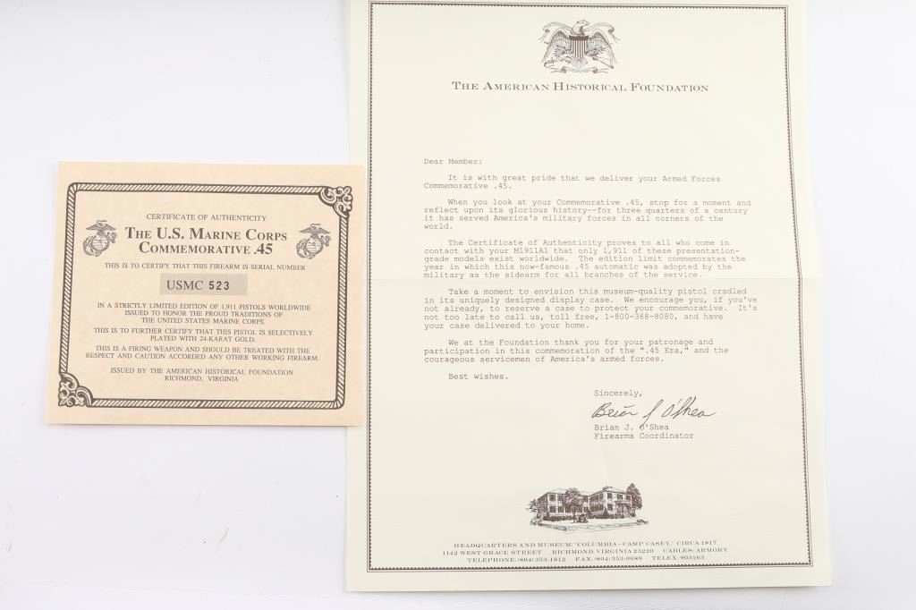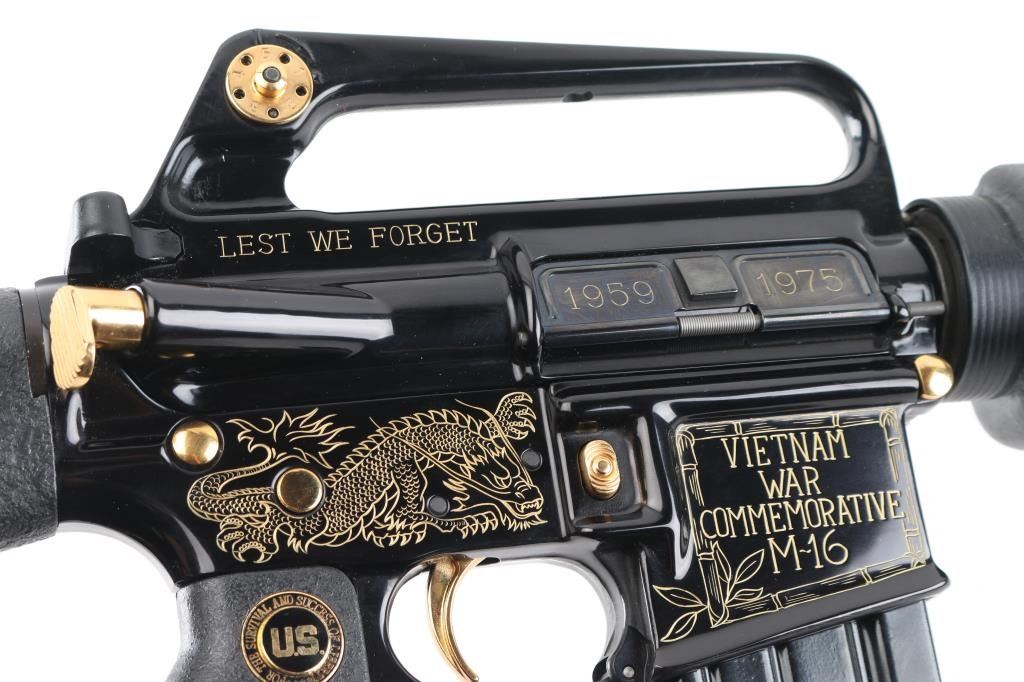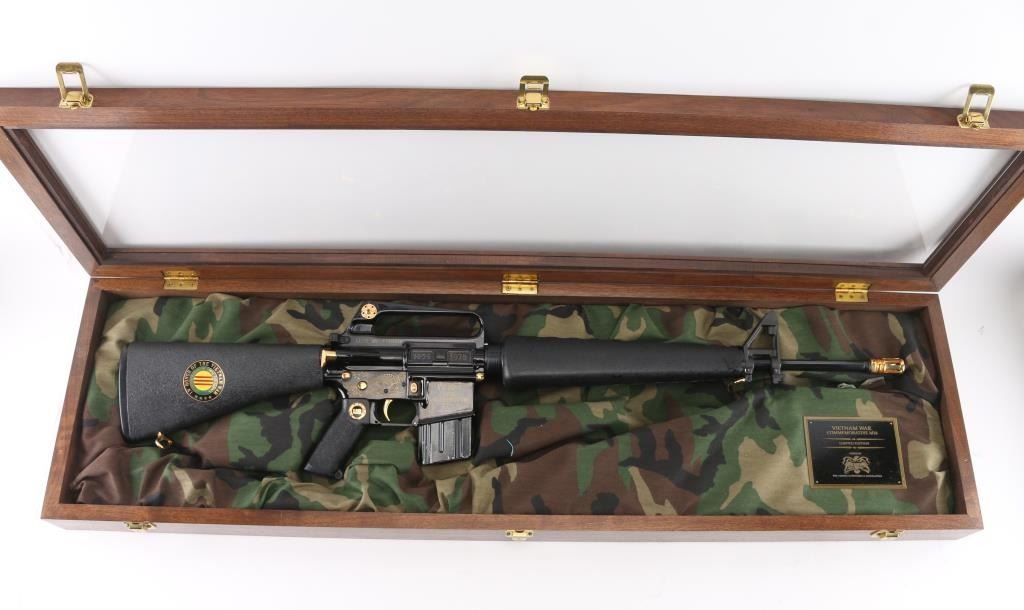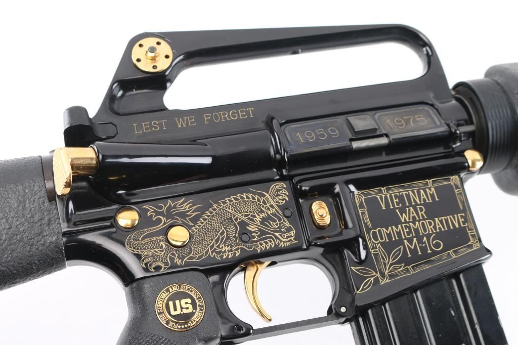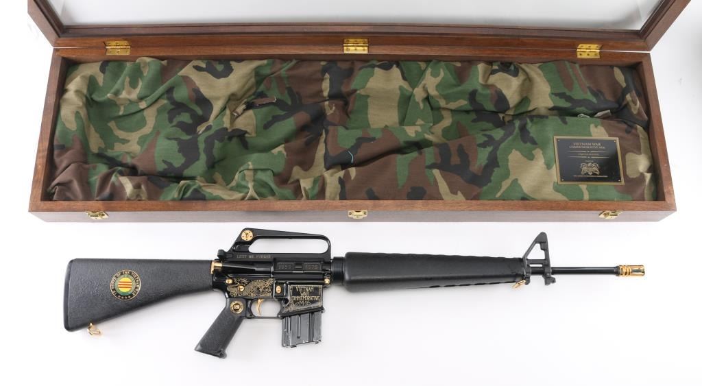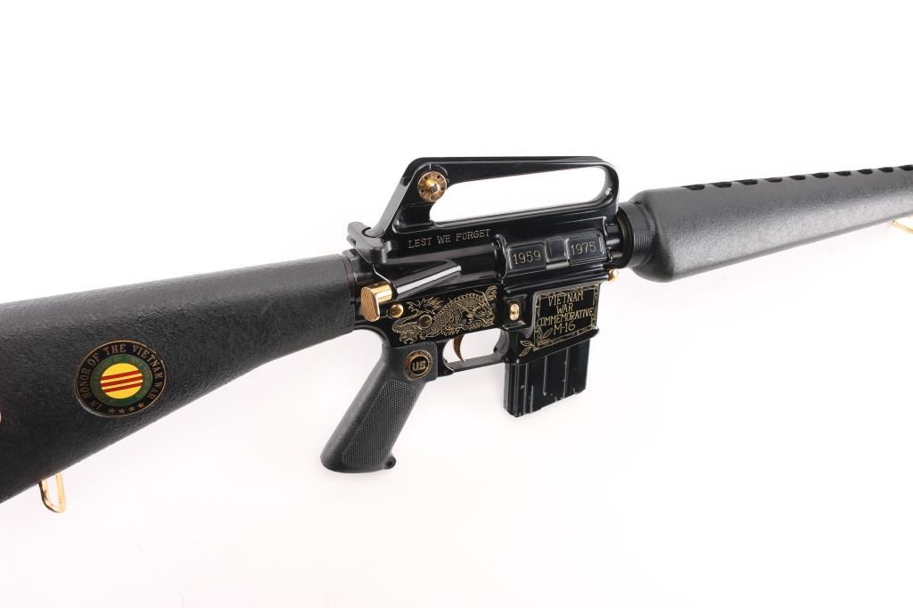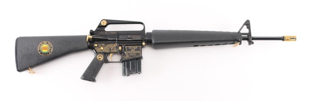 SN: V07991 Bushmaster Firearms Inc. Vietnam War Commemorative M-16 (Model CAR-AR) Semi-Automatic Rifle, .223 caliber, 21-inch barrel with standard military sights. Glossy blue finish with gilt trigger, safety, flash, sling swivels, forward assist, and magazine release catch. Black composite stock, pistol grip and fore-end. Machine engraved and gilt accented dragon on the right side of the receiver. Lest We Forget machine-engraved on the top right rail, 1959-1975 on the ejection port cover, and Vietnam / War / Commemorative / M-16 machine-engraved on the right magazine housing. Butt stock inlayed with commemorative medallion; pistol grip likewise inlayed with small commemorative medallion. Housed in the fitted wooden case of issue, with hinged picture frame lid and camouflage background. Original tags as issued from the American Historical Foundation. Condition: Excellent. Appears unfired, 20-rd magazine is scuffed.