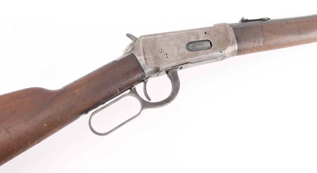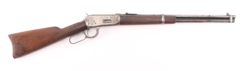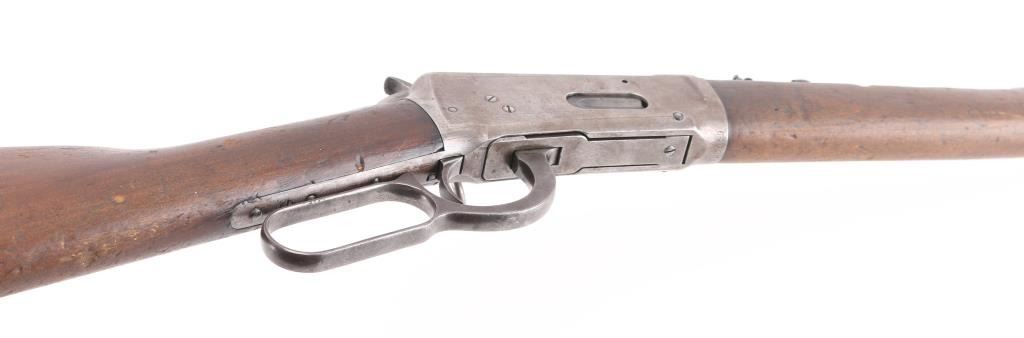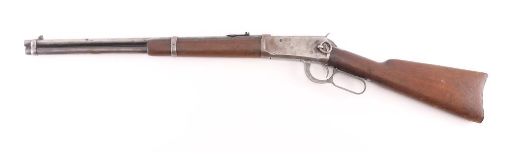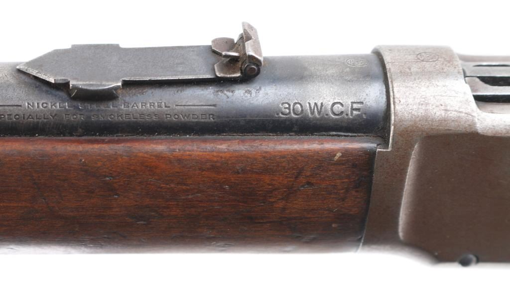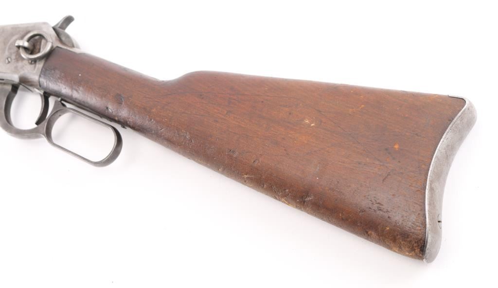 "Saddle Ring Carbine (SRC)' Vintage lever action rifle manufactured circa 1912. Features 20" round barrel, two bands, pinned blade front sight, "V" notch rear sight with two folding leaves, ( One leaf is broken) saddle ring on left side of receiver, smooth walnut forend and straight wristed shoulder stock, crescent steel buttplate. Bore is fair condition, frosted and lightly pitted ,continuous rifling is strong. Metal is mostly bare metal, blue on mag tube, scattered small brown spots, slightly rough texture throughout. Forend is fair condition, sanded, visible cracks, darker stained color in dents and gouges. Shoulder stock is fair, same condition. Markings are good, readable. Action is smooth. Condition is NRA Good