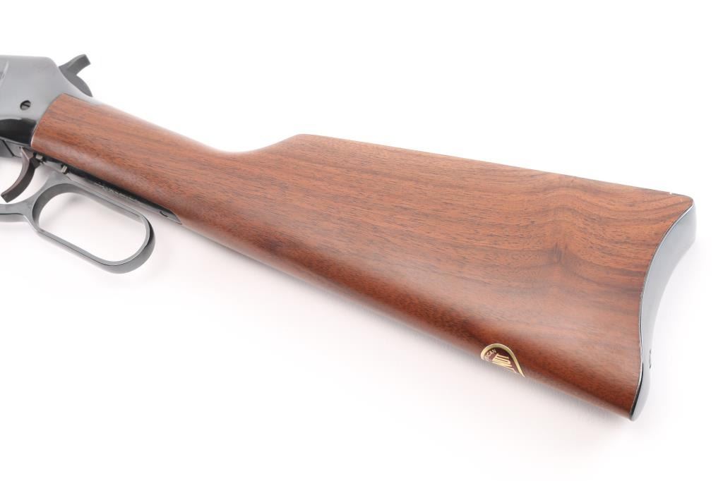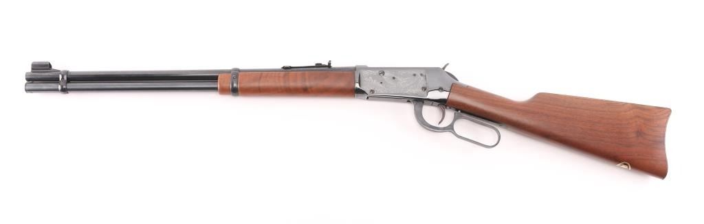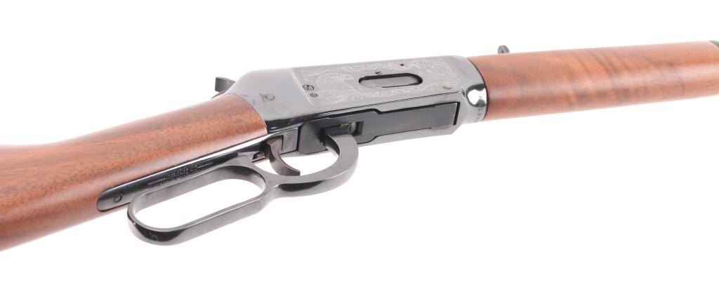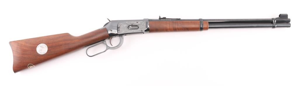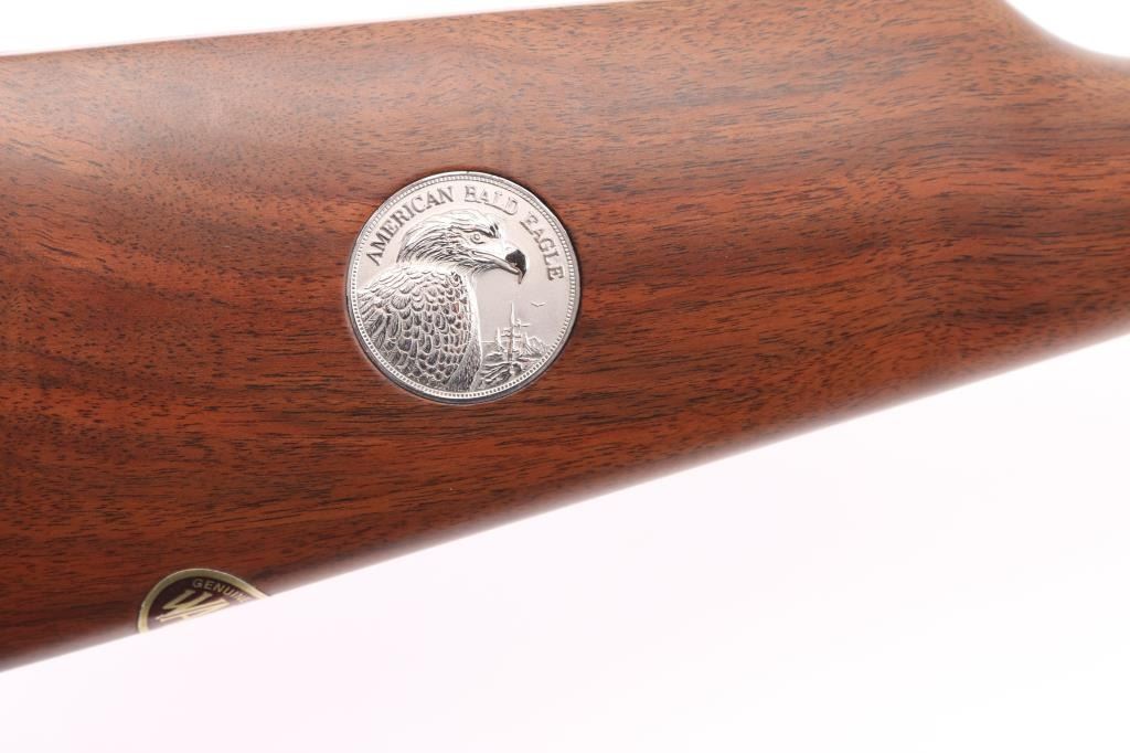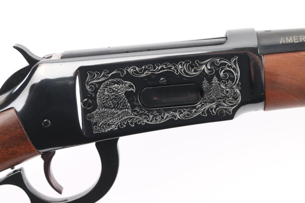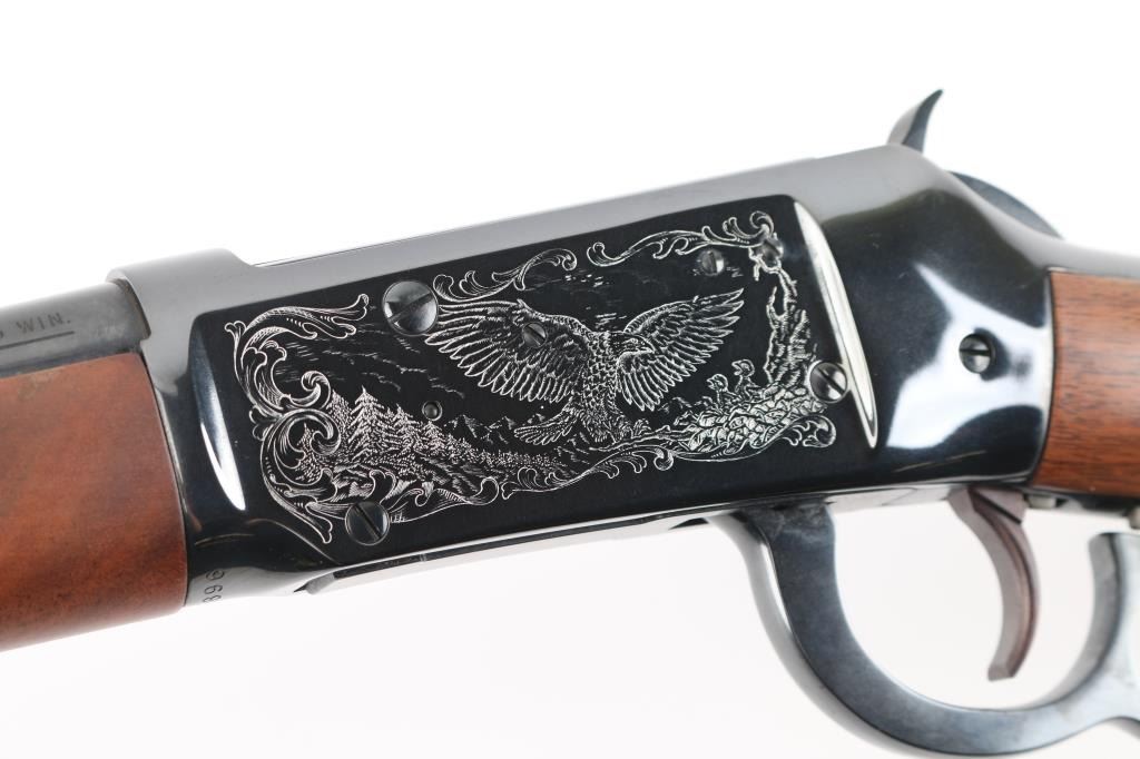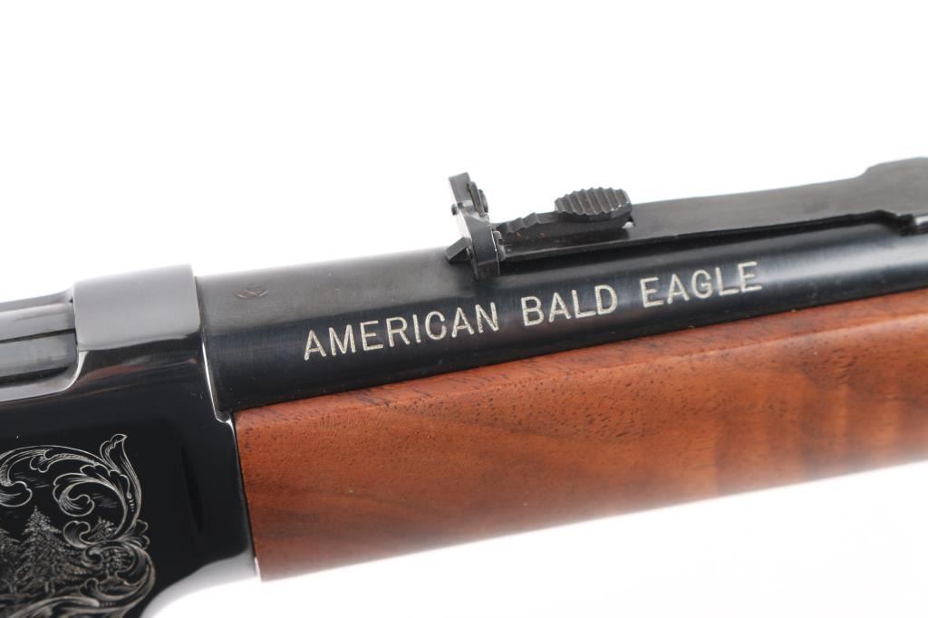 SN: ABE896. 375 Winchester SN: ABE1118 Silver Edition commemorative lever action rifle celebrating the American Bald Eagle, manufactured with a "Big Bore 94" receiver circa 1982. Reportedly limited to 2800 rifles. Features blued finish, smooth extra fancy walnut stocks with straight wrist, 20" barrel, blade front sight (on ramp, with hood), sporting rear sight, carbine butt with smooth metal buttplate, receiver has thicker reinforced section at the rear. Barrel is engraved "AMERICAN BALD EAGLE" in block letter with silver color inlay. Sides of receiver are engraved with 75% coverage, scenes of bald eagles in flight or in portrait, with pine trees, surrounded by floral scrolls. Silver finish coin in buttstock continues the motif. Bore is excellent/bright. Wood is excellent with fiddle grain, contrasting dark and lighter colors, some burl in the forend. Action is crisp/tight, Blue finish is 100% Condition is near NRA Perfect, Like New. Modern Firearm.