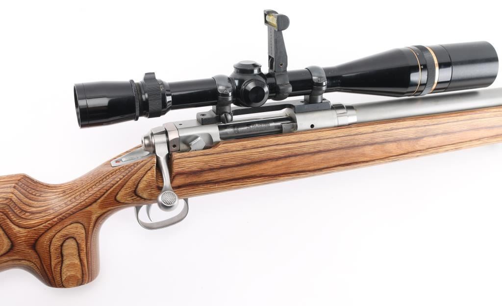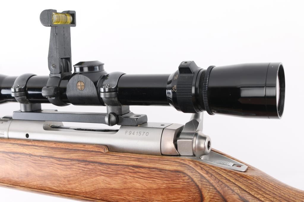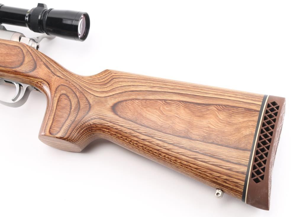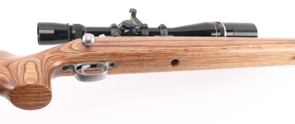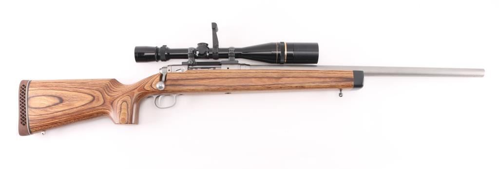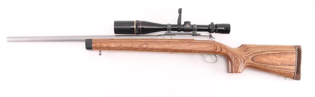 American made bolt action sporting rifle chambered in 204 Ruger. Features a stainless steel finish, 24" heavy barrel, no provisions for sights, this model 12 has been re-barreled in .204, sliding safety on the rear of the receiver, polished bolt, internal box magazine, and stripped wood pistol grip shoulder stock with ventilated rubber recoil pad, and contrasting black forearm cap. . Rifle exhibits approximately 98% of it's original finish showing some minor rust spots on the left rear of the barrel. Action is smooth, bore is excellent, and the stock is excellent. Mounted with a Leupold Vari-X III 6.5x20 scope with sun shade and prism. Clear Optics. Great varmint rifle. NRA Condition-Very Good+. Modern Firearm.