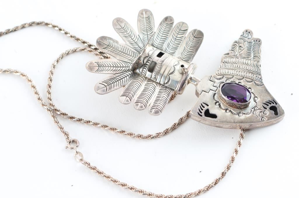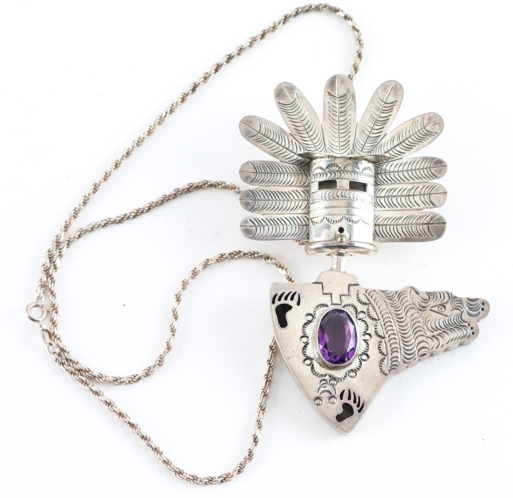 with Kachina dancer headdress accented with a faceted oval amethyst stone with bear head and paw prints. Maker marked "C3" Sterling measures 3.5"x2" on sterling rope chain.