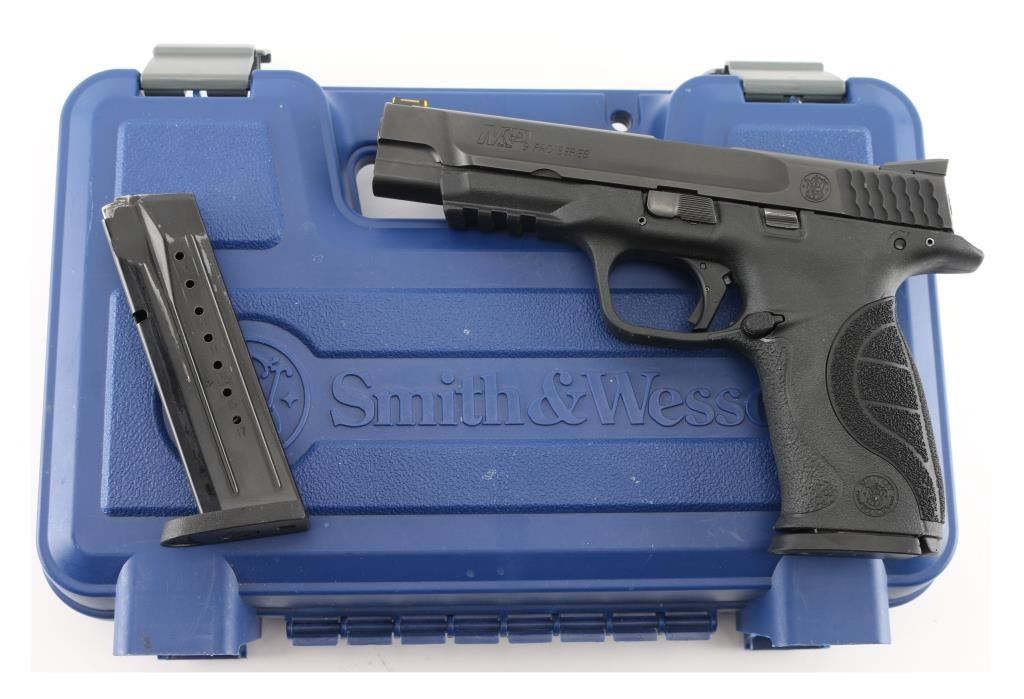 "Pro Series" - American made full-size pistol, DA, high-strength polymer frame reinforced with a rigid stainless steel chassis, black Melonite finish, 68 HRc, approximately 7 7/8" slide, approximately 5" barrel, bore is bright, yellow fiber optic front sight, open notch rear sight, rear serrations, no exposed hammer, no thumb safety, interchangeable palmswell grip inserts, 17-round magazine. Includes the original plastic case, instruction manual, two interchangeable palmswell grip inserts (four total) extra 17-round magazine and a cable lock with two keys. **NRA Near Perfect** Modern Firearm