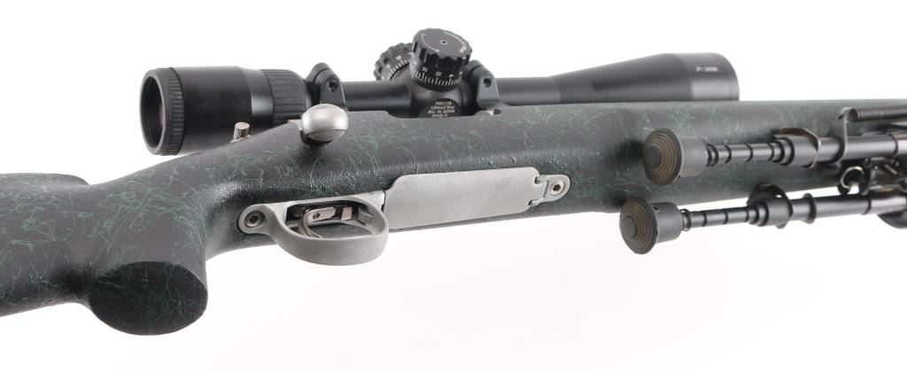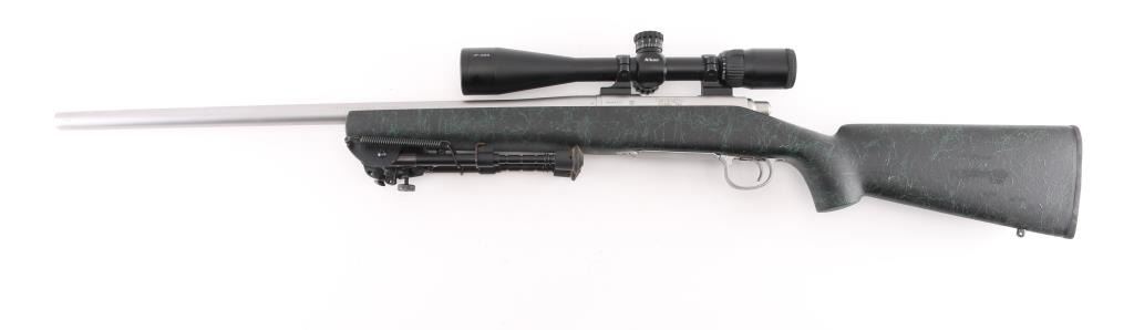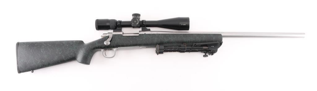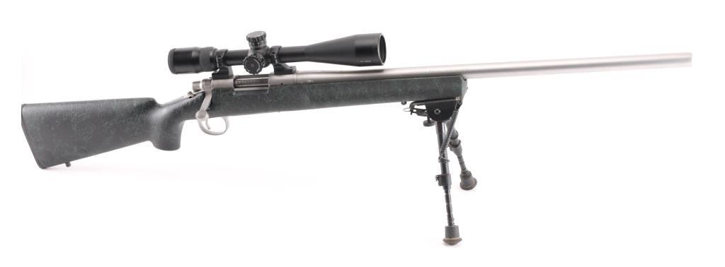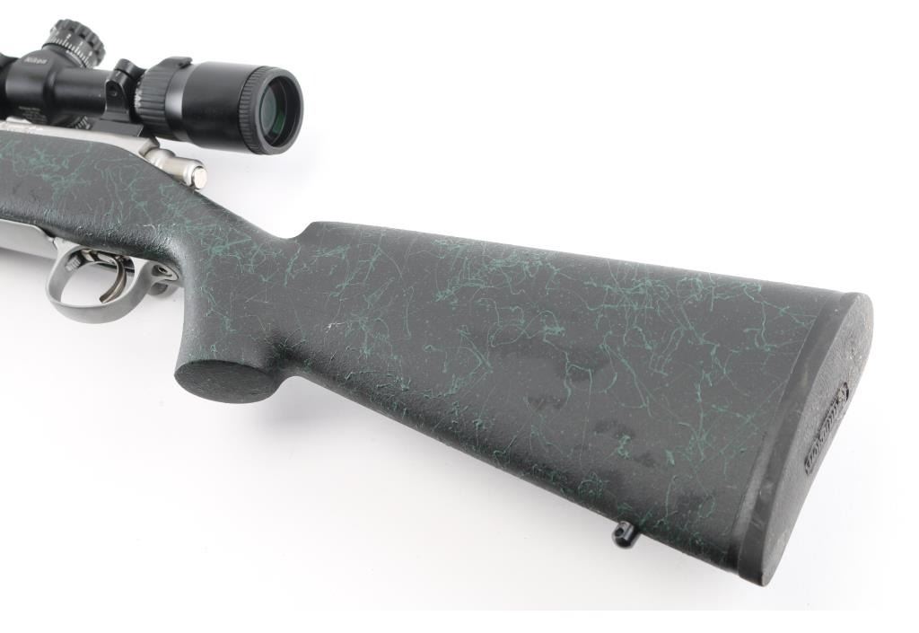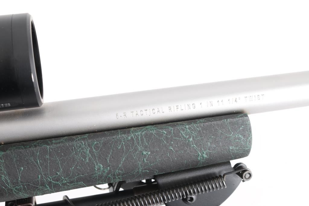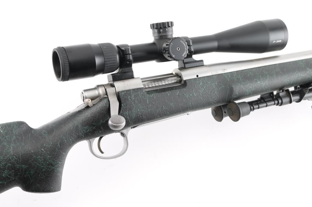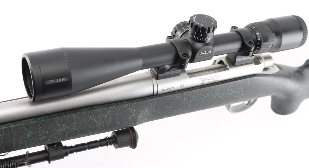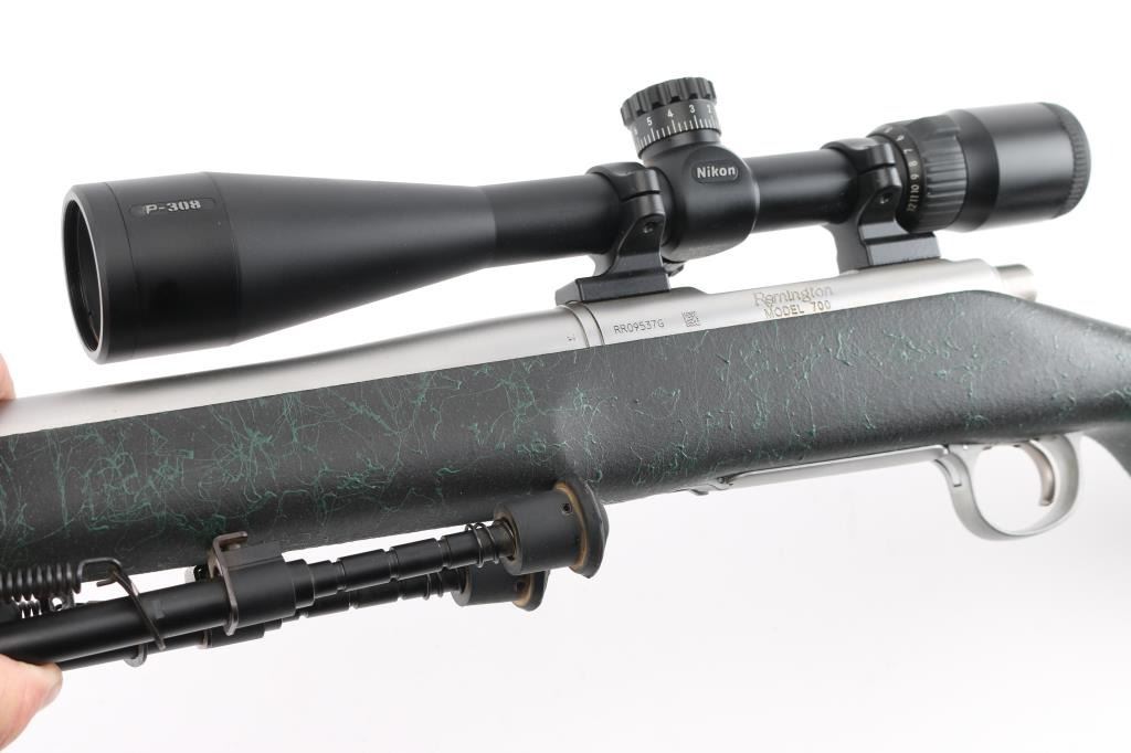 American made rifle, bolt action, approximately 24" heavy barrel, 5-R tactical rifling, bore is bright, no mechanical sights, stainless steel barrel and receiver with a satin finish,checkered bolt handle knob, jeweled bolt, four-round magazine, hinged magazine floorplate, smooth trigger, textured black and green synthetic stock, black rubber Remington recoil pad, Nikon P-308 4-12X scope, scope is clear and bright, bipod. Rifle exhibits nearly all of its original finish showing very little wear. Condition is near NRA Perfect Modern Firearm