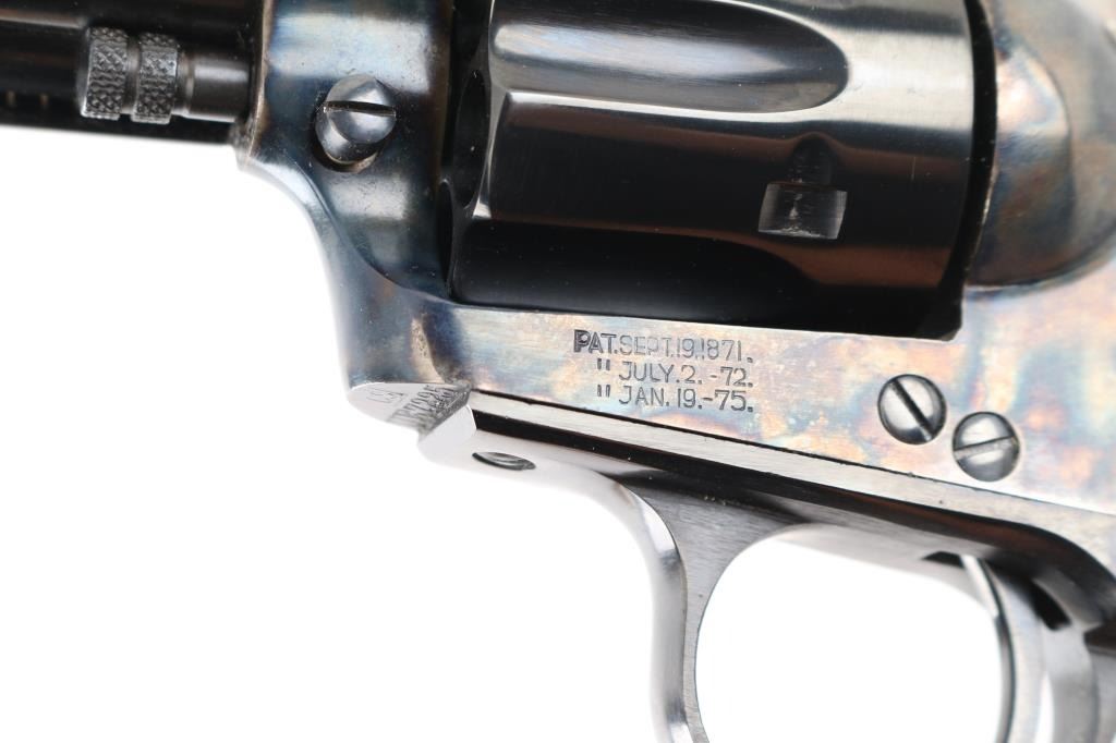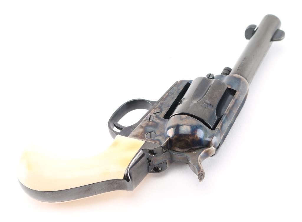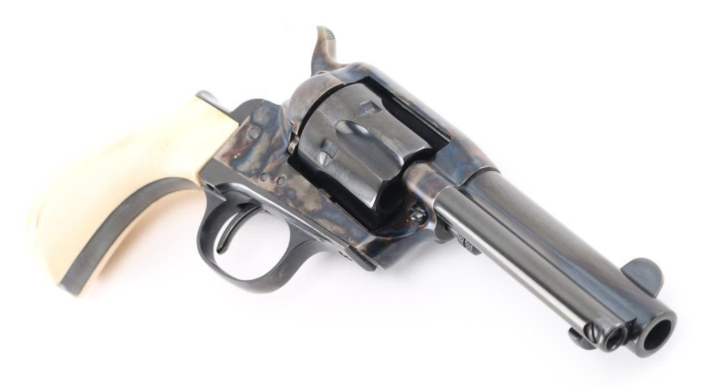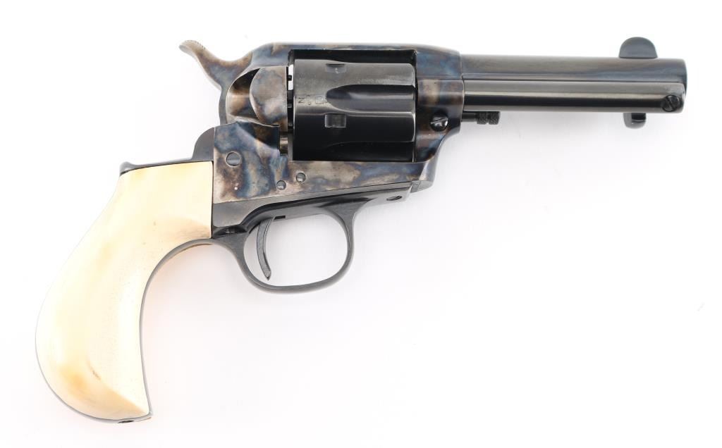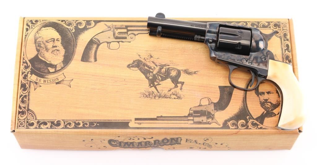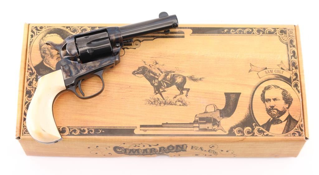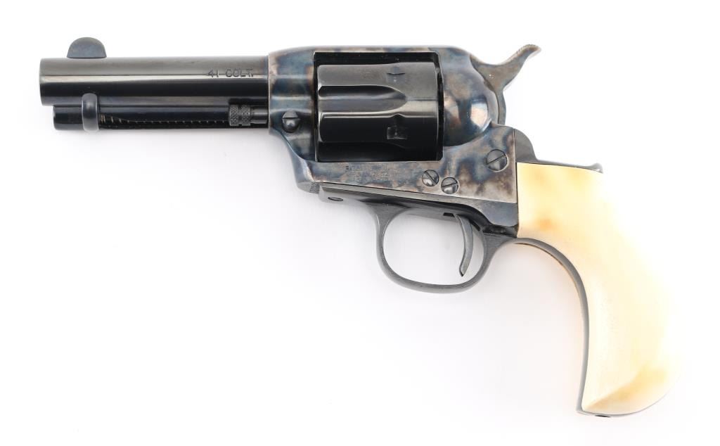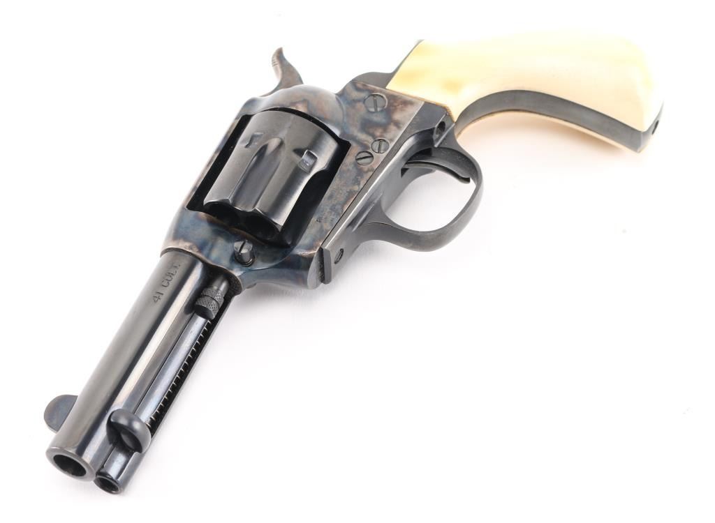 Five shot single action revolver modeled after the Colt 1877 and chambered in .41 Colt. Manufactured in Italy circa 2017 by Uberti and imported by Cimarron of Fredericksburg, TX with barrel address style import markings. Features a blued and case hardened finish, 3.5” round barrel, fixed blade front sight, square notched rear sight, fluted five-shot cylinder, smooth thin trigger, knurled hammer spur, frame mounted firing pin, and birds head grip frame with faux ivory grips. Revolver retains approximately 99%+ of its original finish showing only a few superficial handling marks with no major wear observed. Action is sound, the bore is excellent and the faux ivory grip is excellent. Includes the original factory cardboard box with literature. Condition is near NRA Perfect ***Modern Firearm***