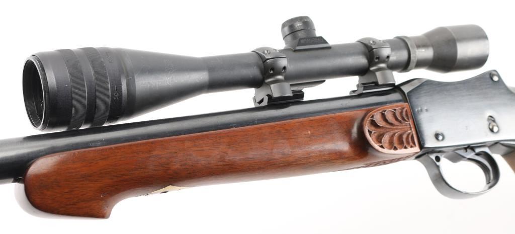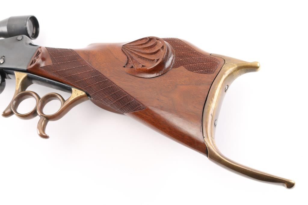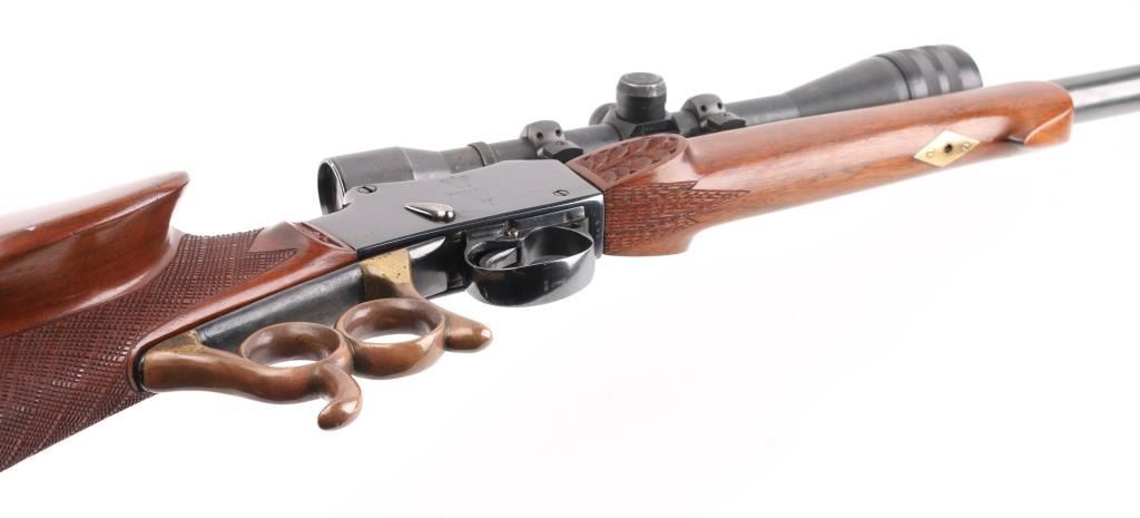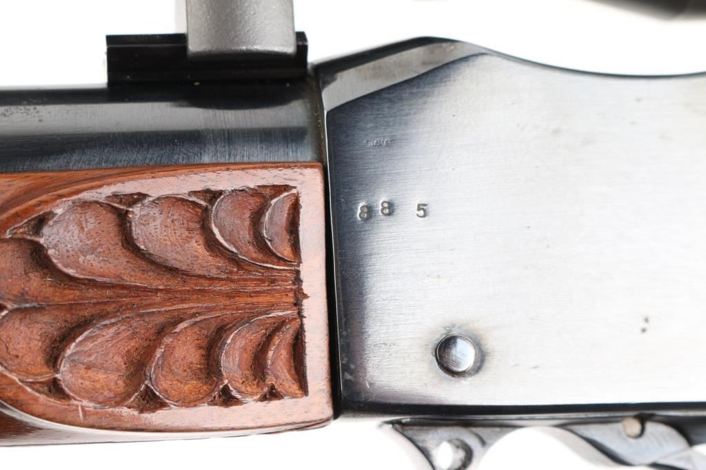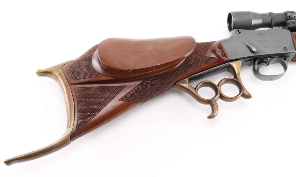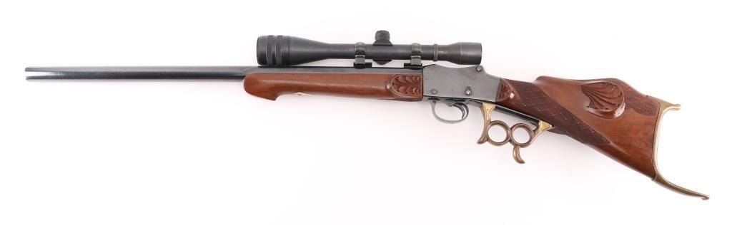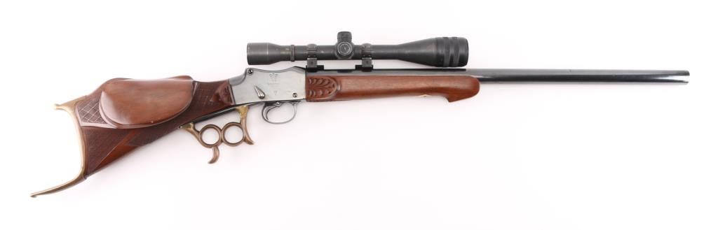 This is custom 'Schuetzen' target rifle built on a 1886 dated receiver. It has been re-barreled with a heavy, round 26" bull barrel chambered in .225 Win. Falling block action retained with a large custom brass two-ring lever. Cocking lever on left receiver. Large brass 'Schuetzen' style butt plate, hand carved stock and forearm, checkering on the wrist and comb, large right mounted cheek piece for left handed shooting. Mounted with a vintage Weaver KT-10 scope, clear optics. Bore is excellent/bright. Wood is near excellent with some minor wear on the cheek piece, and minor rubs. Action is smooth, blue finish is very good with minor muzzle wear and scratches. A beautiful rifle, someone spent a lot of money on this restoration. NRA Condition-Excellent as restored. Antique Firearm.