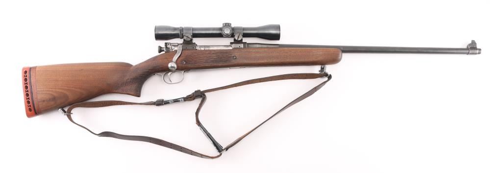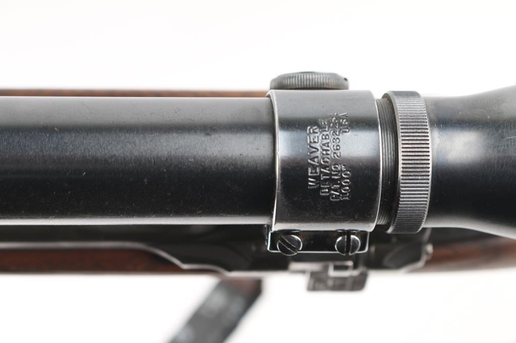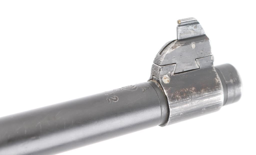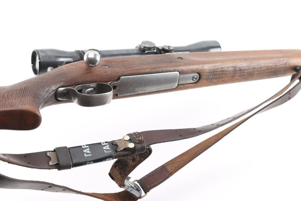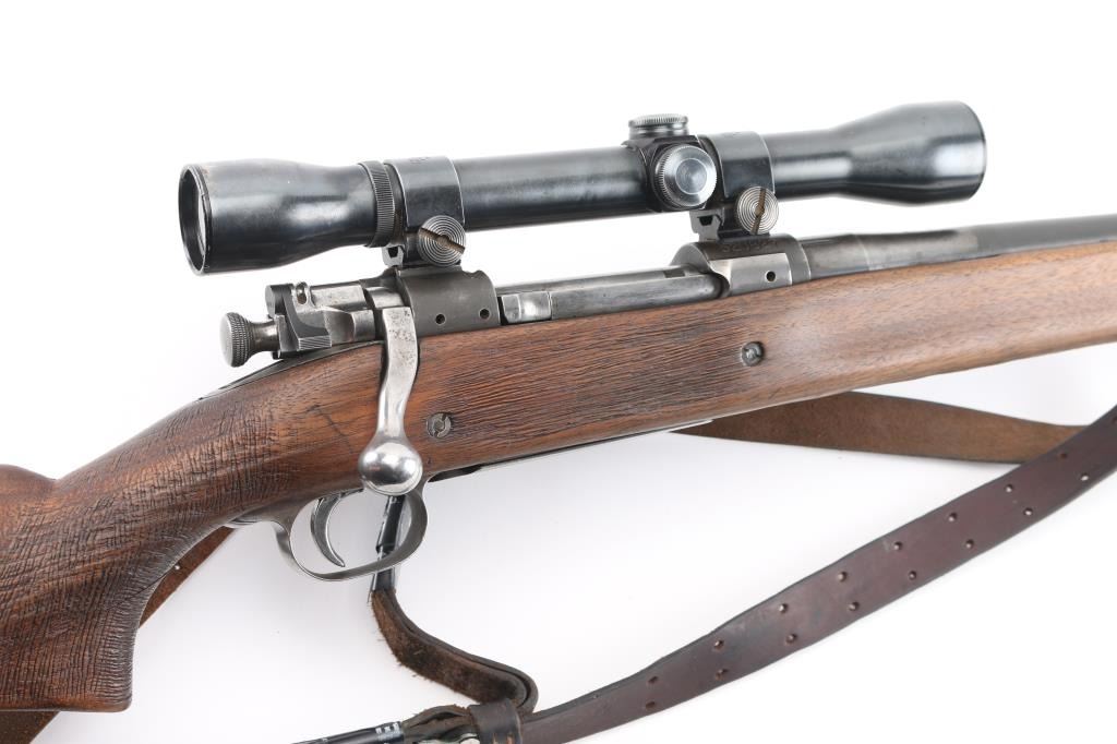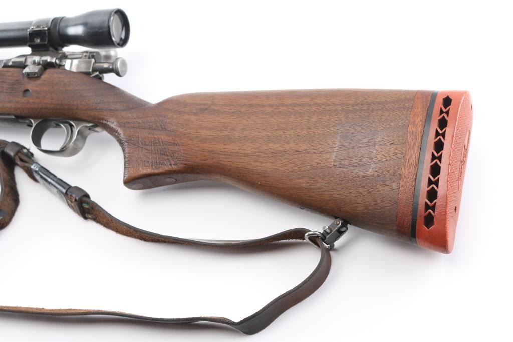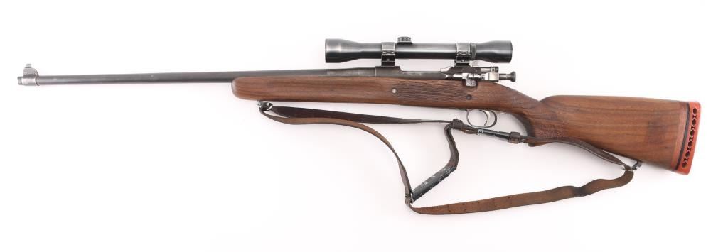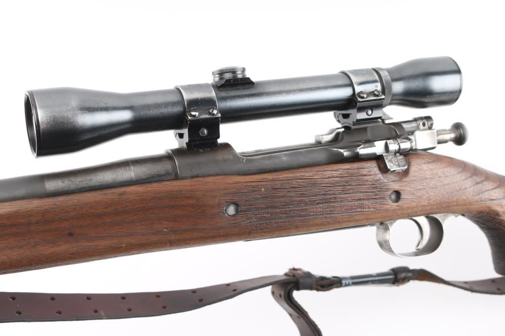 Sporterized US Military bolt action rifle features 24" barrel, barrel marked "SA 3-42" with flaming bomb, original front sight, receiver drilled & tapped for Weaver two piece scope base, bent bolt, low swing manual safety, blued finish, pistol grip wood modified/shortened original stock, ventilated rubber recoil pad with wood spacer added, grip, and underside of of forearm have a rough texture applied for better grip. Mounted with a vintage unmarked scope with Weaver rings, clear optics. . Bore is ok, with light areas of pitting, rifling present, needs cleaned. Metal surfaces retain 60% bluing with edge losses, handling marks, handling loss on bottom metal. Wood is good condition/sound.. Includes leather sling. NRA Condition-Near Good. C&R Firearm.