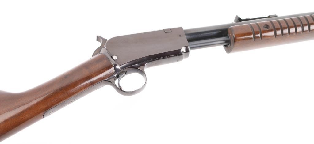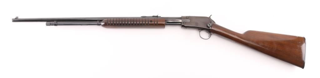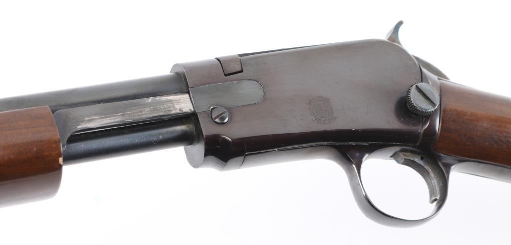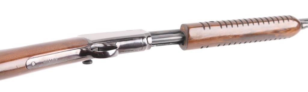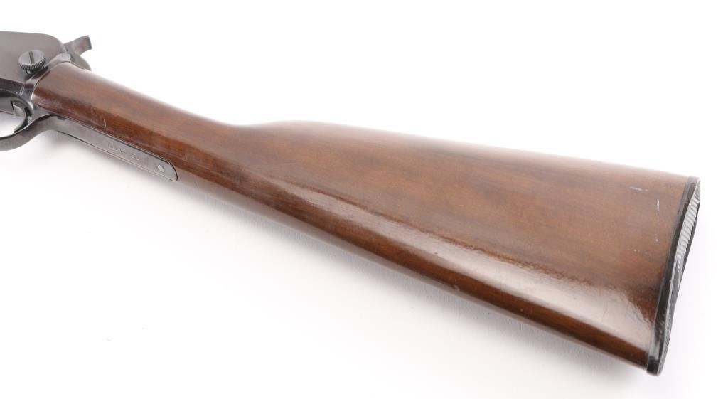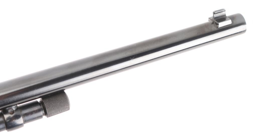 Brazilian made pump action carbine imported by Garcia Sporting Arms, Wash. DC. Features 23" barrel, buckhorn style sights, take down screw at receiver, tube magazine under barrel. Bore is excellent/bright. Retains 90% blued finish, some minor rubs, edge wear and friction loss on action bar/tube. Wood is very good condition, some minor scratches/rubs with light oil type finish. Condition is NRA Very Good. Modern Firearm.