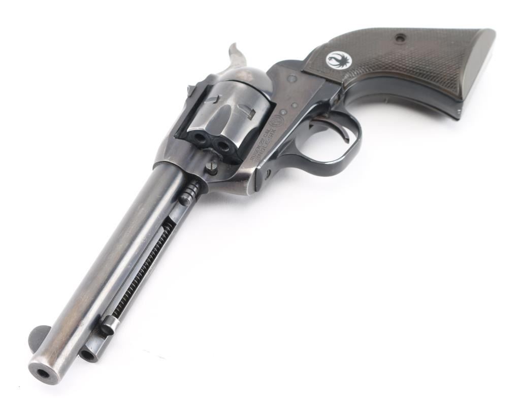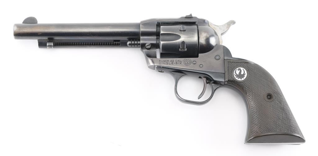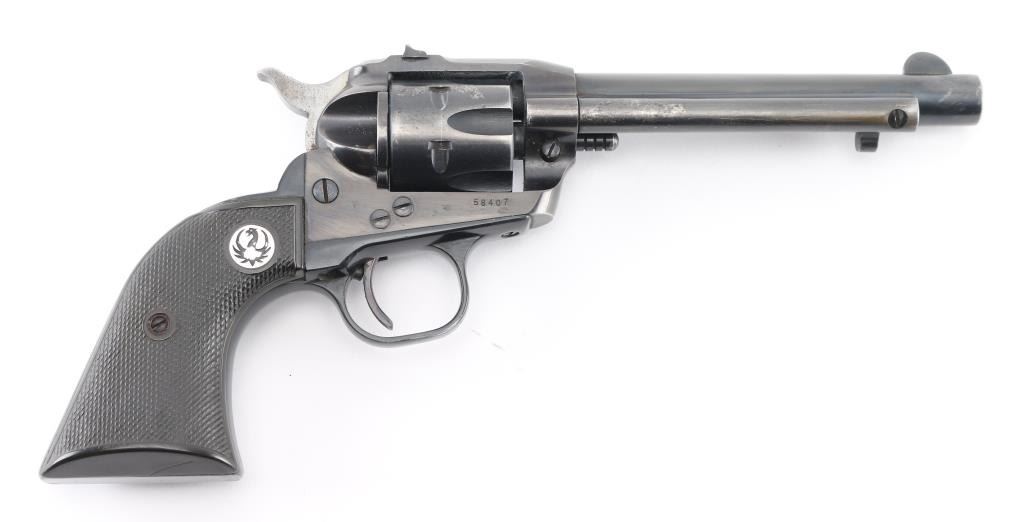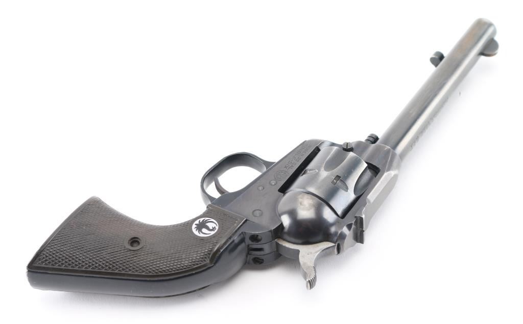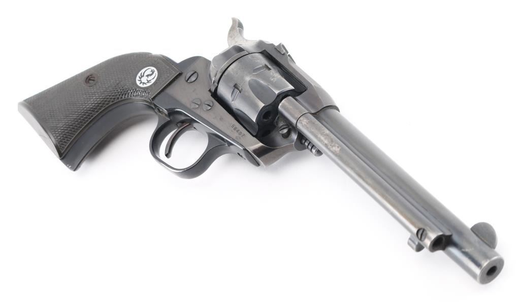Old Model three screw American made six shot revolver chambered for .22lr. It has a 5.5" barrel, blade front sight, manufactured in 1957,dovetailed notch rear sight, fluted cylinder,falt loading gate, smooth trigger, serrated hammer spur, and synthetic grips with Ruger medallions. It has a lot of loss to the blued finish. Grips are worn. Bore looks dirty. Revolver retains approx 70% of its original finish showing holster wear and small amount of oxidation light surface rust. Bore is very good and synthic grips are good with some wear. Condition is NRA Good. *C&R*