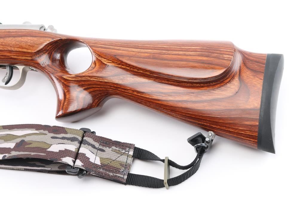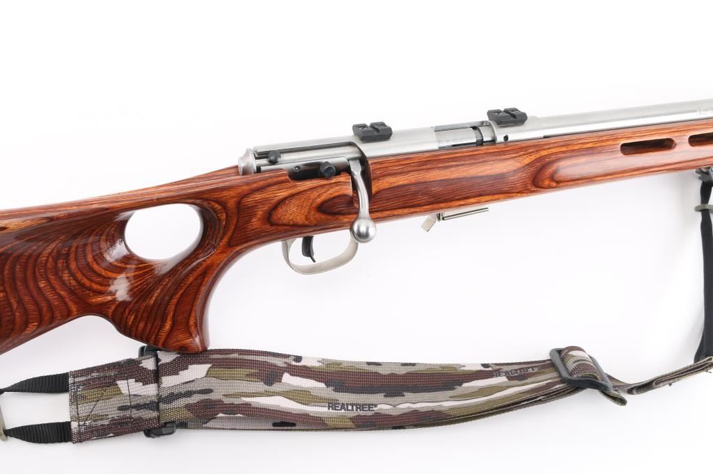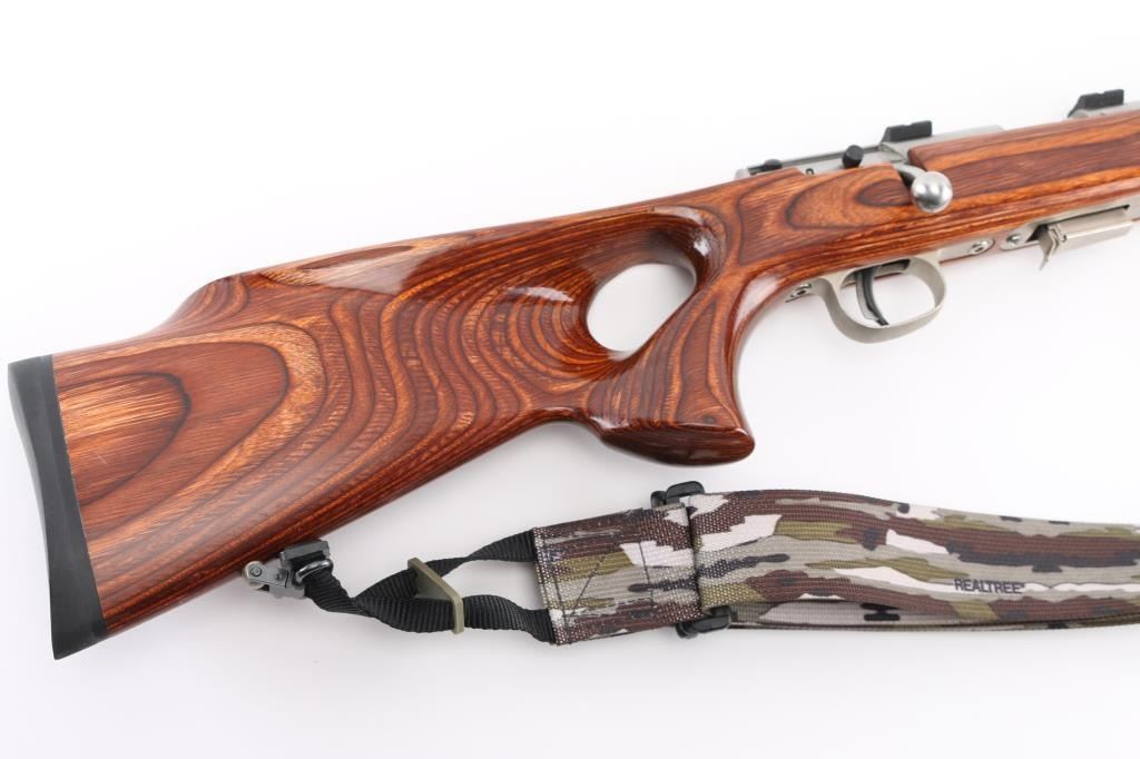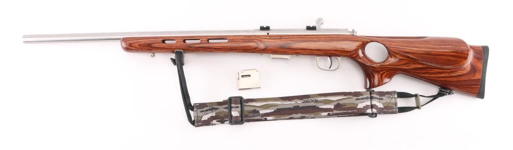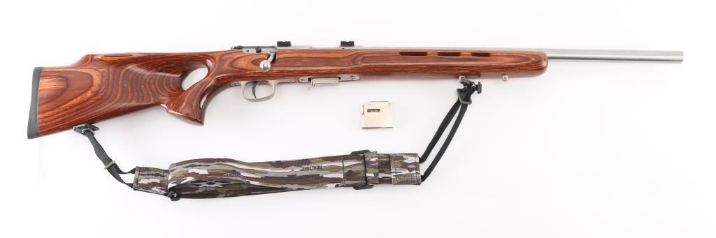 Magazine fed bolt-action. 5-Round magazine. Striped wood laminated thumbhole stock , with black rubber recoil pad. Stainless steel , 21" bull barrel. No sights. Scope bases on the receiver. Thumb safety, on the right, rear receiver. Bore appears excellent/bright. Action is smooth/tight. Stainless finish is Excellent. Same for the wood, excellent condition. Realtree camo sling attached. Comes with two 5-rd magazines. Rifle is in almost new condition. Great varmint rifle. NRA Condition-Excellent. Modern Firearm.