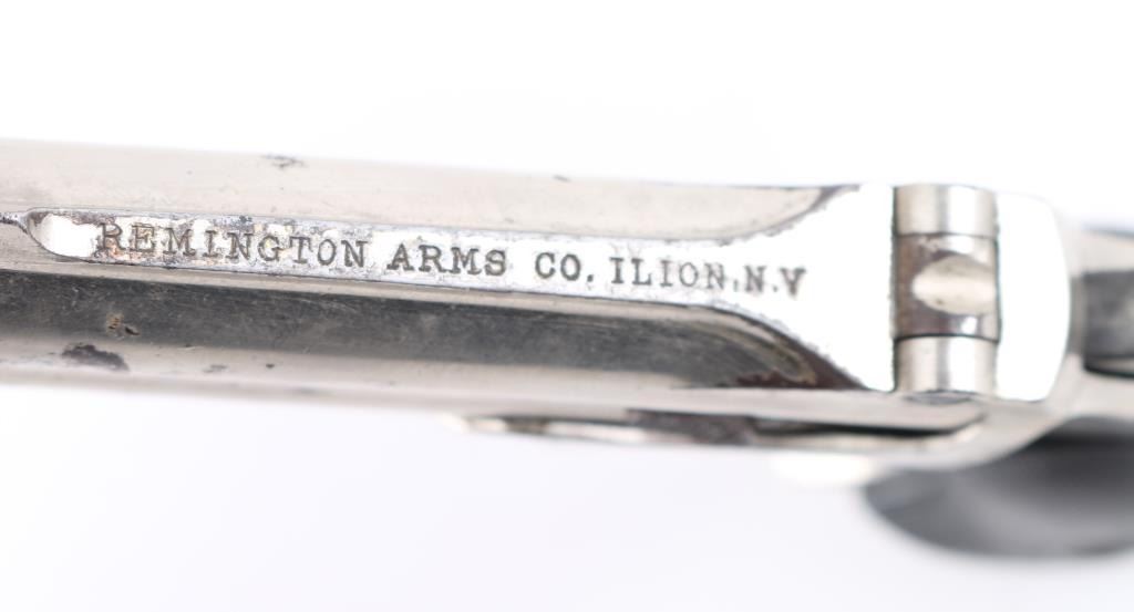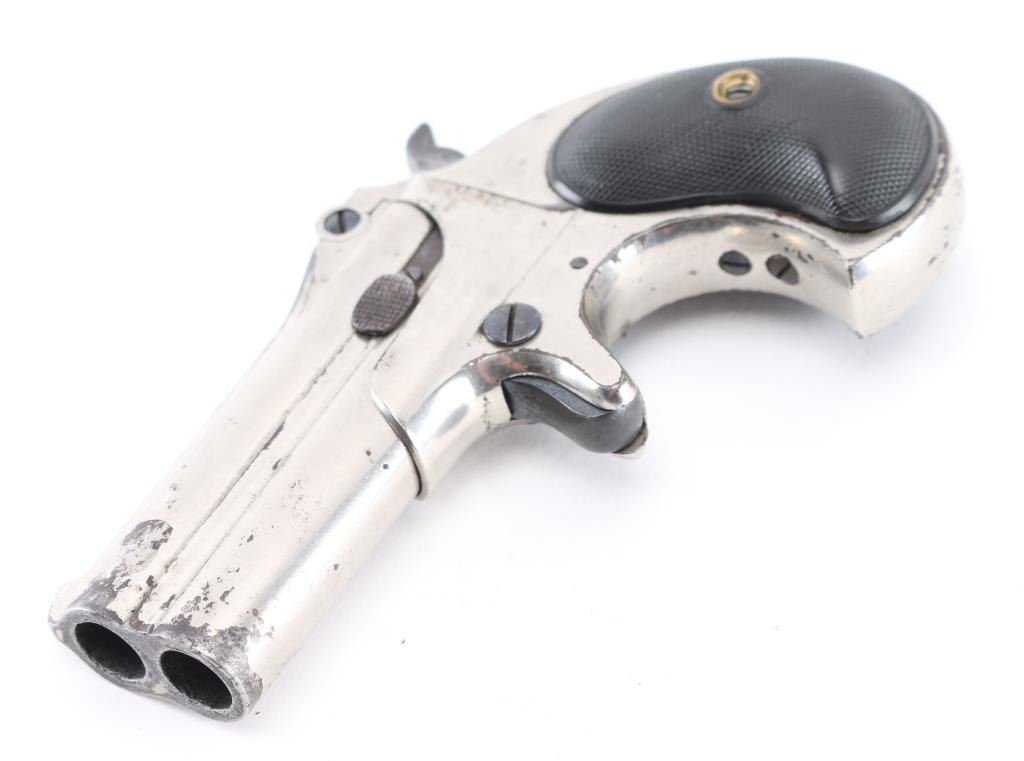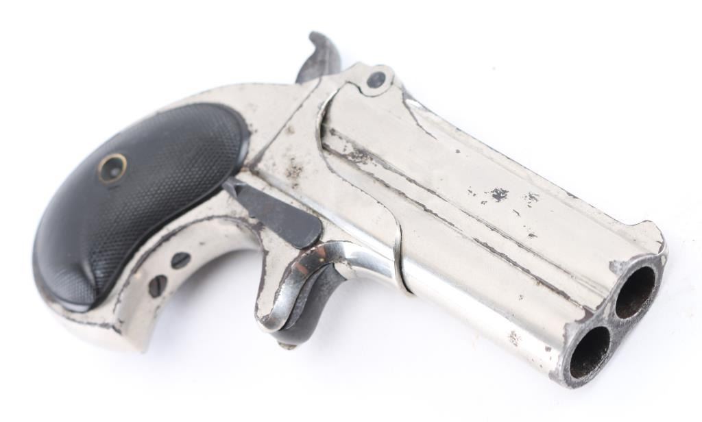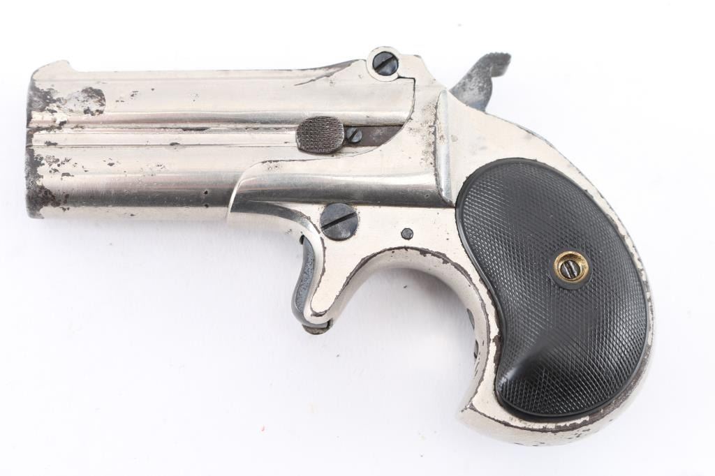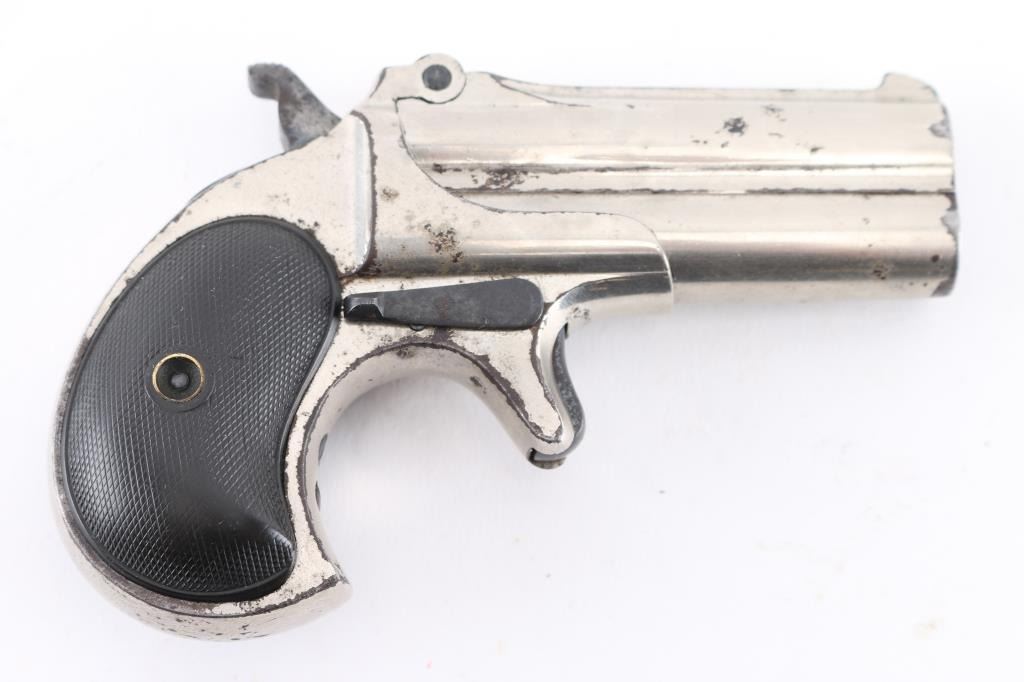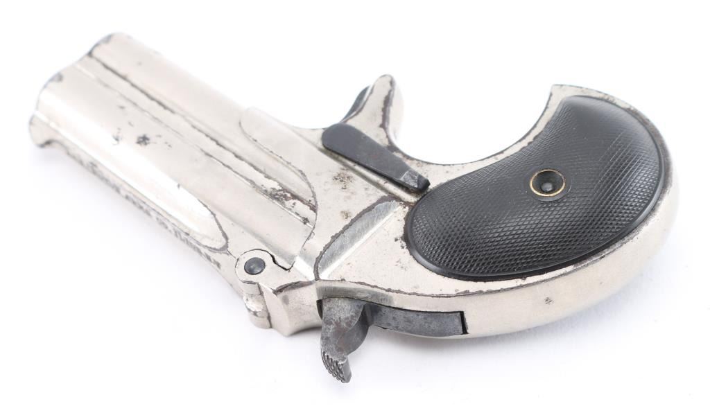 Vintage over/under double barrel derringer chambered in .41 Rimfire Short, manufactured circa 1888-1911. Features a nickel plated finish, 3" barrels with solid sighting rib marked "REMINGTON ARMS CO. ILION, N.Y", fixed blade front sight, 'u' notched rear sight, smooth spur trigger, knurled hammer spur, manual extractor, auto-rotating barrel selector, steel frame and two-piece checkered black hard rubber grips. The derringer displays an older cloudy nickel plated finish. Overall approximately 80% plated finish is retained showing losses, dings, some flaking at the muzzle and a small amount of dark rust. Action is sound, the bores are poor with pitting, the markings are good and the grips are very good. NRA Condition-Very Good as Antique Firearm.