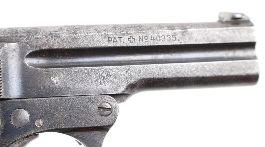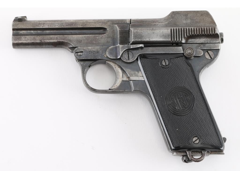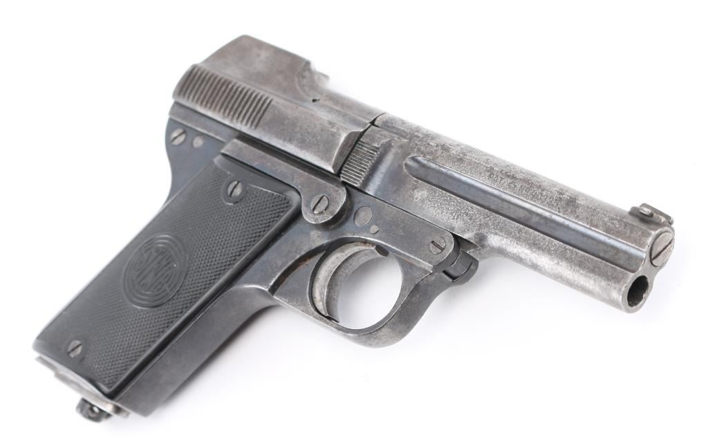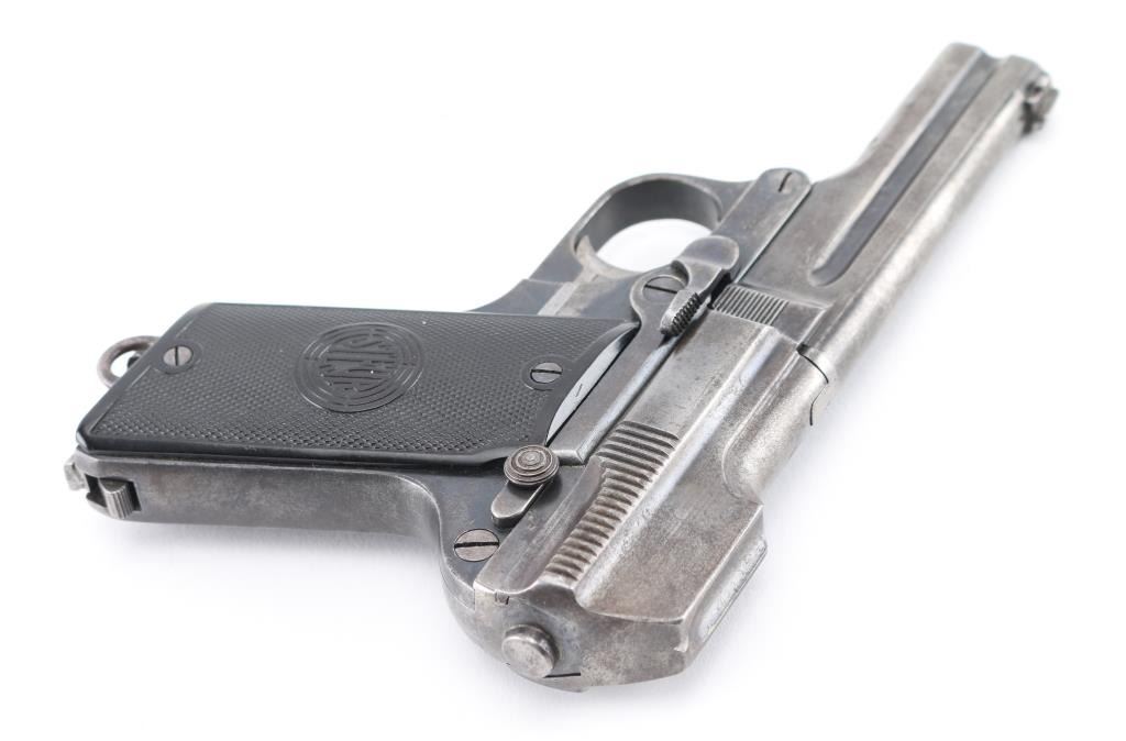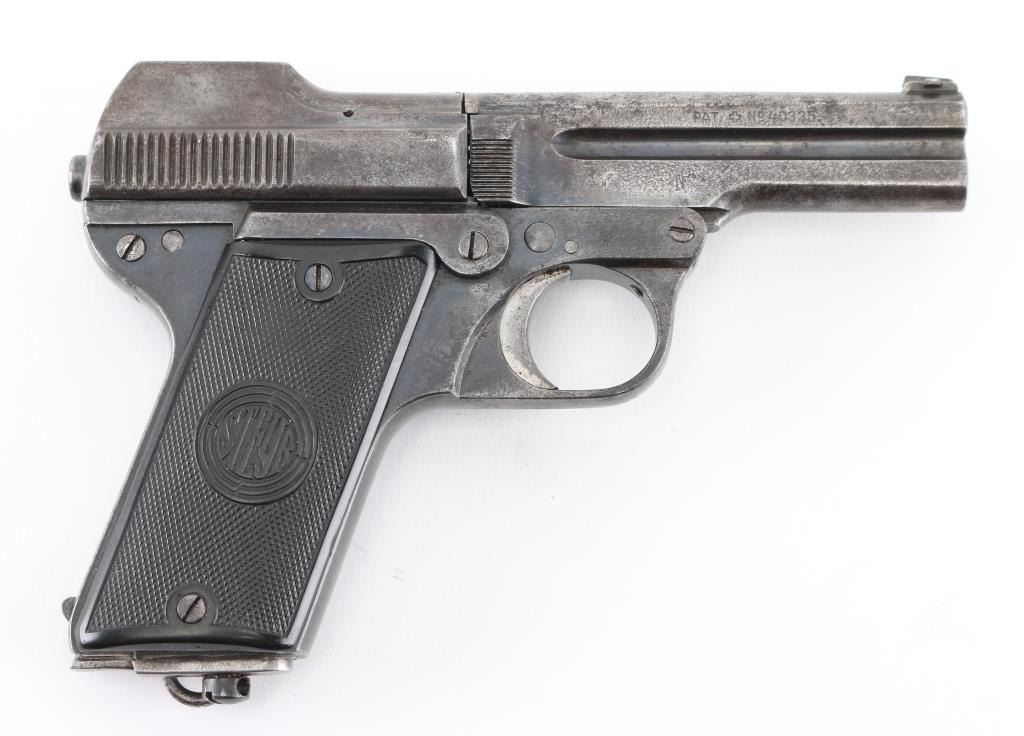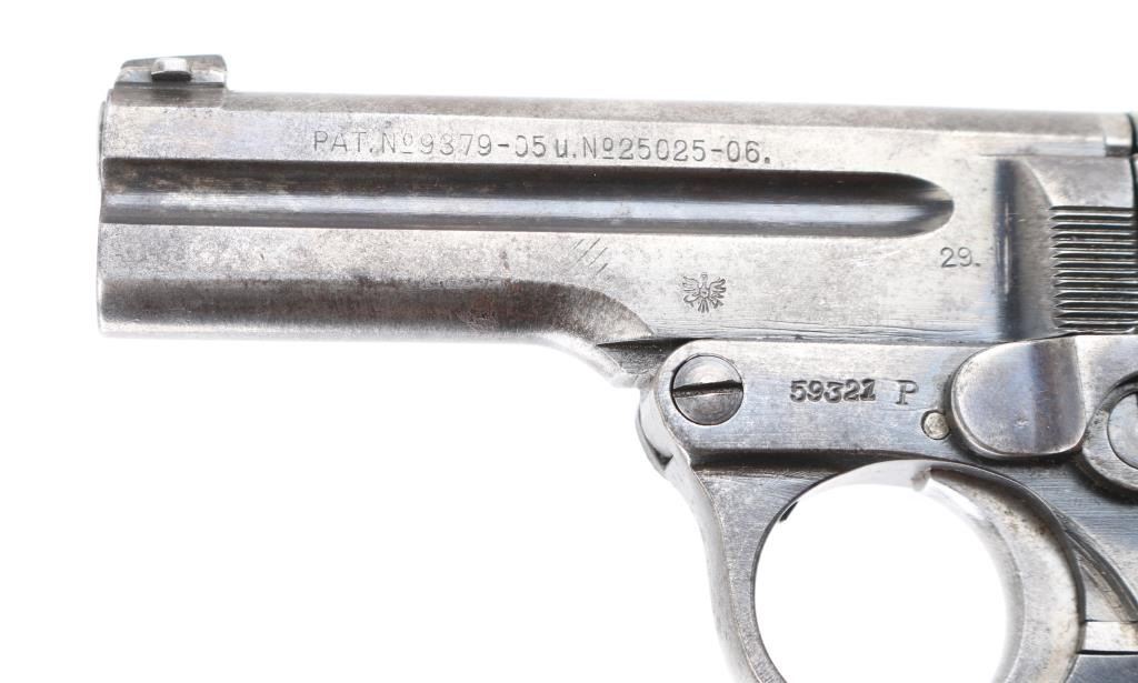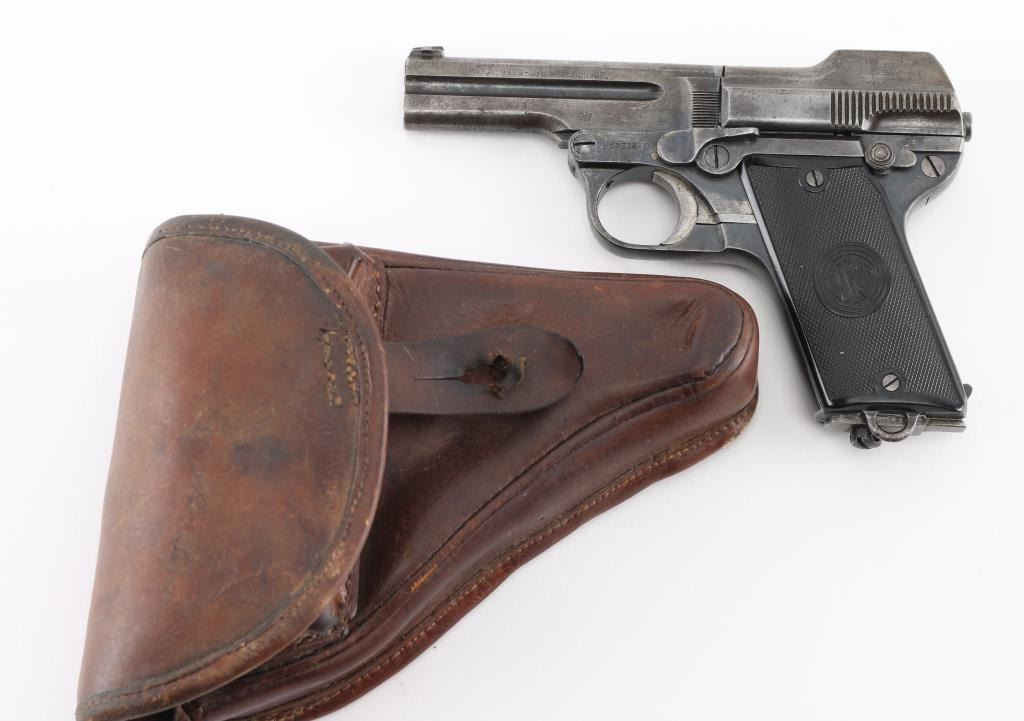 Rare Nazi marked 1908/34 Pistol. This was an unusual blowback pistol with a tip-down barrel. The barrel was retained with a pivoting bolt and it was held by a thumb-latch barrel-locking mechanism. The recoil-spring rod ended in a hook engaging a lug on the slide, disengaging automatically when the breech was raised. Lacks both left, and right side legends. The right side of the barrel is marked with the Nazi "eagle/N" commercial proof, and the Austrian NPV" nitro proof is also found on the right side of the frame.(Feint) The left side of the barrel is dated "29", indicating the pistol was reproofed after the German annexation of Austria in 1938. Bore is fair with strong rifling, scattered light pitting, Late checkered grips with Steyr monograms are very good, blue finish is about 50% with handling wear. Includes a correct Military/Police brown leather holster with a double magazine pouch. Good condition, mag pouch missing the retaining stud. NRA Condition-Good. C&R Firearm